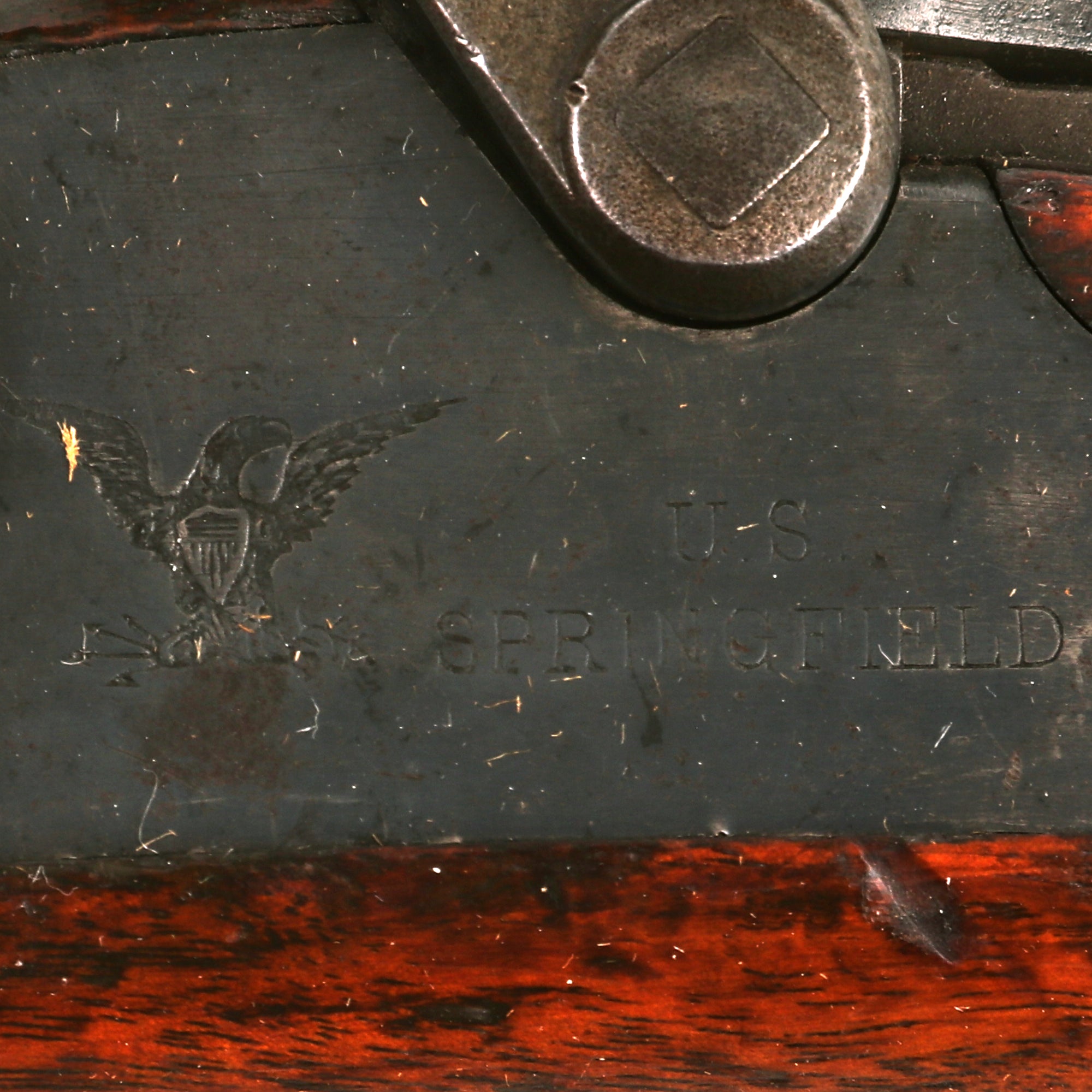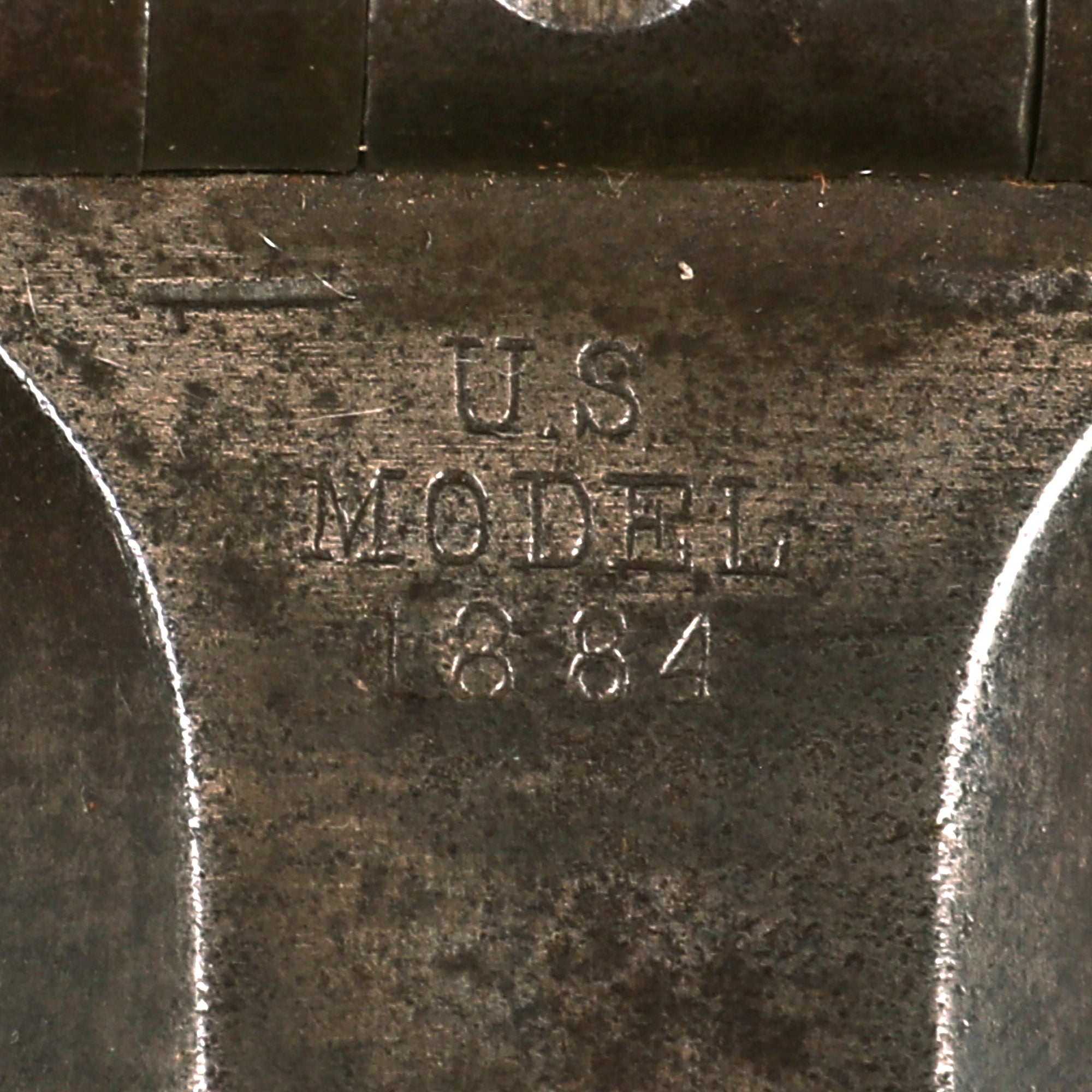 The elegant script SWP belongs to Samuel W. Porter, who was the Master Armorer and Chief Inspector of Springfield Armory from 15 September 1879 to 18 June 1894. A stylized P in a circle under the wrist of the stock indicates that the rifle passed all of its overpressure proof testing. Additional marks of interest include inspectors' and proof marks around the breech end of the barrel: a capital A on top; and a V over P over an Eagle's head over another P on the left side just above the stock. The upper right corner of the Buffington sight leaf is marked R to indicate that the sight graduations are for a rifle and not a carbine.