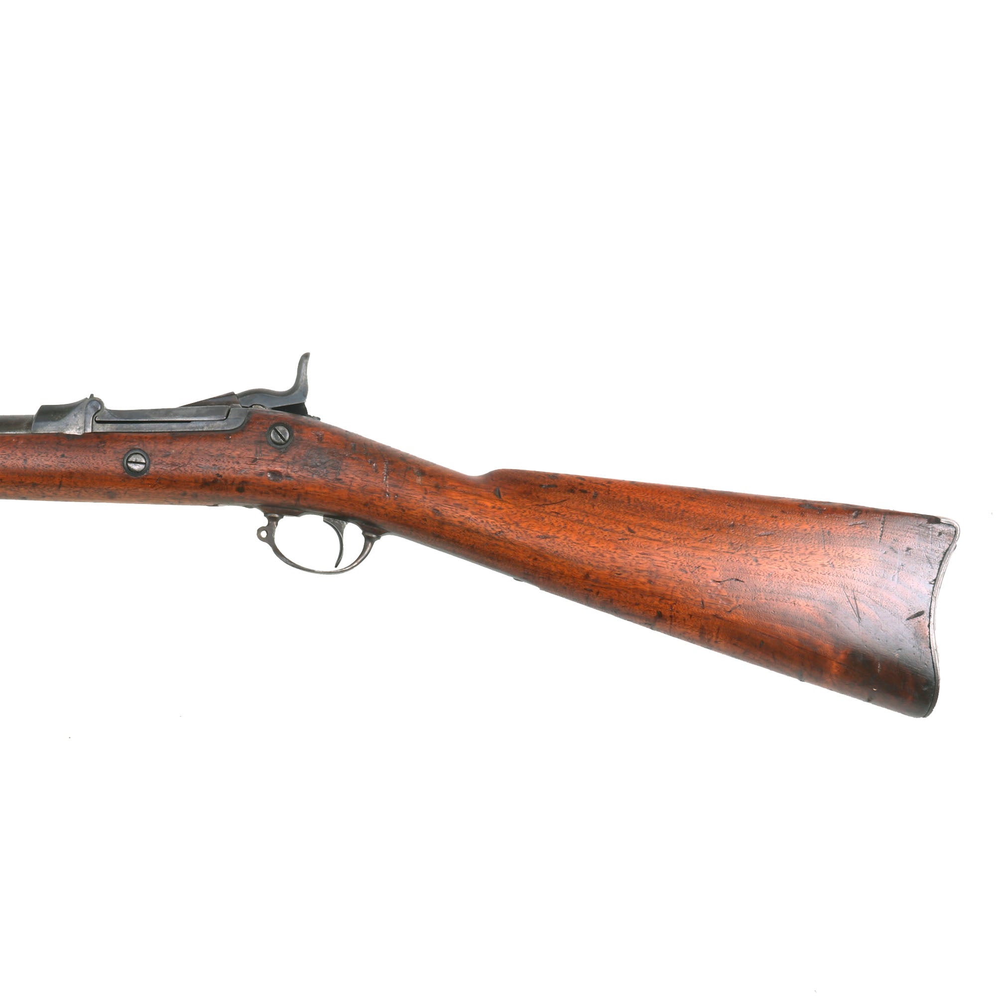 The barrel bands are both U marked, and the butt plate tang is marked with the correct U.S. stamp. Centerfire breechloader, .45 cal., two bands, two sling swivels with stacking swivel, Buffington sight, sliding ramrod bayonet. Lock is marked with an eagle and U.S. / SPRINGFIELD, manufactured at the United States Armory and Arsenal at Springfield, in Springfield, Massachusetts. The lock is fully functional, and the cartridge extractor is present and functional, however we cannot guarantee it will work on actual brass, but this rifle could almost certainly become a shooter. The rear sight is fully intact, with the range easily adjustable.