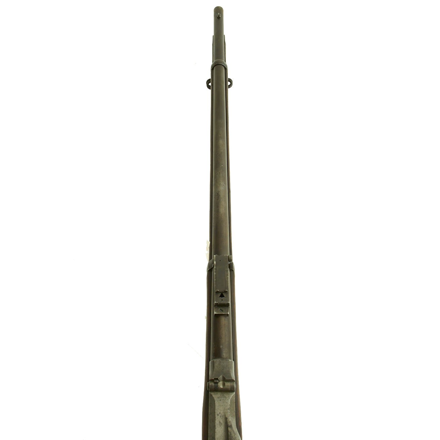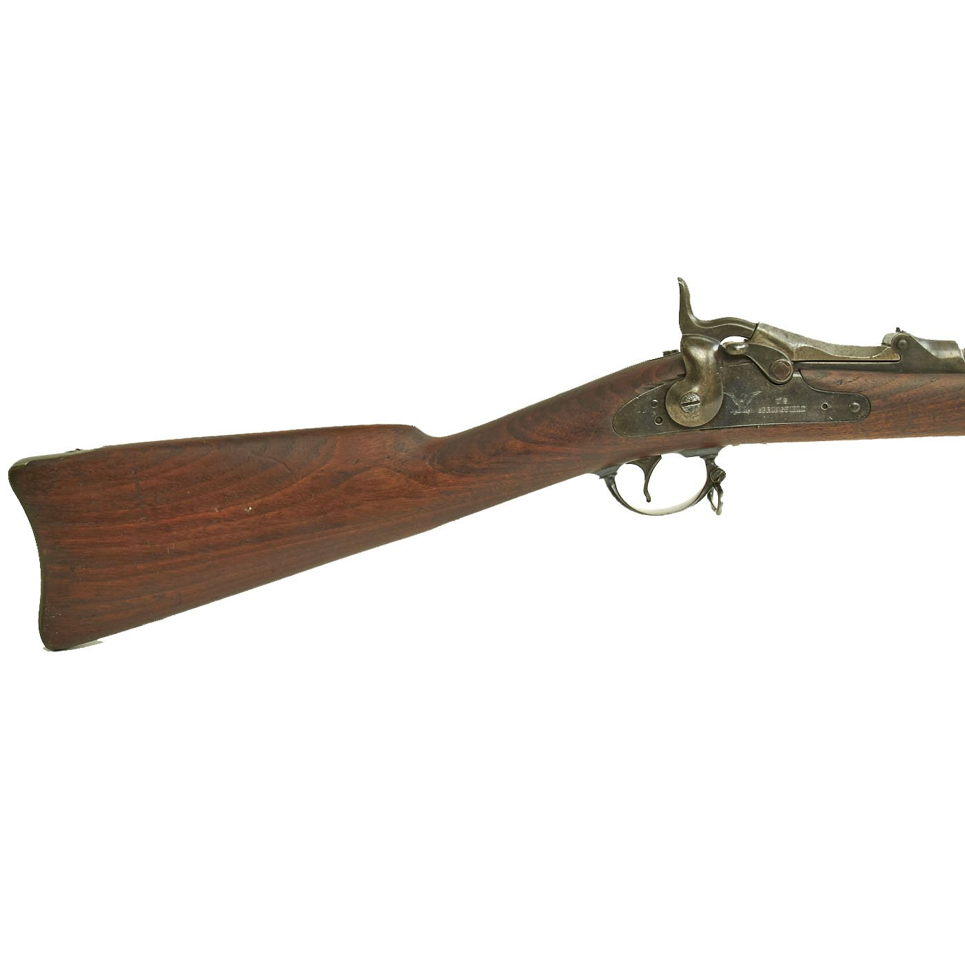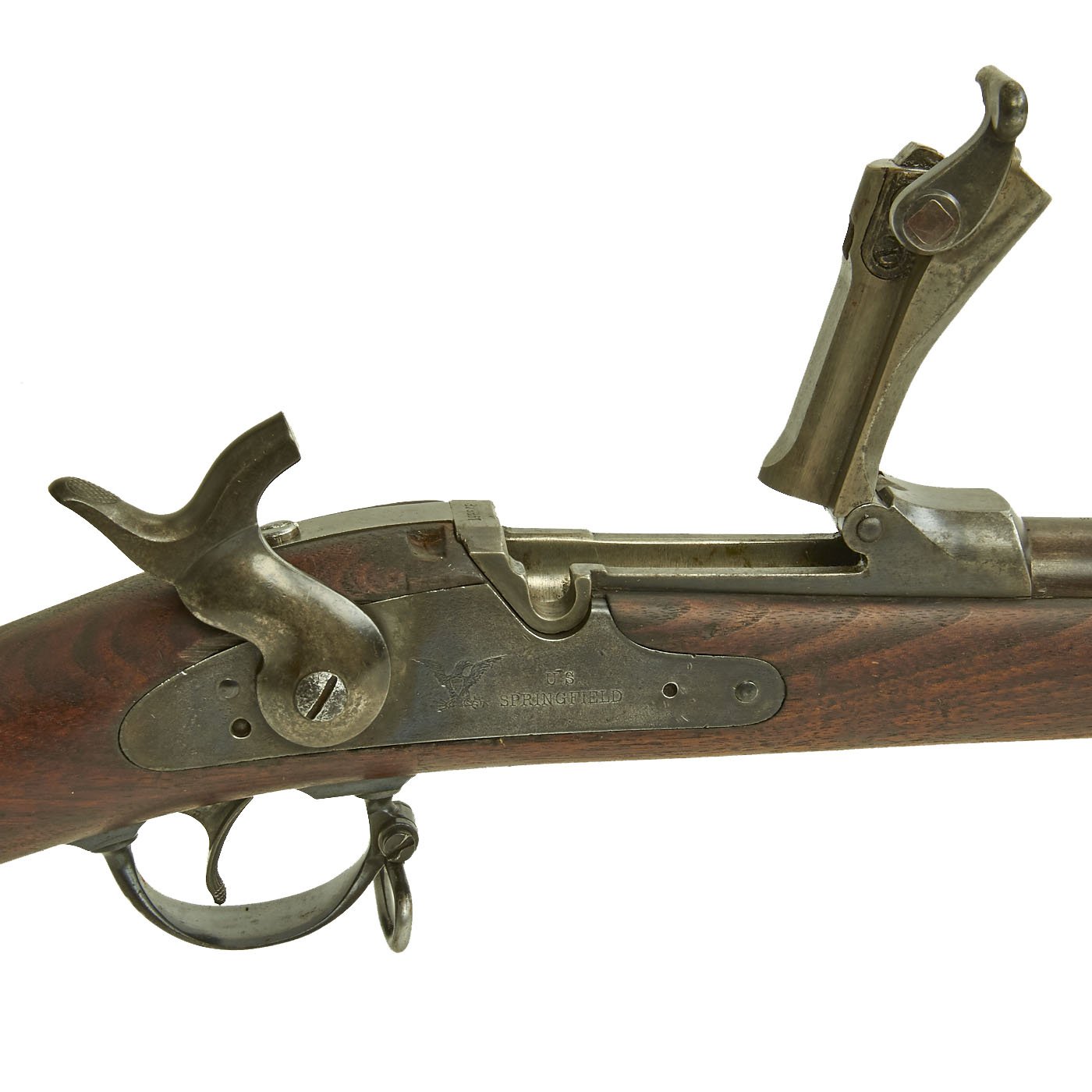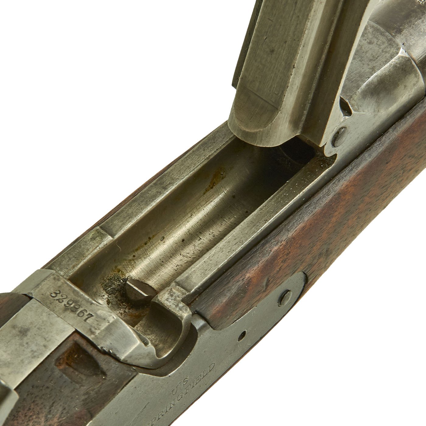 Center fire breechloader, .45 cal., two bands, two sling swivels with stacking swivel, Buffington sight, and standard ramrod. Lock is marked with an eagle and U.S. / SPRINGFIELD, manufactured by Springfield Armory, Springfield Massachusetts. Additional marks of interest include inspectors' and proof marks around the breech end of the barrel: a capital R on the top; and a V over a P over an eagle's head over another P on the left side just above the stock. The upper right corner of the Buffington sight leaf is marked R to indicate that the sight graduations are for a rifle and not a carbine.