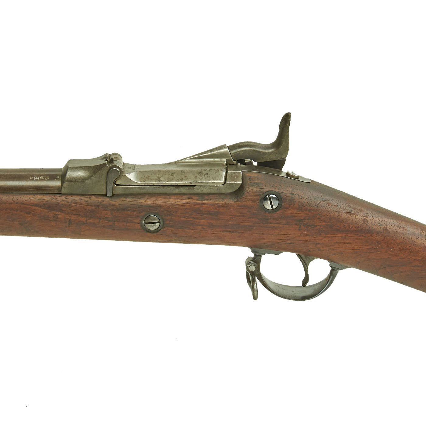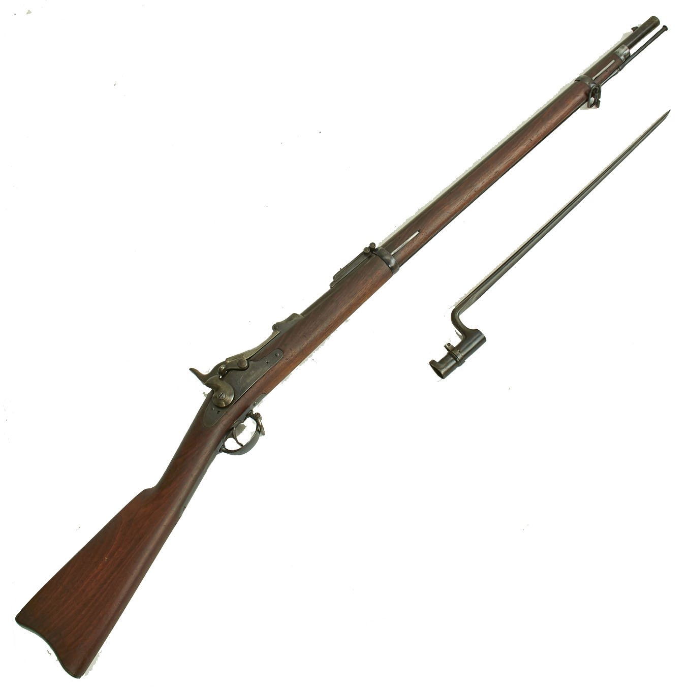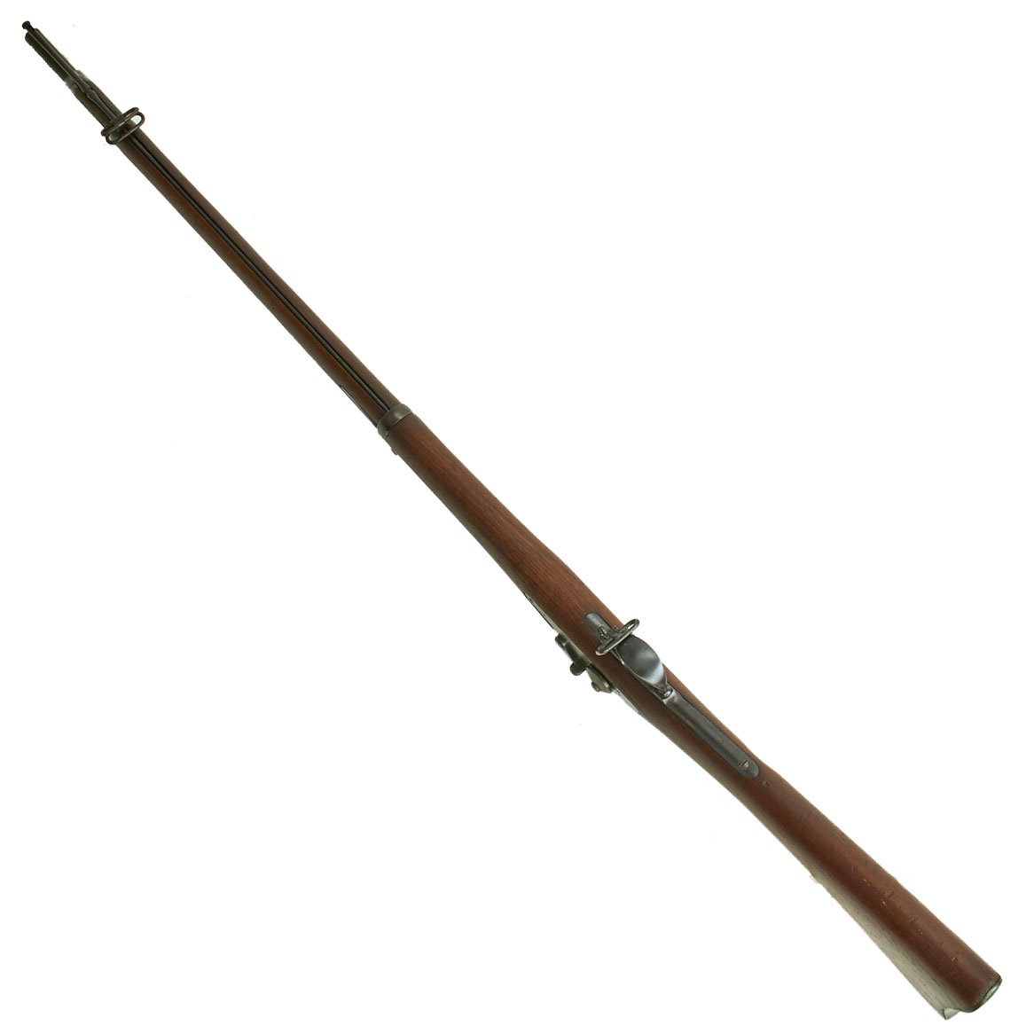 Center fire breechloader, .45 cal., two bands, two sling swivels with stacking swivel, Buffington sight, and standard ramrod. Lock is marked with an eagle and U.S. / SPRINGFIELD, manufactured by Springfield Armory, Springfield Massachusetts. Additional marks of interest include inspectors' and proof marks around the breech end of the barrel: a capital R on the top; and a V over a P over an eagle's head over another P on the left side just above the stock. The upper right corner of the Buffington sight leaf is marked R to indicate that the sight graduations are for a rifle and not a carbine.