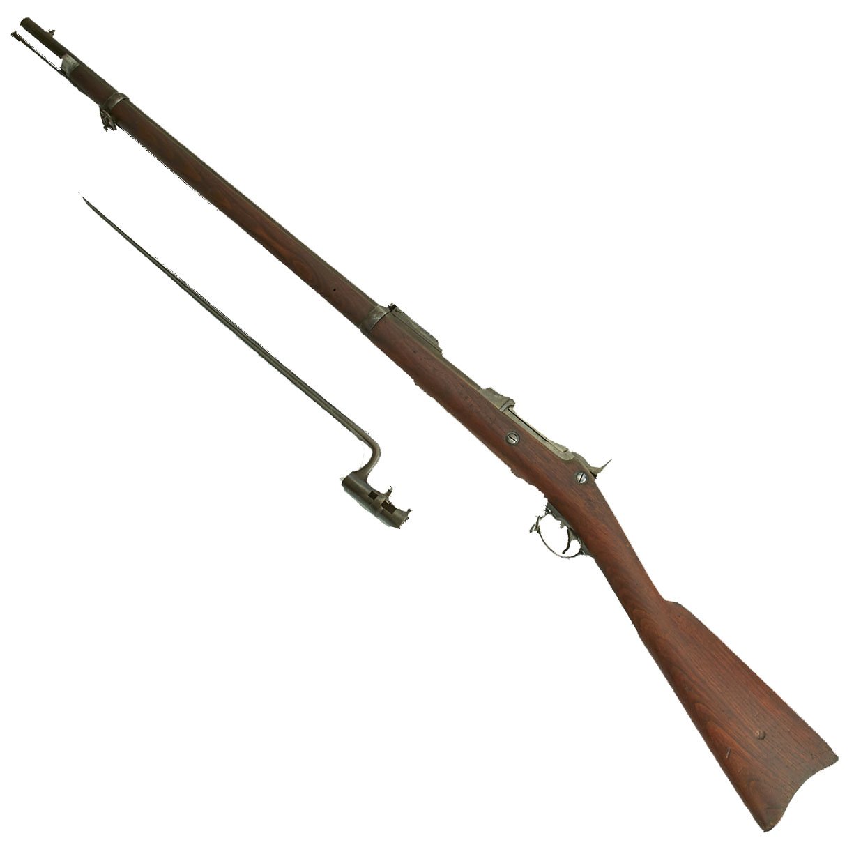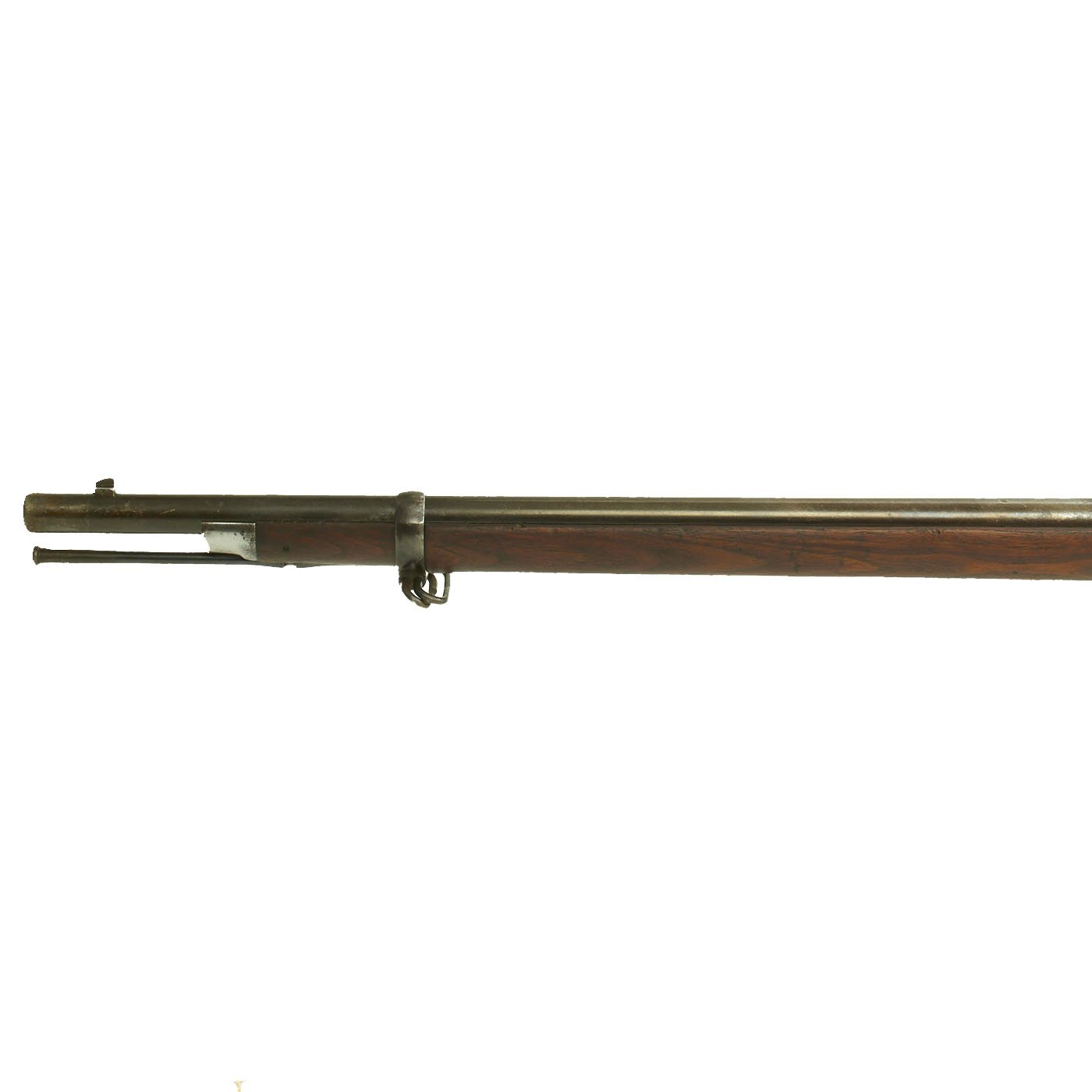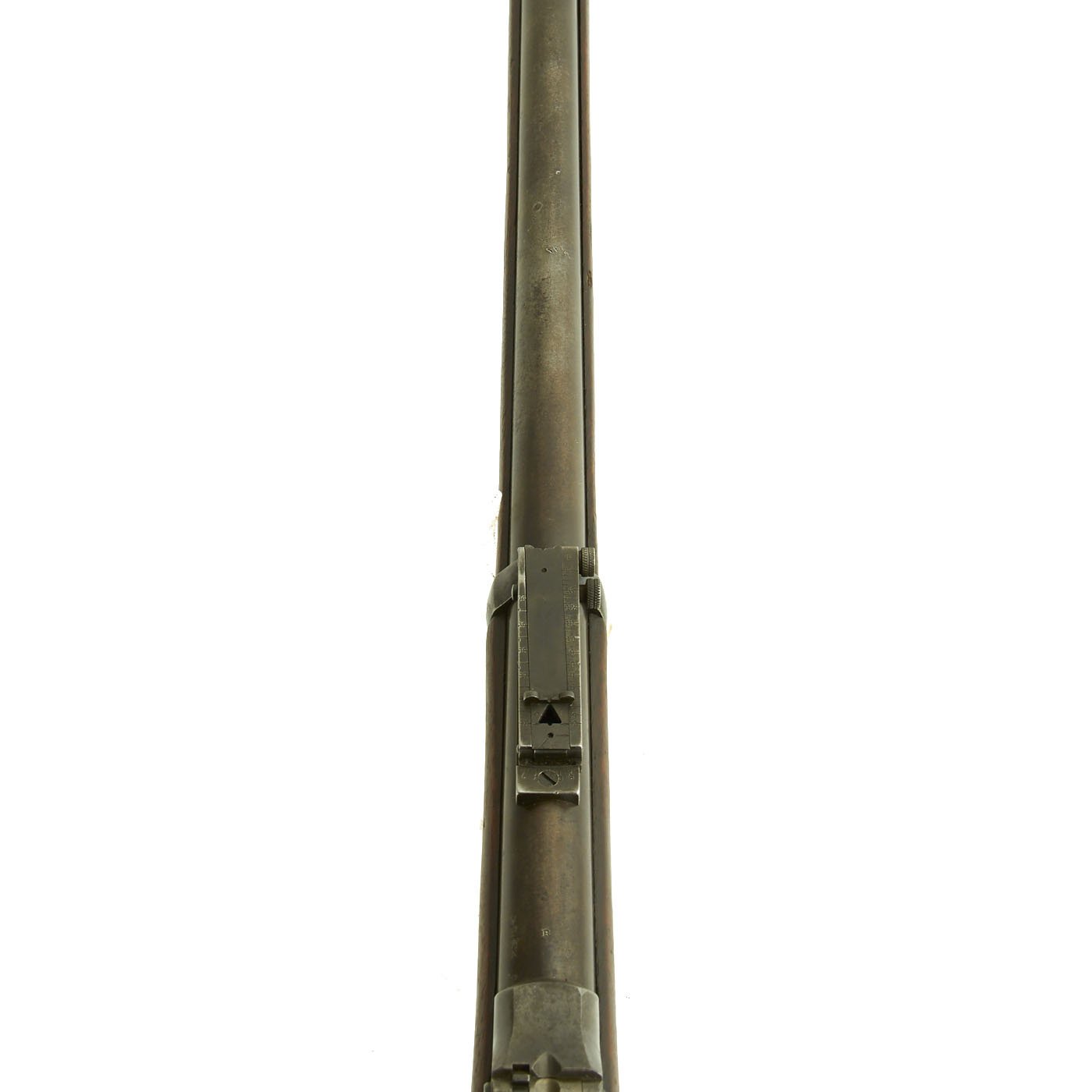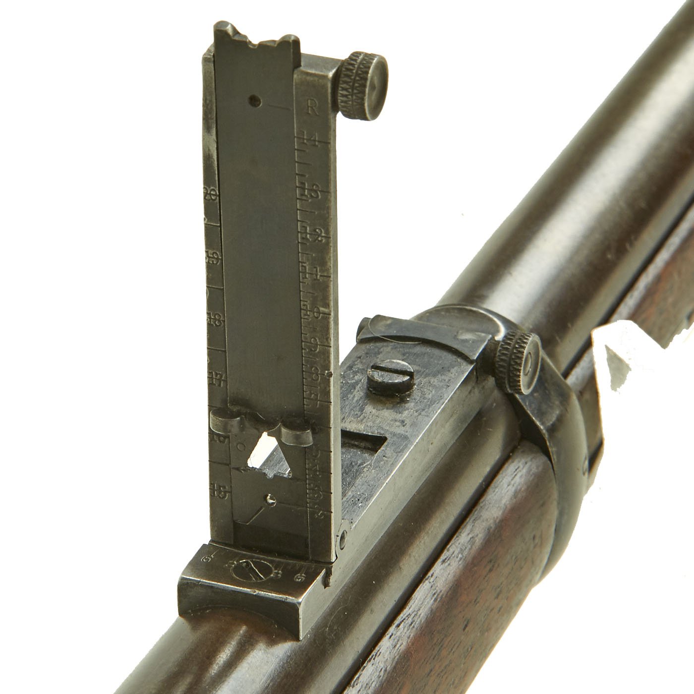 Center fire breechloader, .45 cal., two bands, two sling swivels with stacking swivel, Buffington sight, and standard ramrod. Lock is marked with an eagle and U.S. / SPRINGFIELD, manufactured by Springfield Armory, Springfield Massachusetts. Additional marks of interest include inspectors' and proof marks around the breech end of the barrel: a capital R on the top; and a V over a P over an eagle's head over another P on the left side just above the stock. The upper right corner of the Buffington sight leaf is marked R to indicate that the sight graduations are for a rifle and not a carbine.