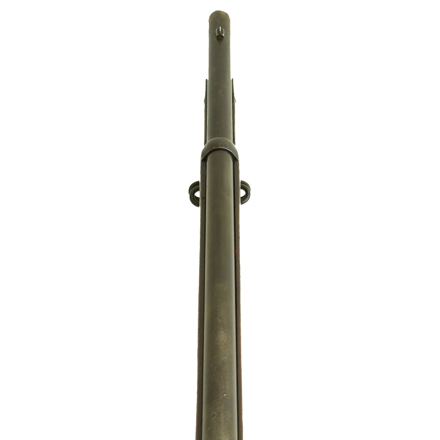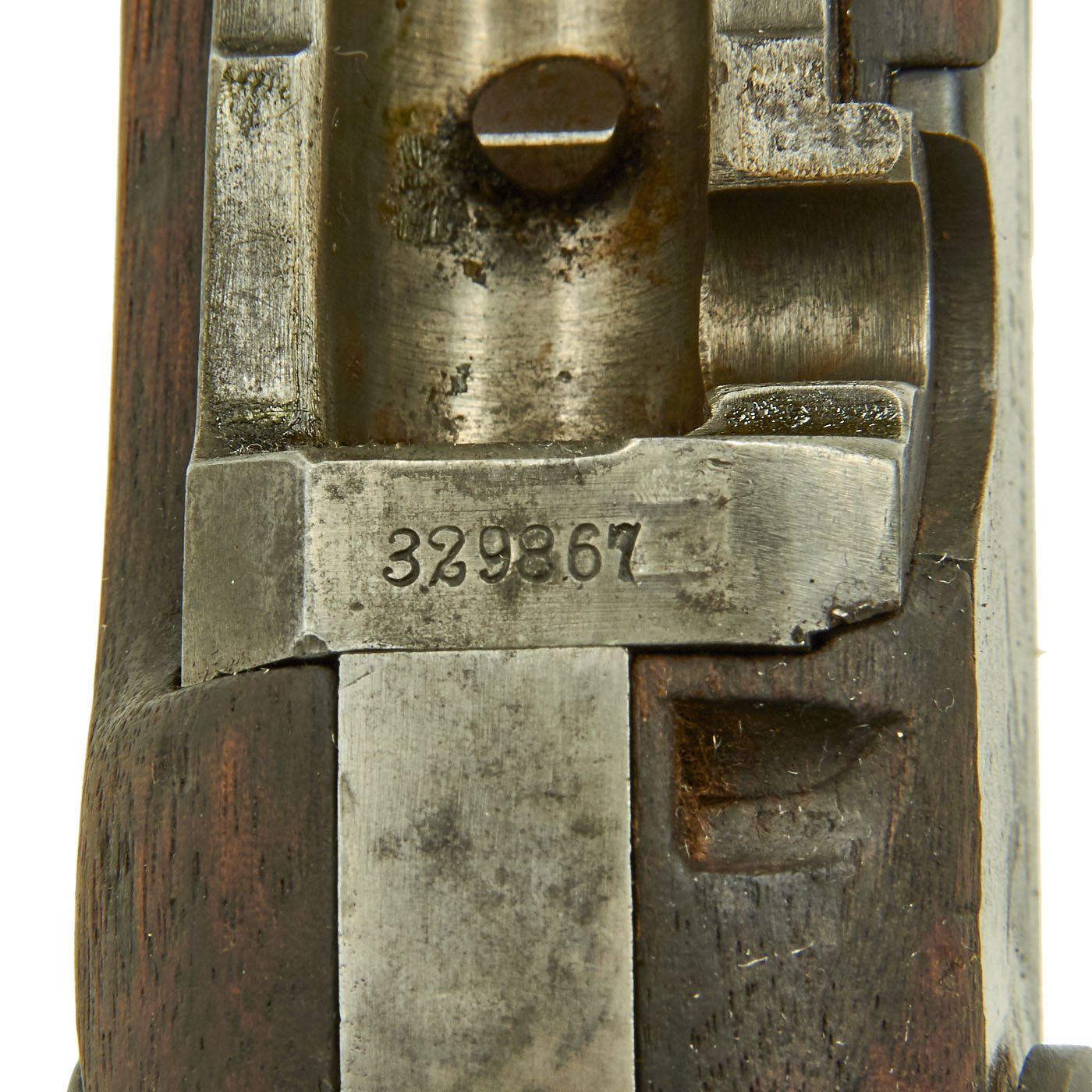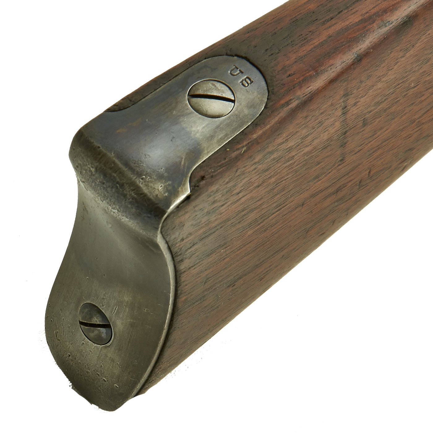 The original metal finish has faded to a dull gray patina, with some areas of peppering as well as bright steel. All proofs are still present, though some are a bit faded. The butt plate is marked U.S., and both barrel bands are U marked. The bore is in good condition, with clear lands and grooves, and a partly bright finish. There is wear and some areas of oxidation, so this rifle definitely see use.