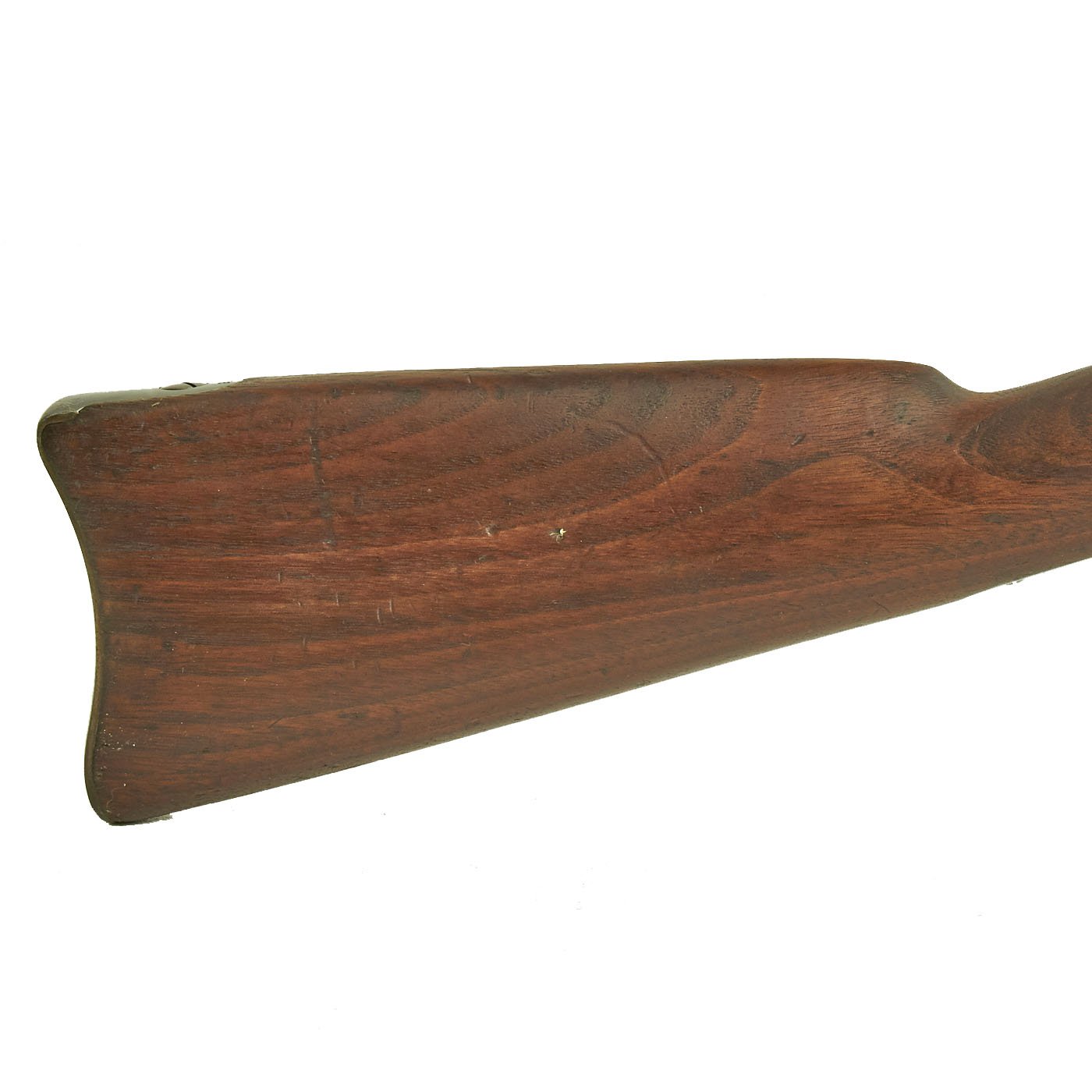 The stock on this example is just lovely, and the level of the stock is still fully proud above the lock plate, so it has not been reconditioned or worn down much. There are no major cracks or repairs that we can see. The stock still has a very nice polished glow, and has the lovely red brown of old oiled walnut.