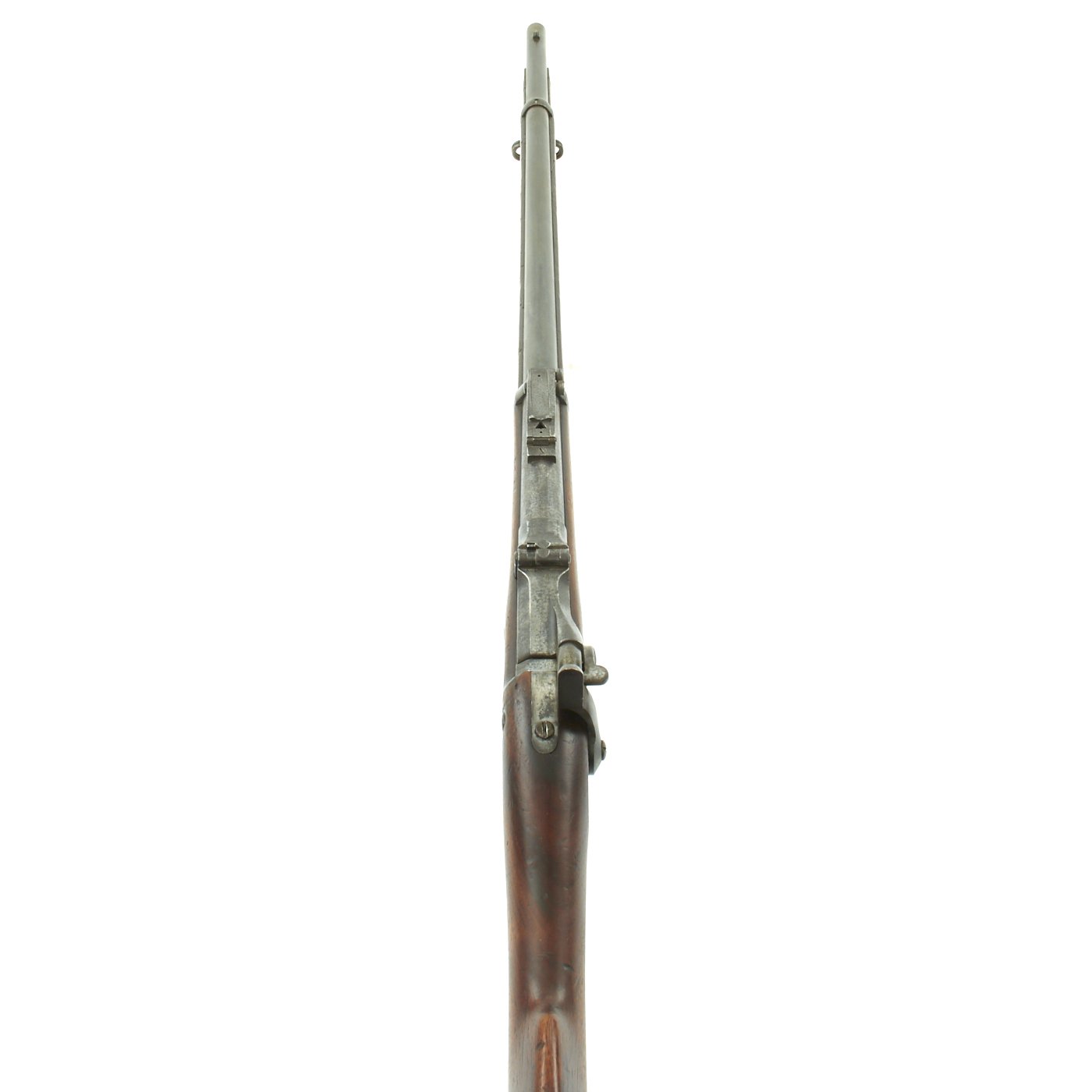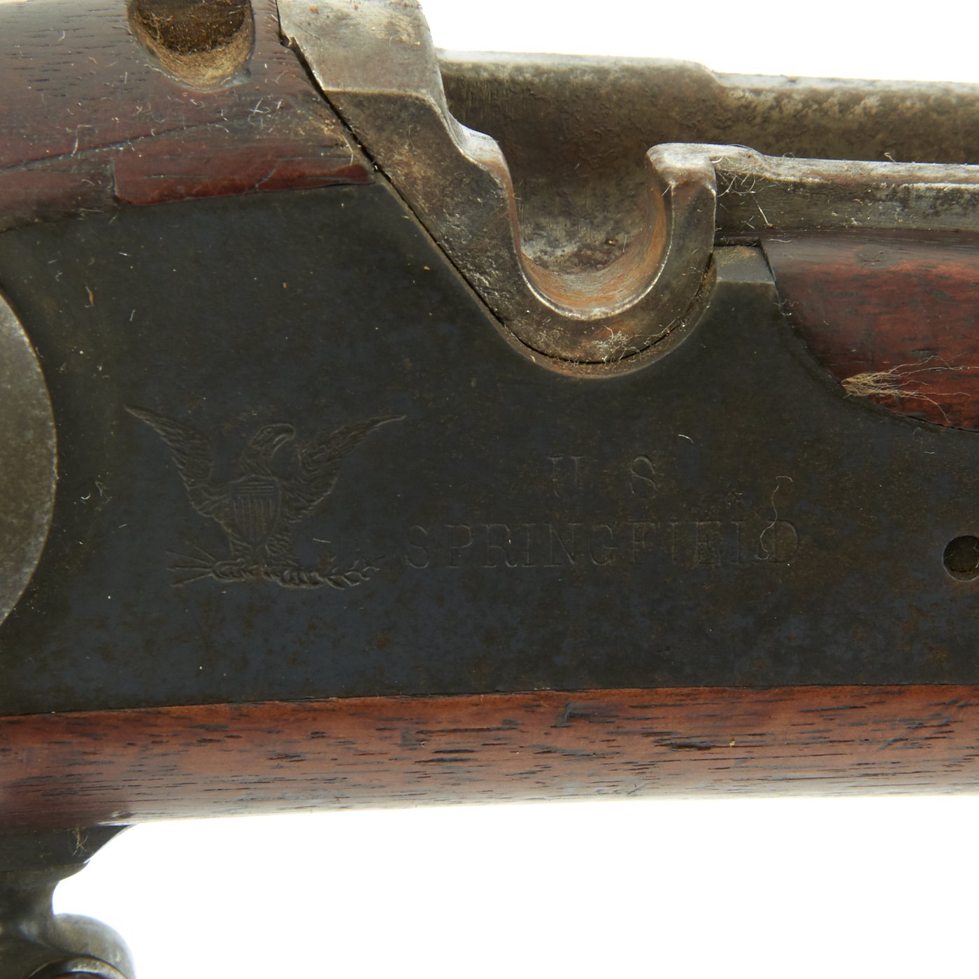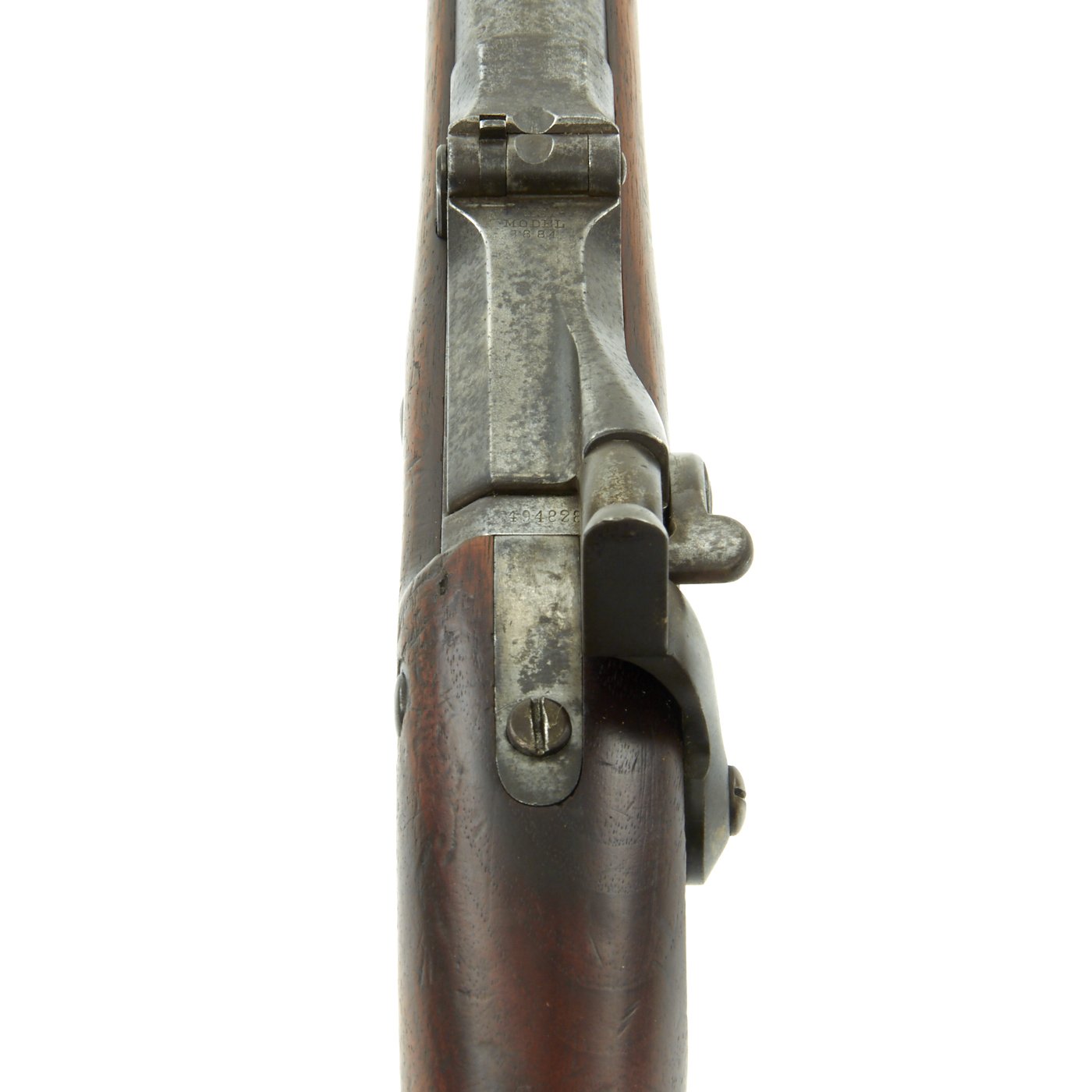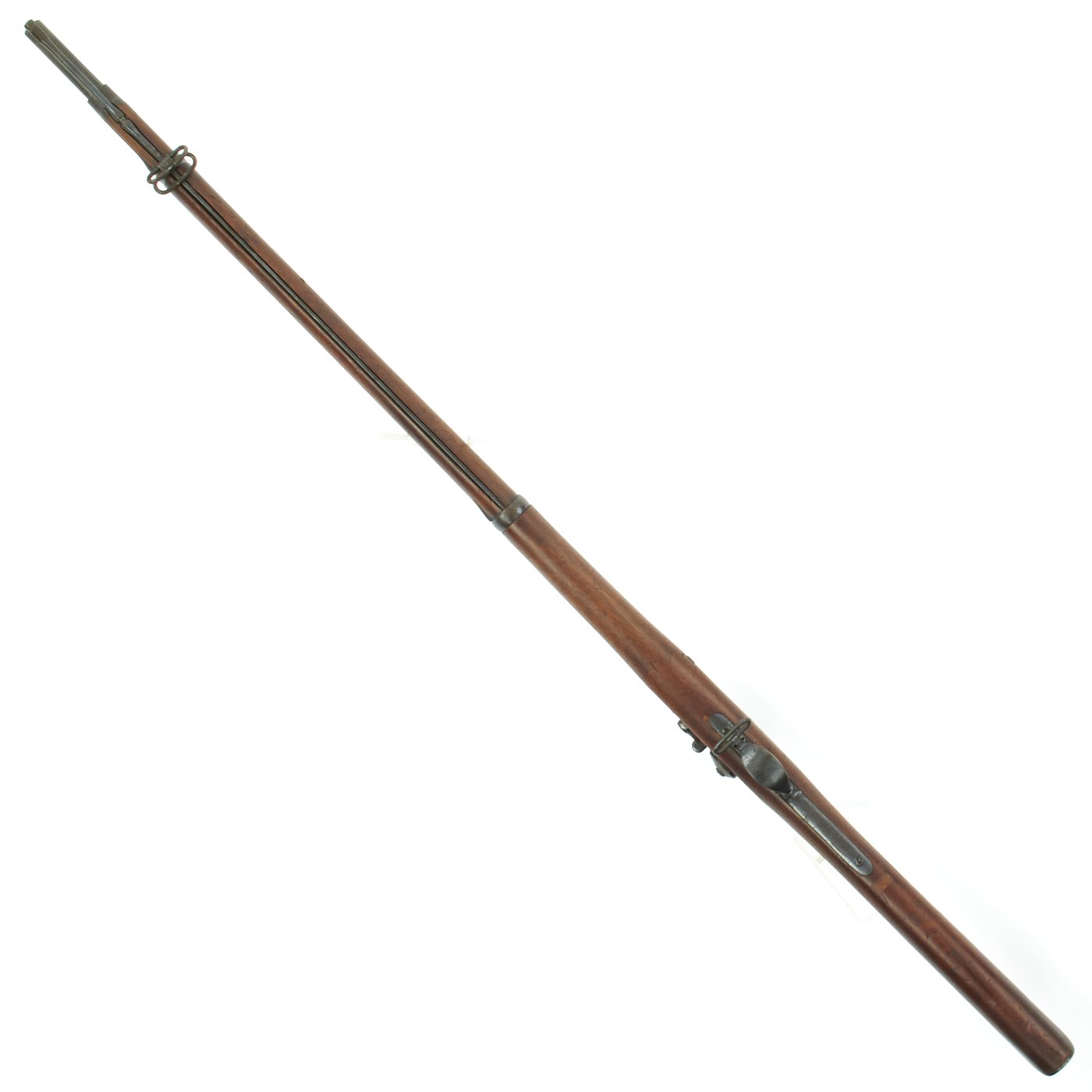 Center fire breechloader, .45 cal., two bands, with both sling swivels and stacking swivel, Buffington sight, and standard ramrod. Lock is marked with an eagle and U.S. / SPRINGFIELD, manufactured by Springfield Armory, Springfield Massachusetts.