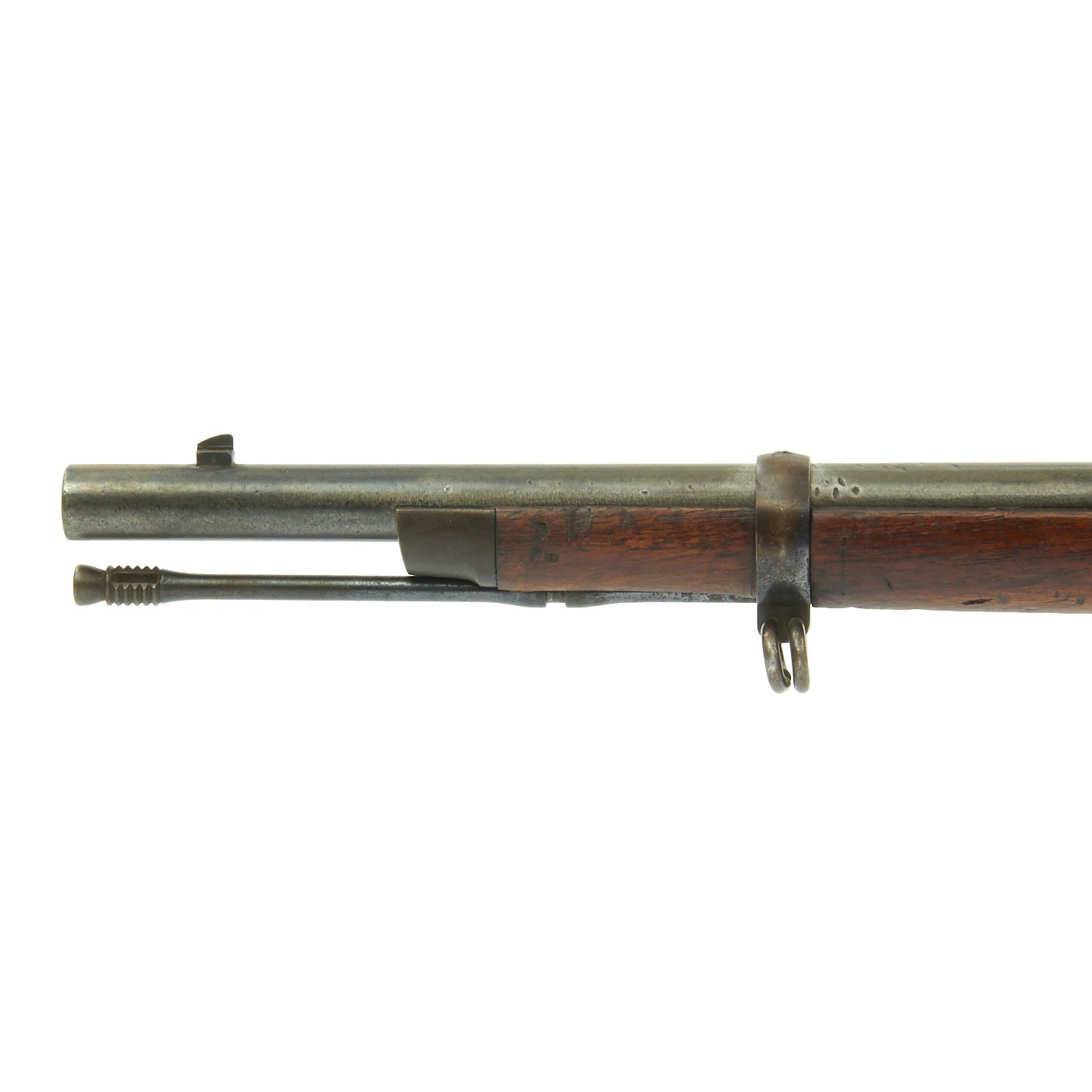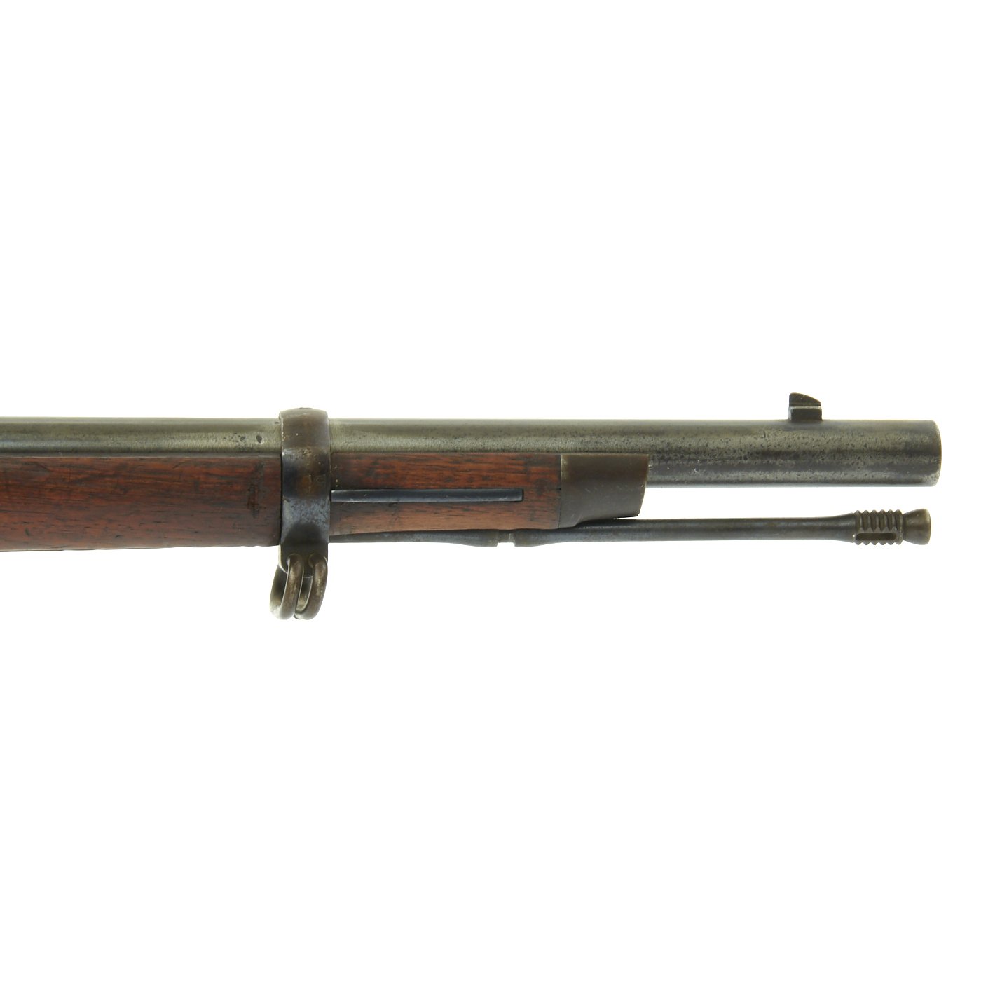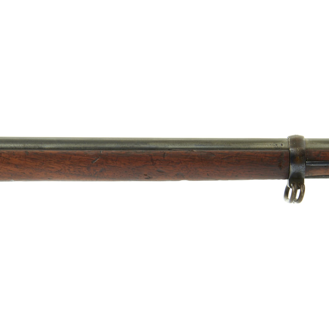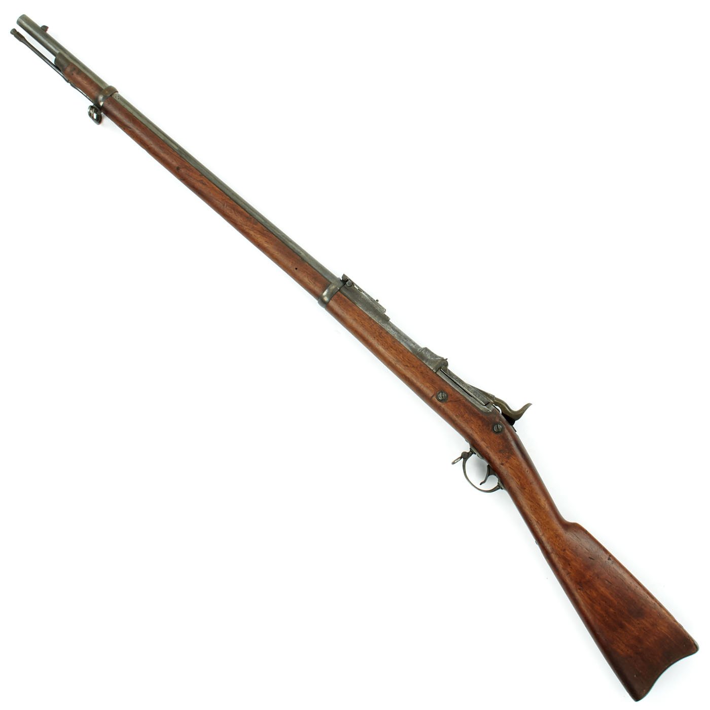 Center fire breechloader, .45 cal., two bands, with both sling swivels and stacking swivel, Buffington sight, and standard ramrod. Lock is marked with an eagle and U.S. / SPRINGFIELD, manufactured by Springfield Armory, Springfield Massachusetts.