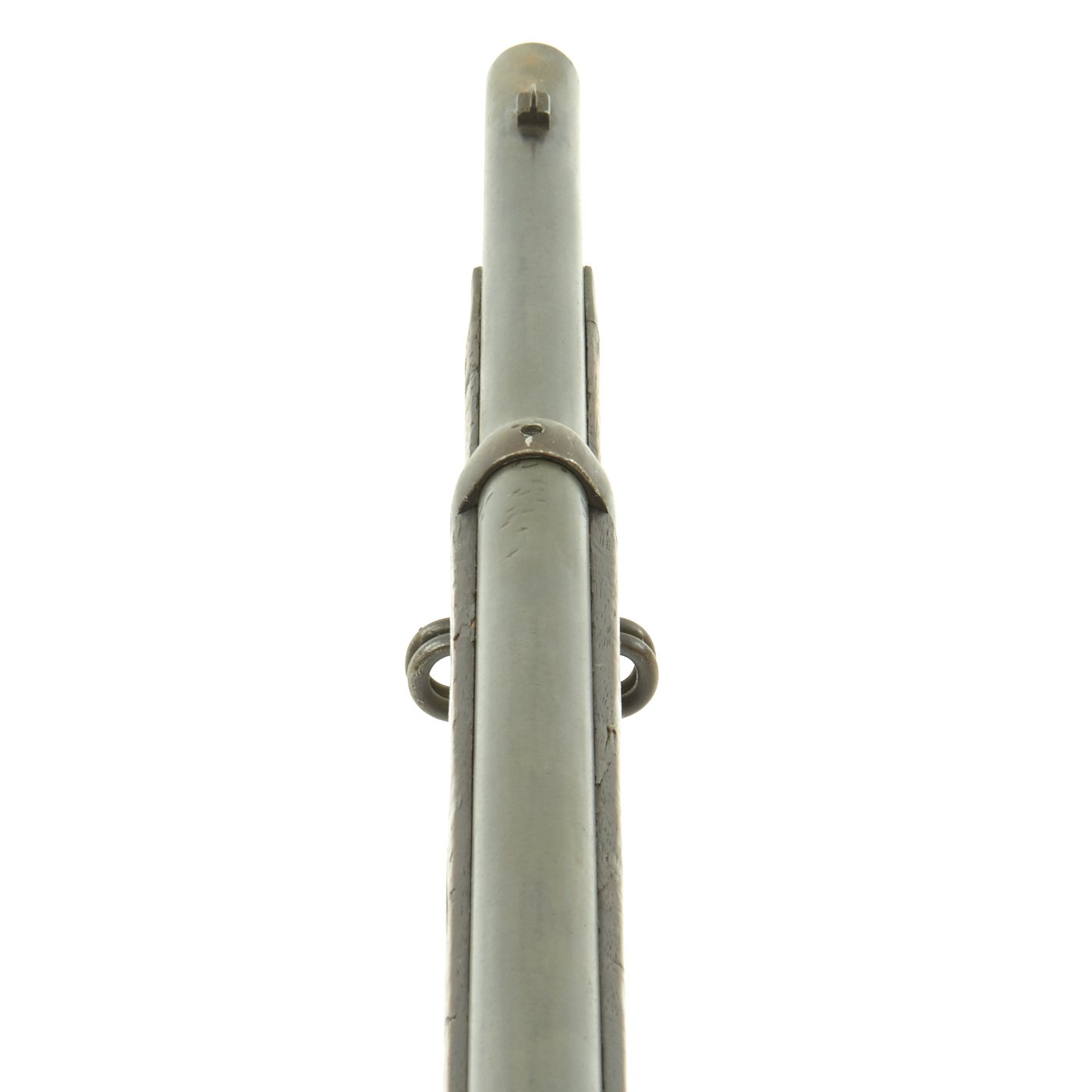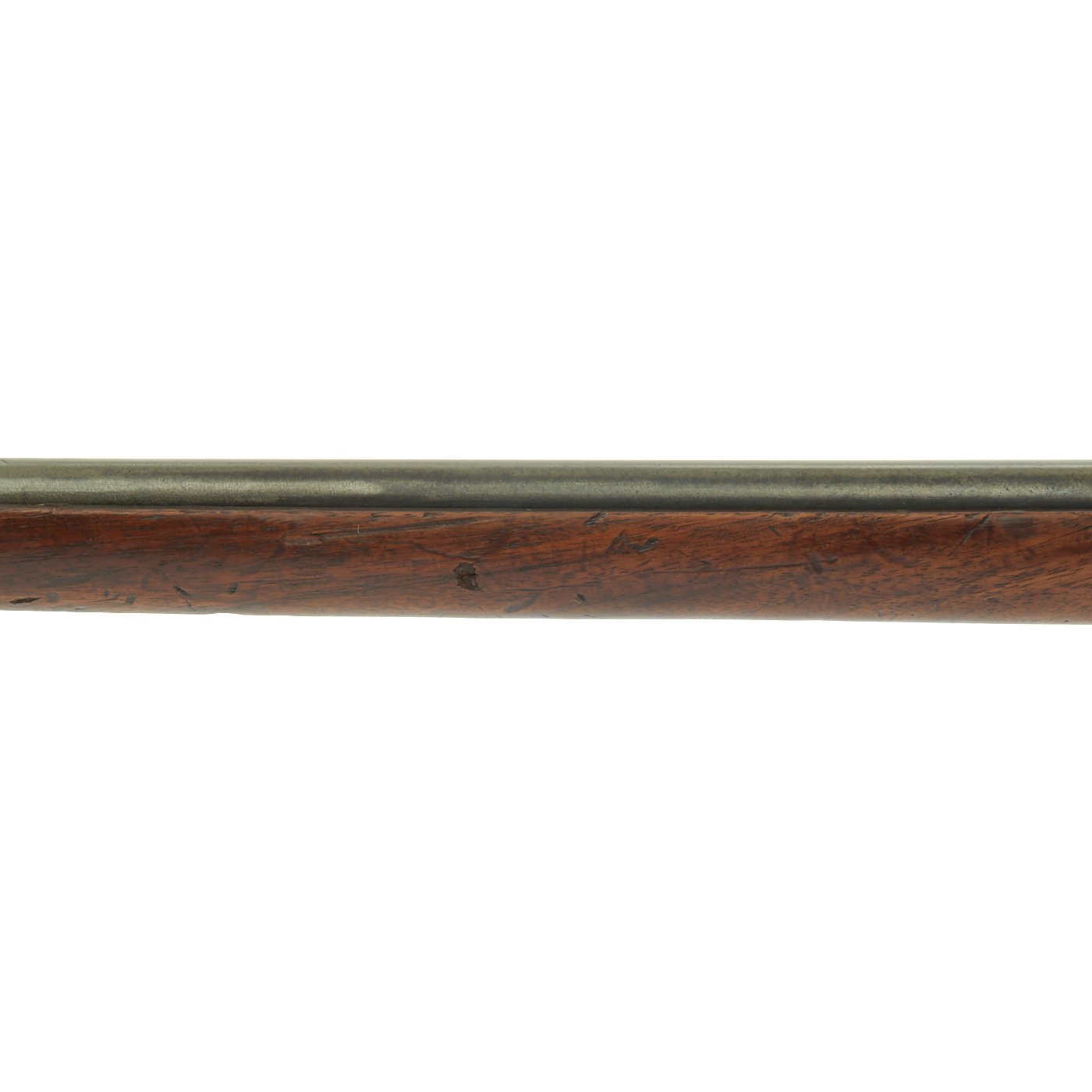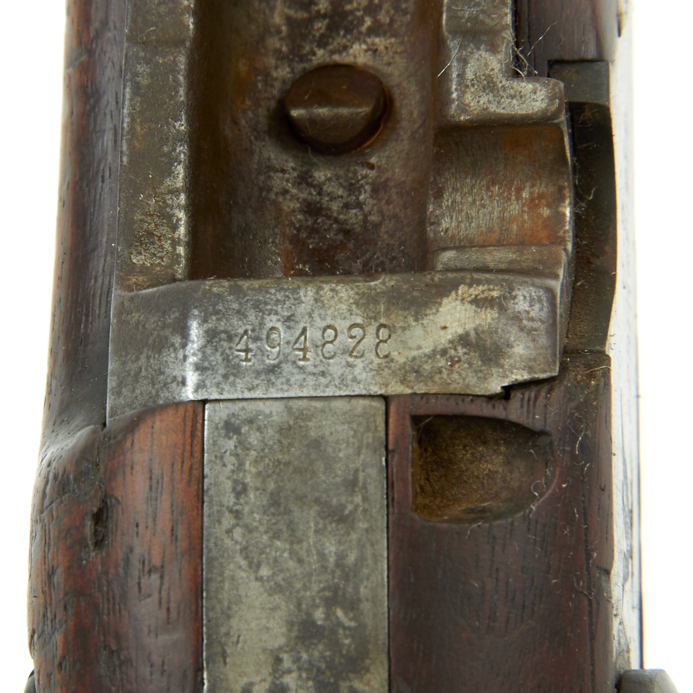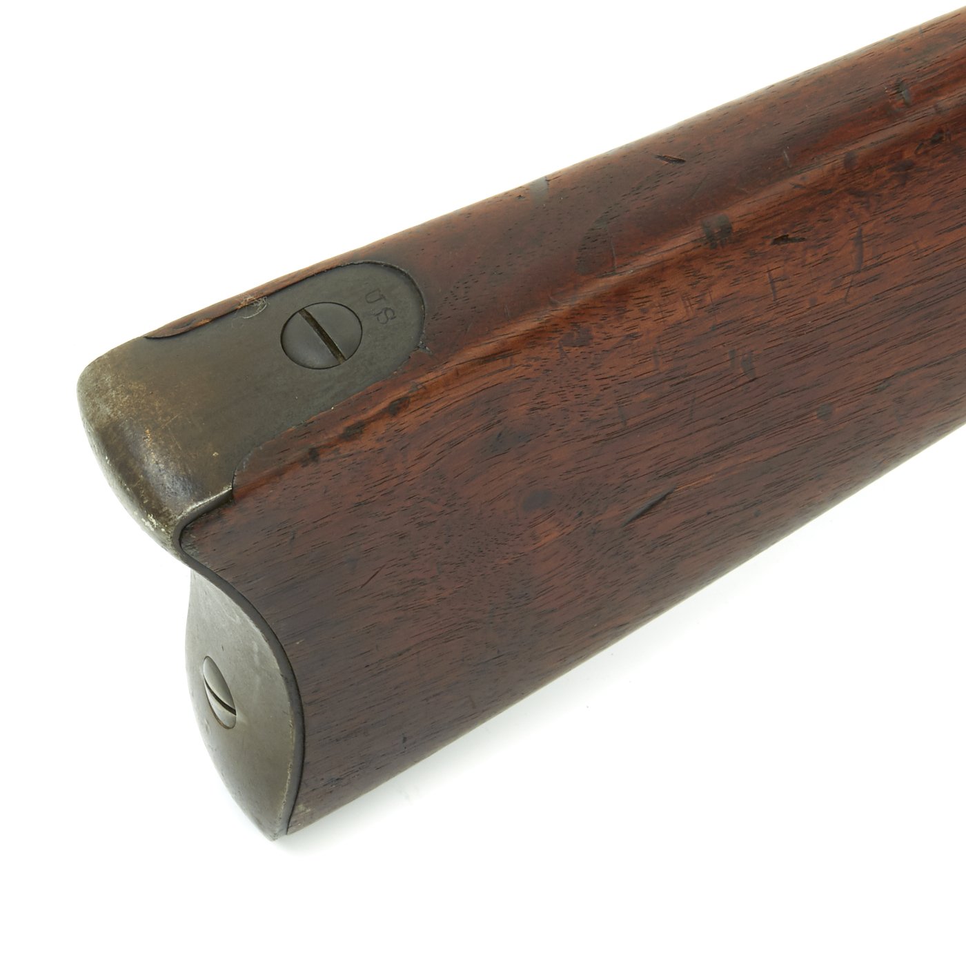The original metal finish has faded to a dull gray patina, with some areas of peppering as well as bright steel. All proofs are still present, though some are a bit faded.. The butt plate is marked U.S., and both barrel bands are U marked. The butt plate does have a bit of light peppering. The bore is in good condition, with clear lands and grooves, and a partly bright finish. There is wear and some areas of oxidation, so this rifle definitely see use.