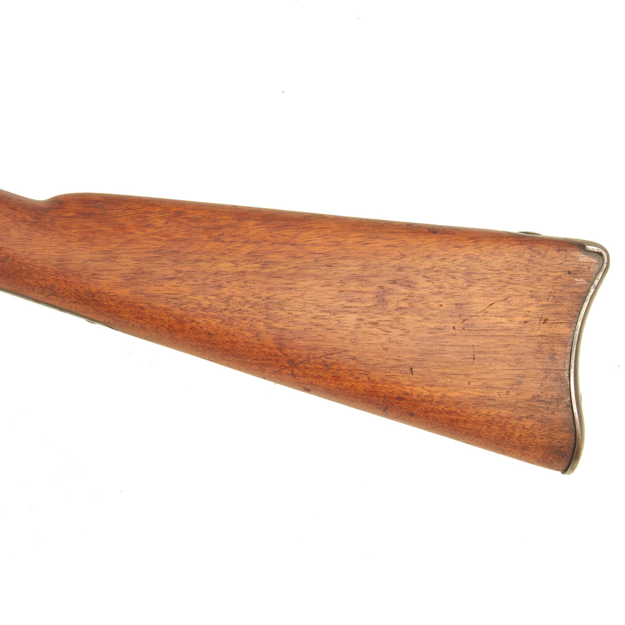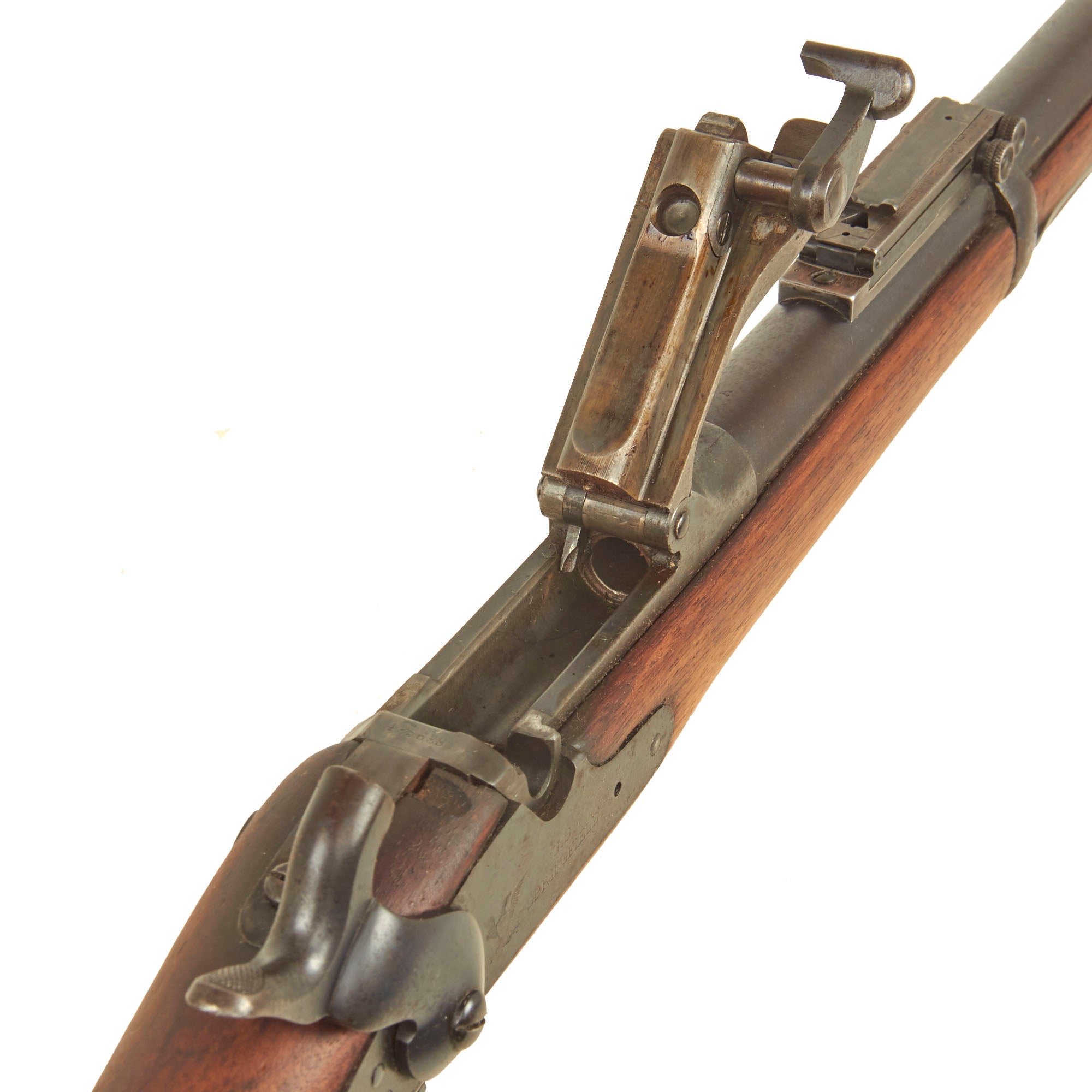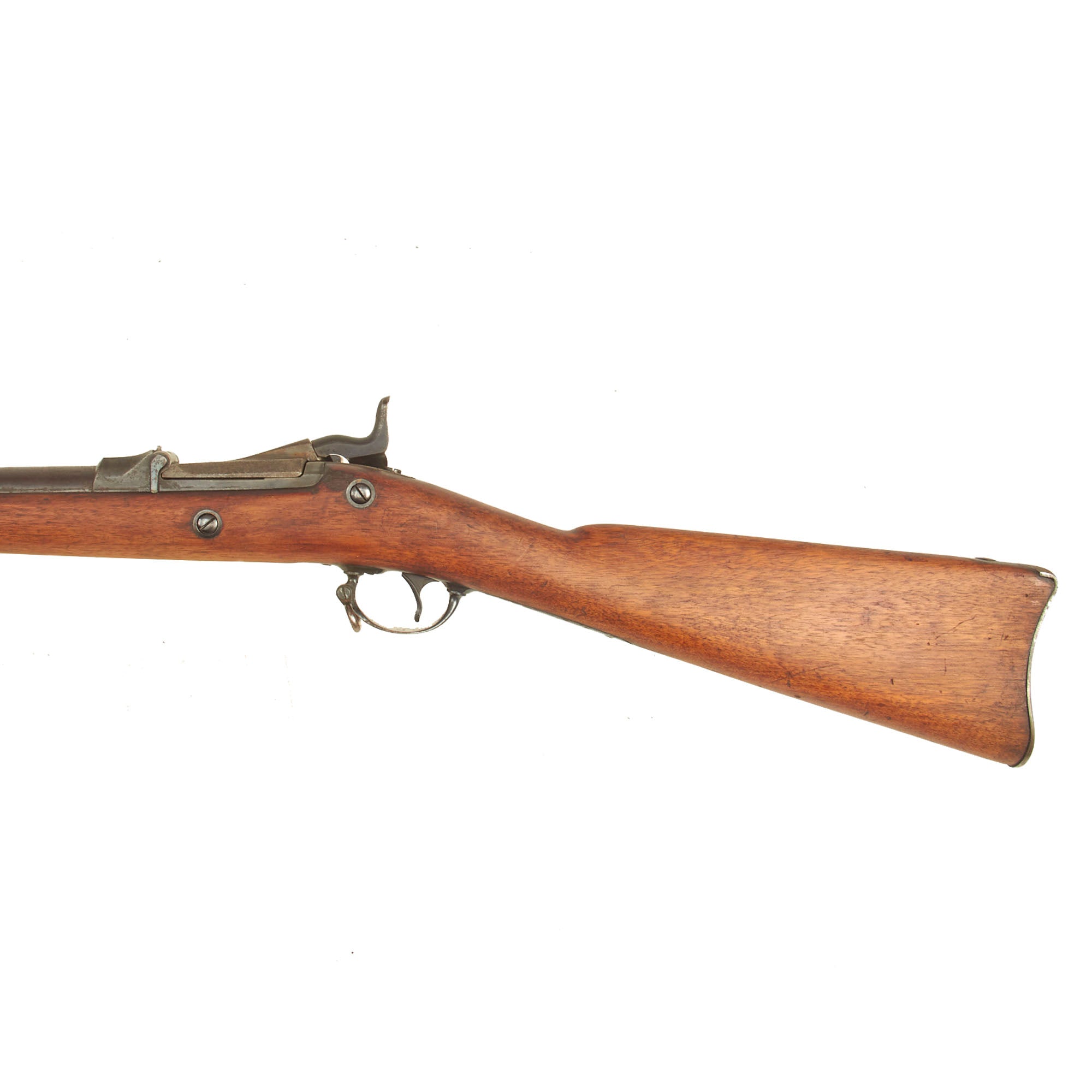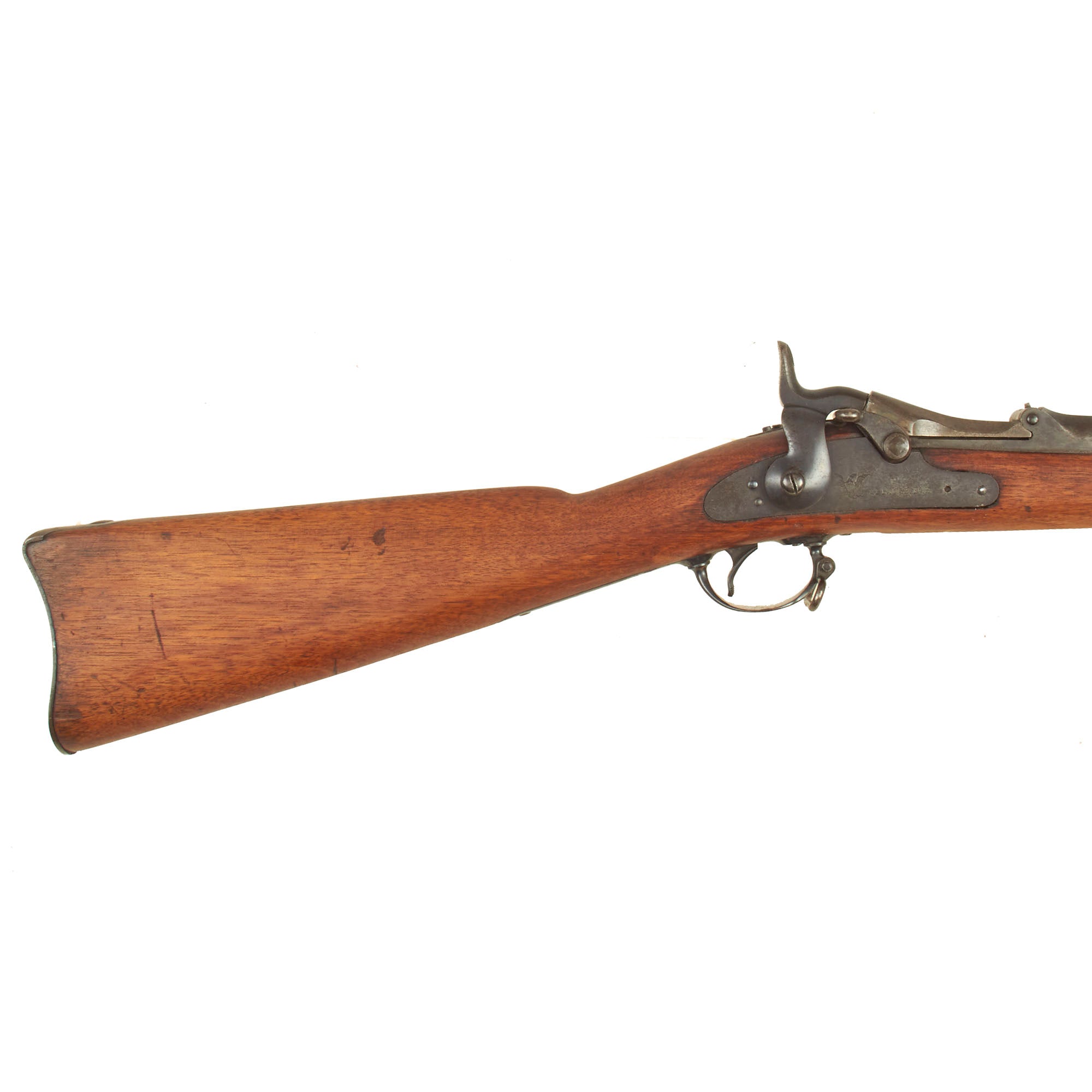 The both barrel bands are U marked, and the butt plate tang is marked with the correct U.S. stamp. Metal finish is very good, an aged plum patina present on most of the barrel and fittings, with areas still baring much of the original blued finish. There is also some of the original case hardened finish on the receiver and breech block, with the rest faded to a gray patina, and no signs of refinishing. Center fire breechloader, .45 cal., two bands, two sling swivels with stacking swivel, fully functional Buffington sight, with standard ramrod. Lock is marked with a Federal Eagle to the left of U.S. / SPRINGFIELD, indicating that it was manufactured at the United States Armory and Arsenal at Springfield, in Springfield, Massachusetts.