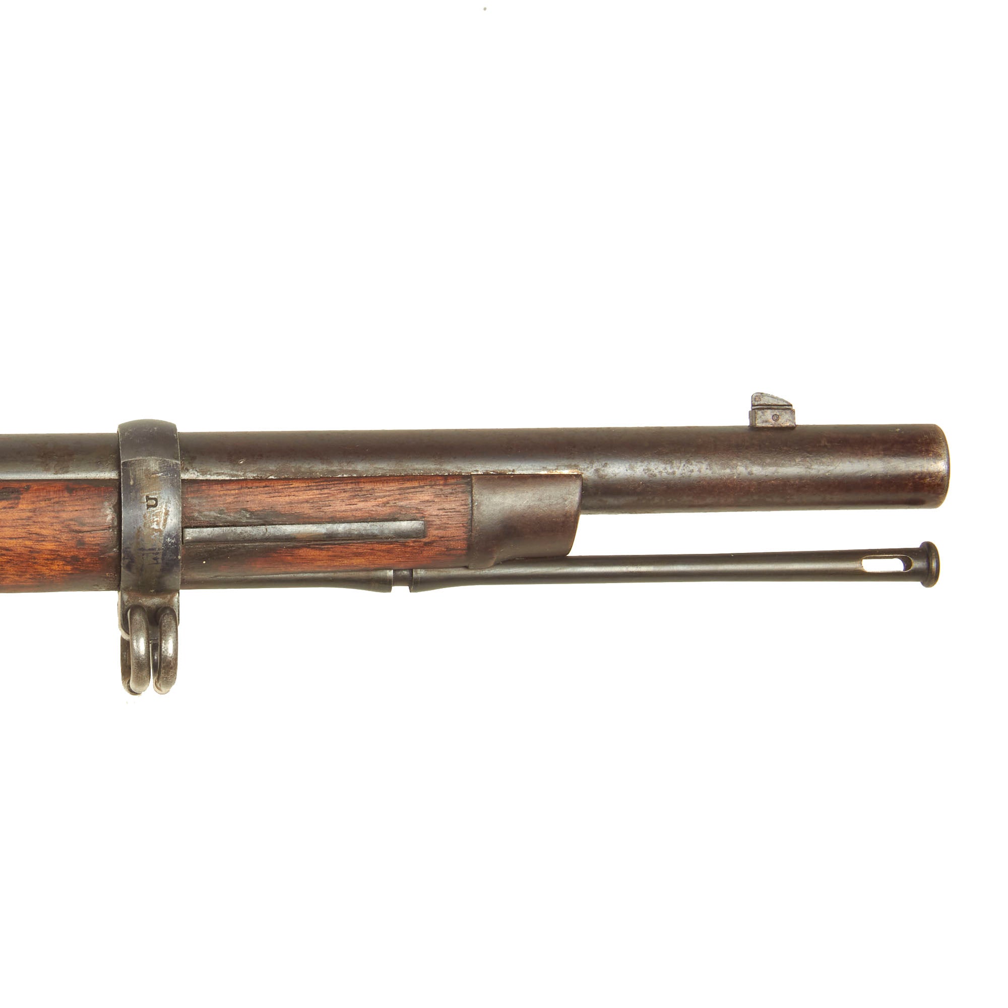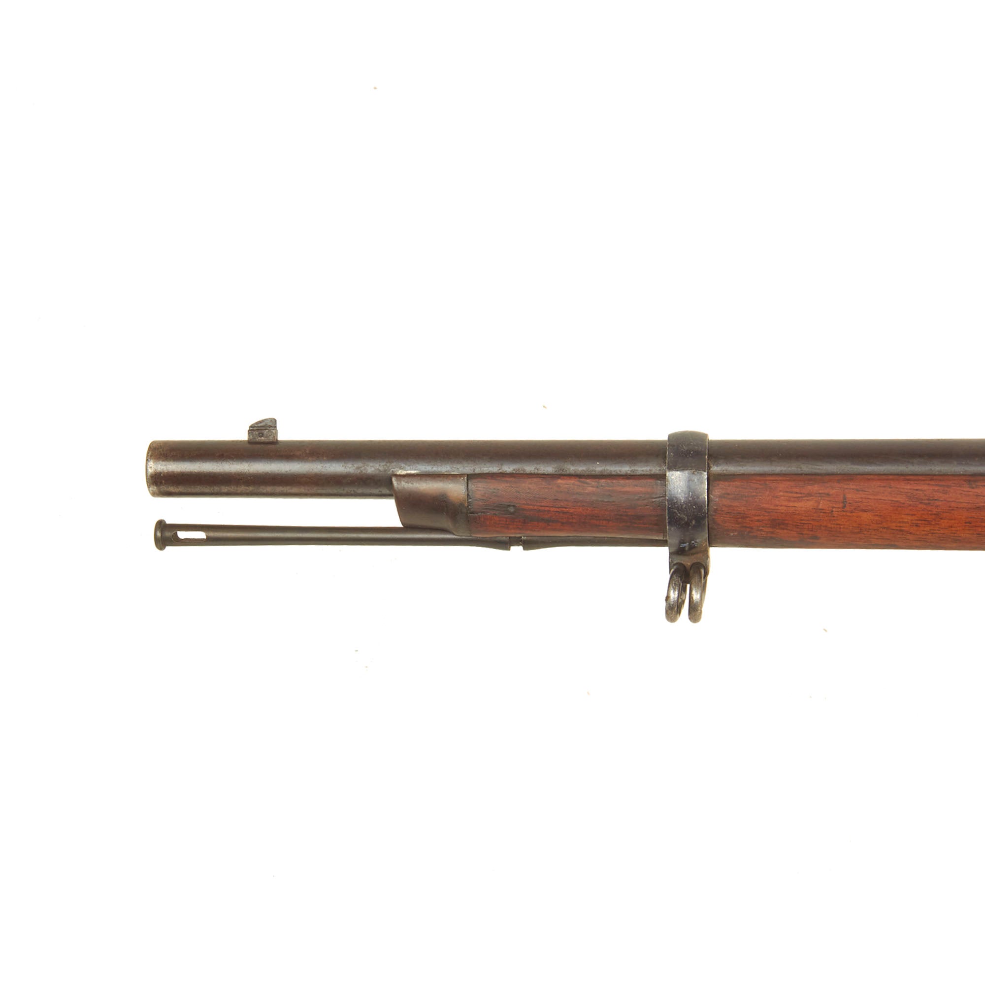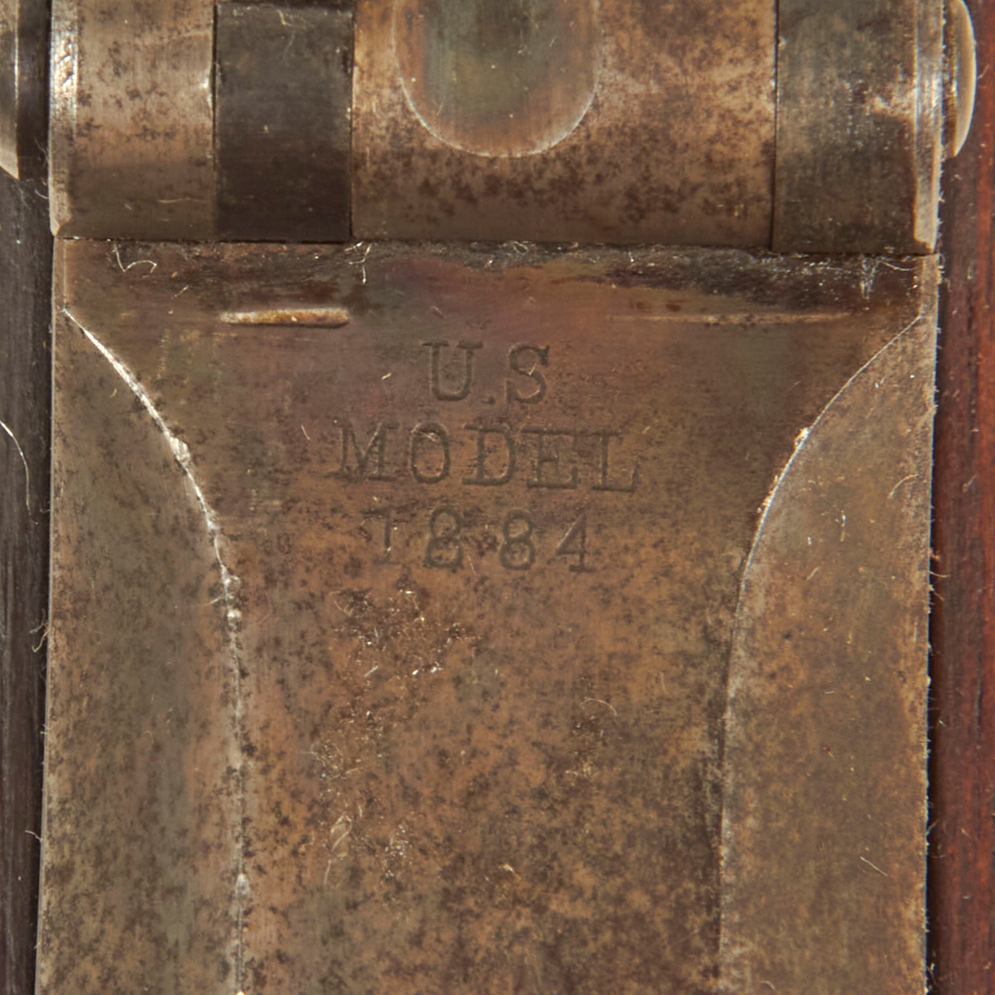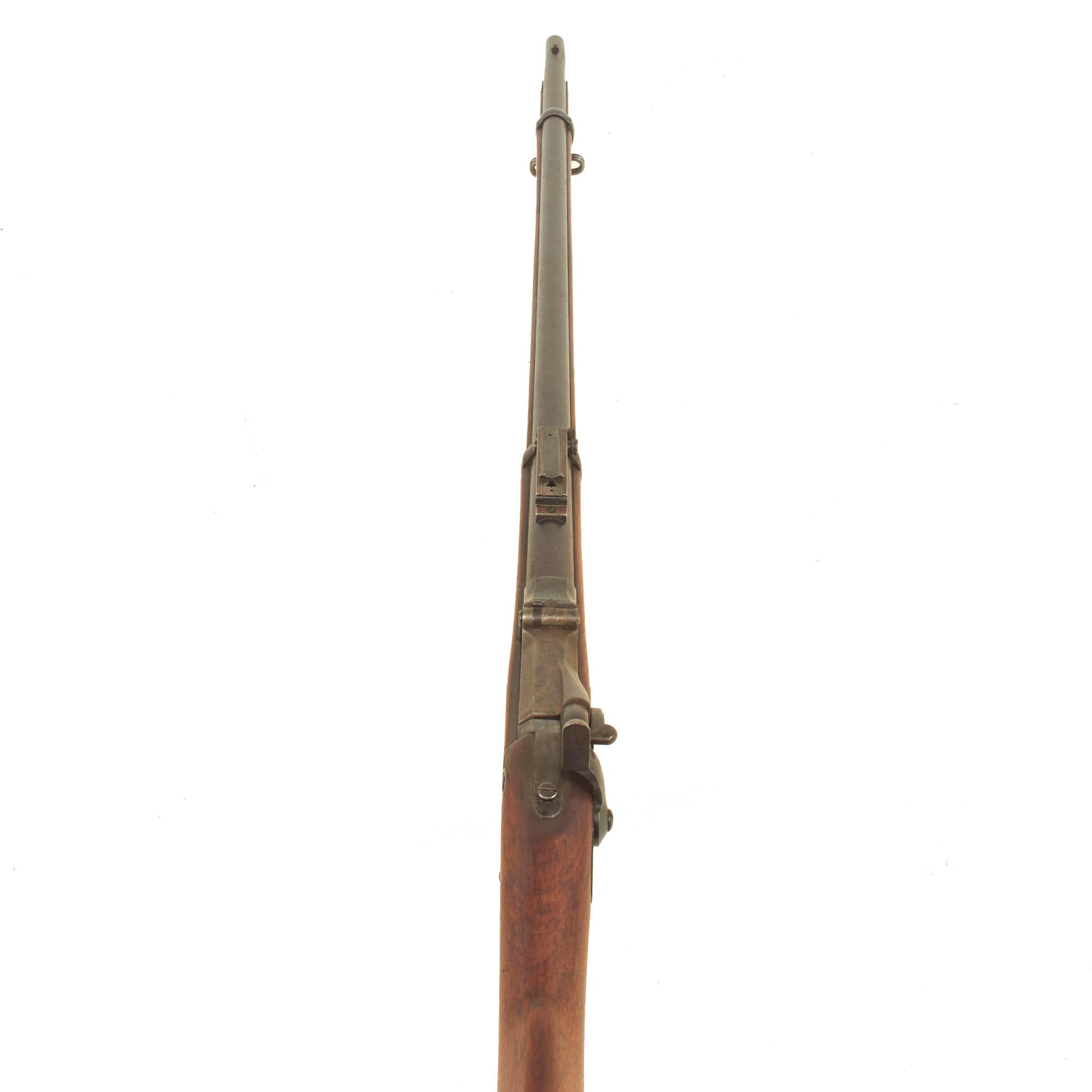 The both barrel bands are U marked, and the butt plate tang is marked with the correct U.S. stamp. Metal finish is very good, an aged plum patina present on most of the barrel and fittings, with areas still baring much of the original blued finish. There is also some of the original case hardened finish on the receiver and breech block, with the rest faded to a gray patina, and no signs of refinishing. Center fire breechloader, .45 cal., two bands, two sling swivels with stacking swivel, fully functional Buffington sight, with standard ramrod. Lock is marked with a Federal Eagle to the left of U.S. / SPRINGFIELD, indicating that it was manufactured at the United States Armory and Arsenal at Springfield, in Springfield, Massachusetts.