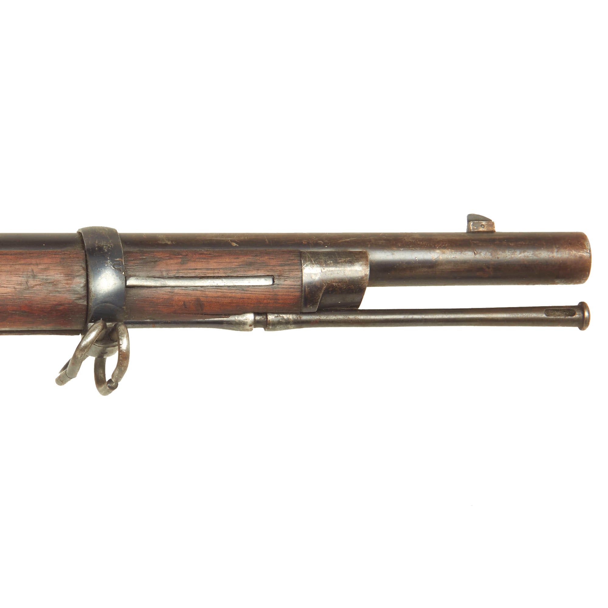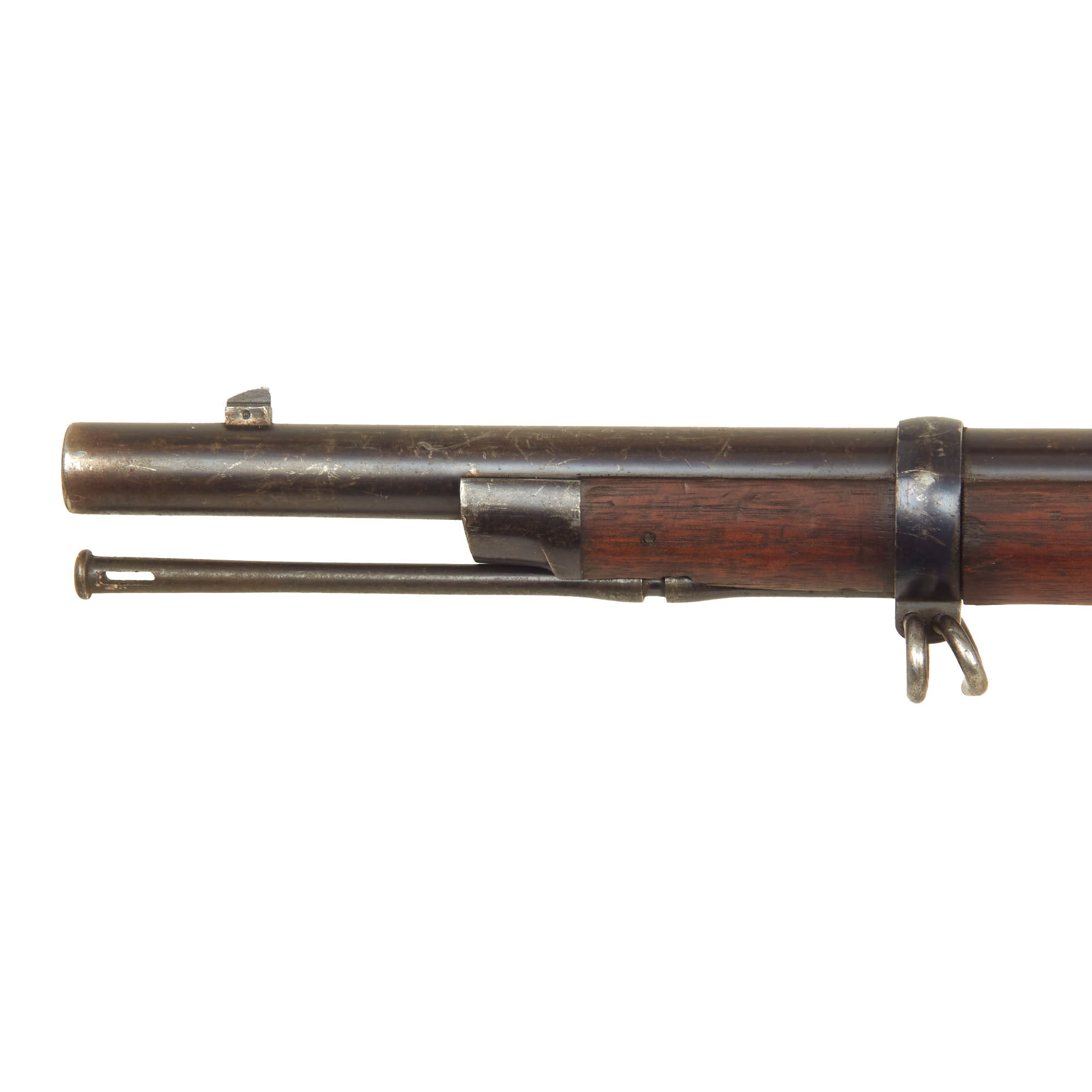 The both barrel bands are U marked, and the butt plate tang is marked with the correct U.S. stamp. Metal finish is very good, an aged plum patina present on most of the barrel and fittings, with areas still baring much of the original blued finish. There is also some of the original case hardened finish on the receiver, with the rest faded to a gray patina, and no signs of refinishing. Center fire breechloader, .45 cal., two bands, two sling swivels with stacking swivel, Buffington sight, with standard ramrod. Lock is marked with a Federal Eagle to the left of U.S. / SPRINGFIELD, indicating that it was manufactured at the United States Armory and Arsenal at Springfield, in Springfield, Massachusetts.