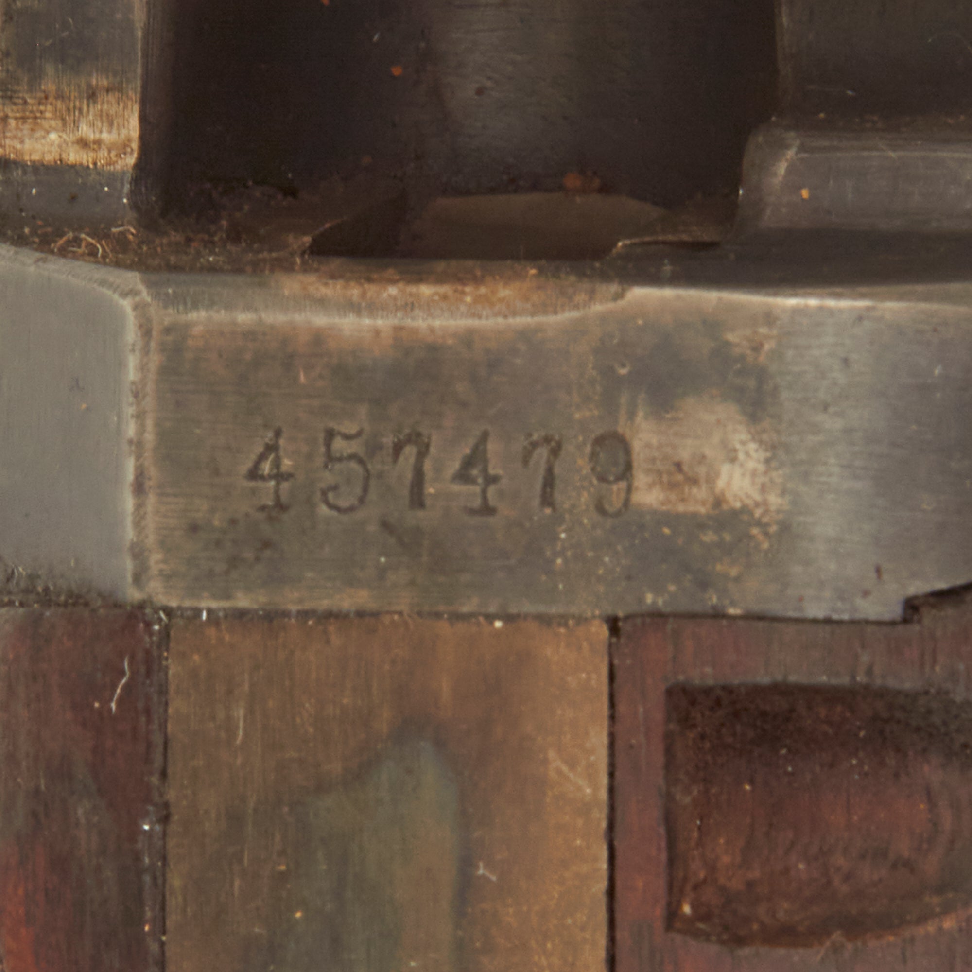 The wood stock does show some wear from service, with the usual dents and small chunks missing, but no major structural cracks or other catastrophic damage. The stock is still mostly proud over the lock plate, indicating that it has not been reconditioned over the years, which would remove wood from the stock. It has the typical look of a rifle that saw use in service, with dents, dings, and other wear from use. The bore is in excellent barely used condition, showing crisp lands and grooves with a bright finish. We can see very little evidence that it was ever used. The breech block moves correctly, and the extractor is still present and functional, though we have not tested it with real brass.