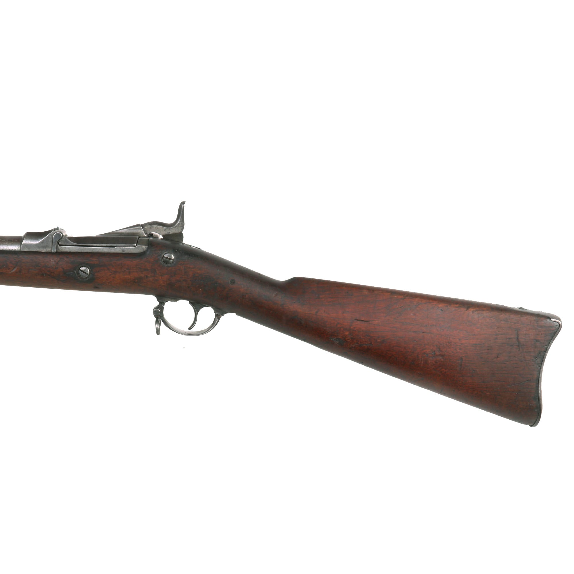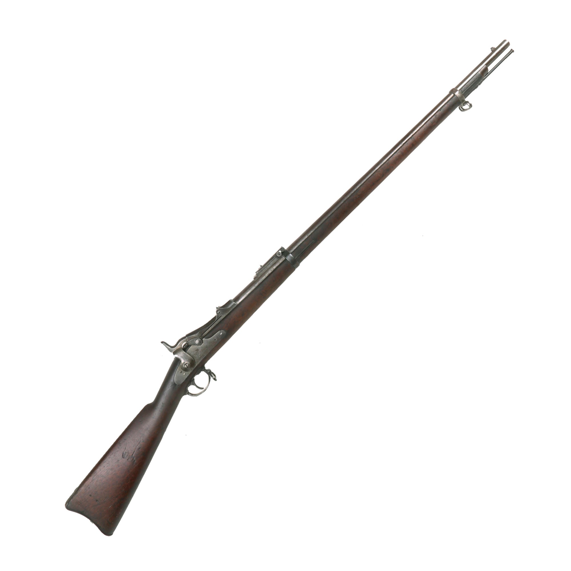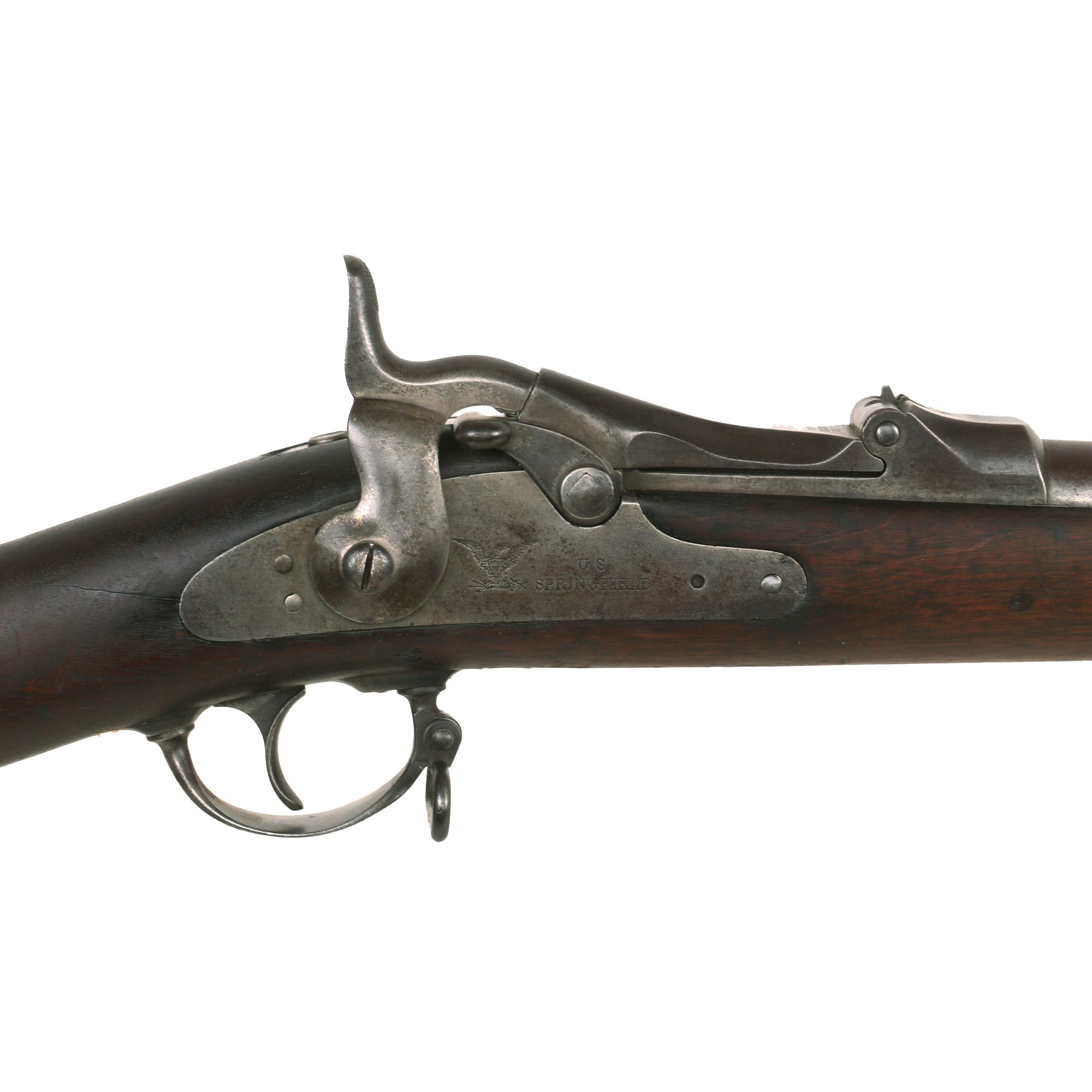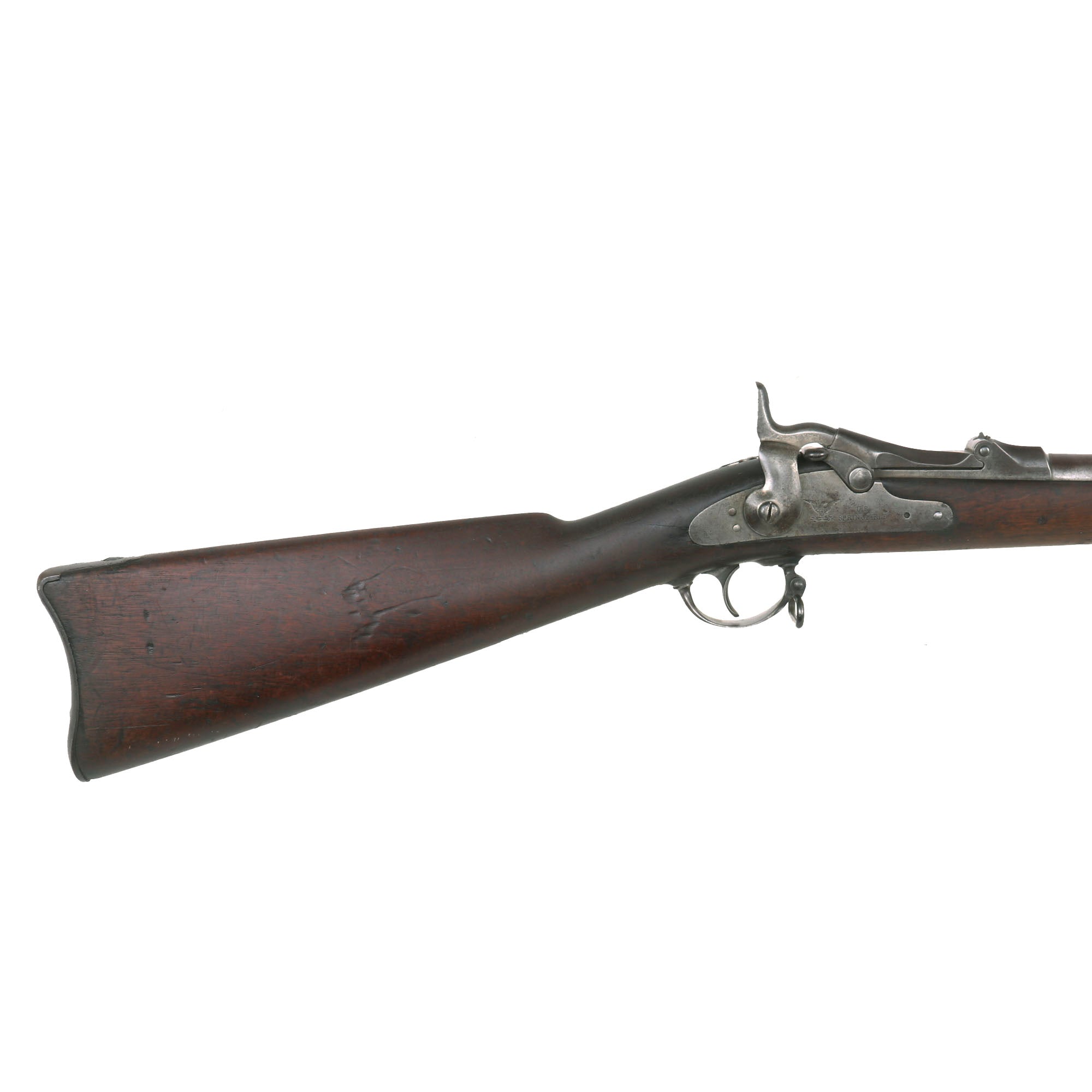 The both barrel bands are U marked, and the butt plate tang is marked with the correct U.S. stamp. Metal finish is a lovely aged gray patina from long service. Center fire breechloader, .45 cal., two bands, two sling swivels with stacking swivel, Buffington sight, with standard ramrod. Lock is marked with a Federal Eagle to the left of U.S. / SPRINGFIELD, indicating that it was manufactured at the United States Armory and Arsenal at Springfield, in Springfield, Massachusetts.