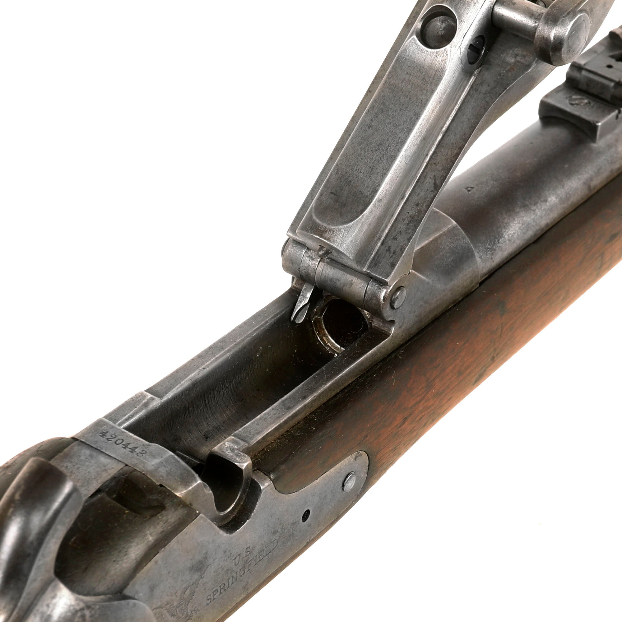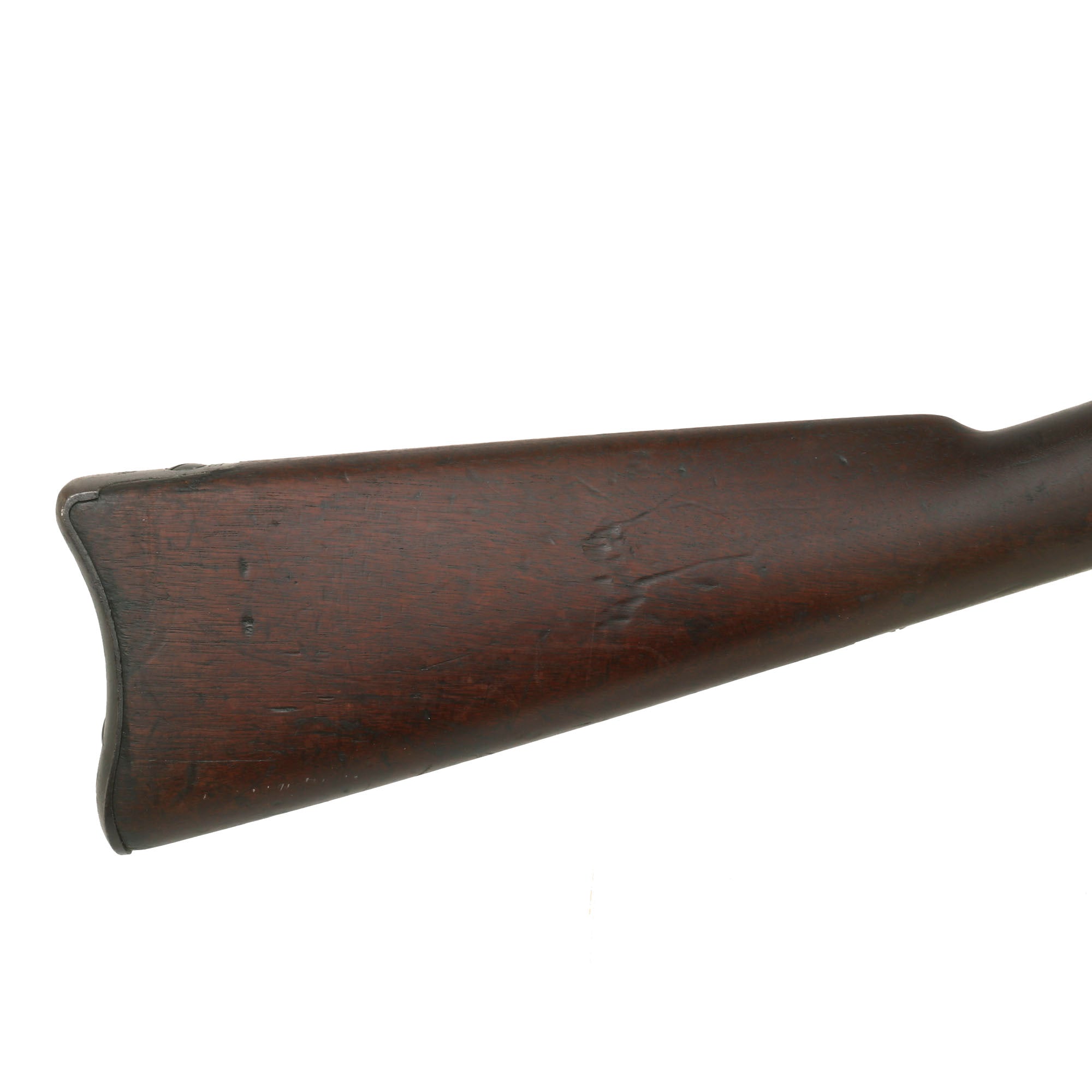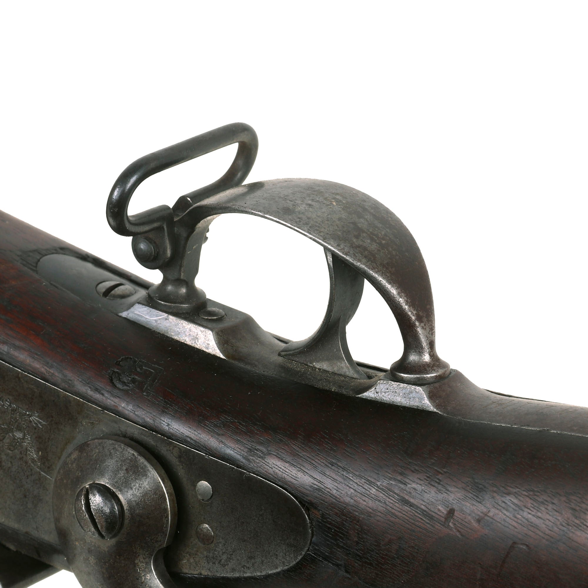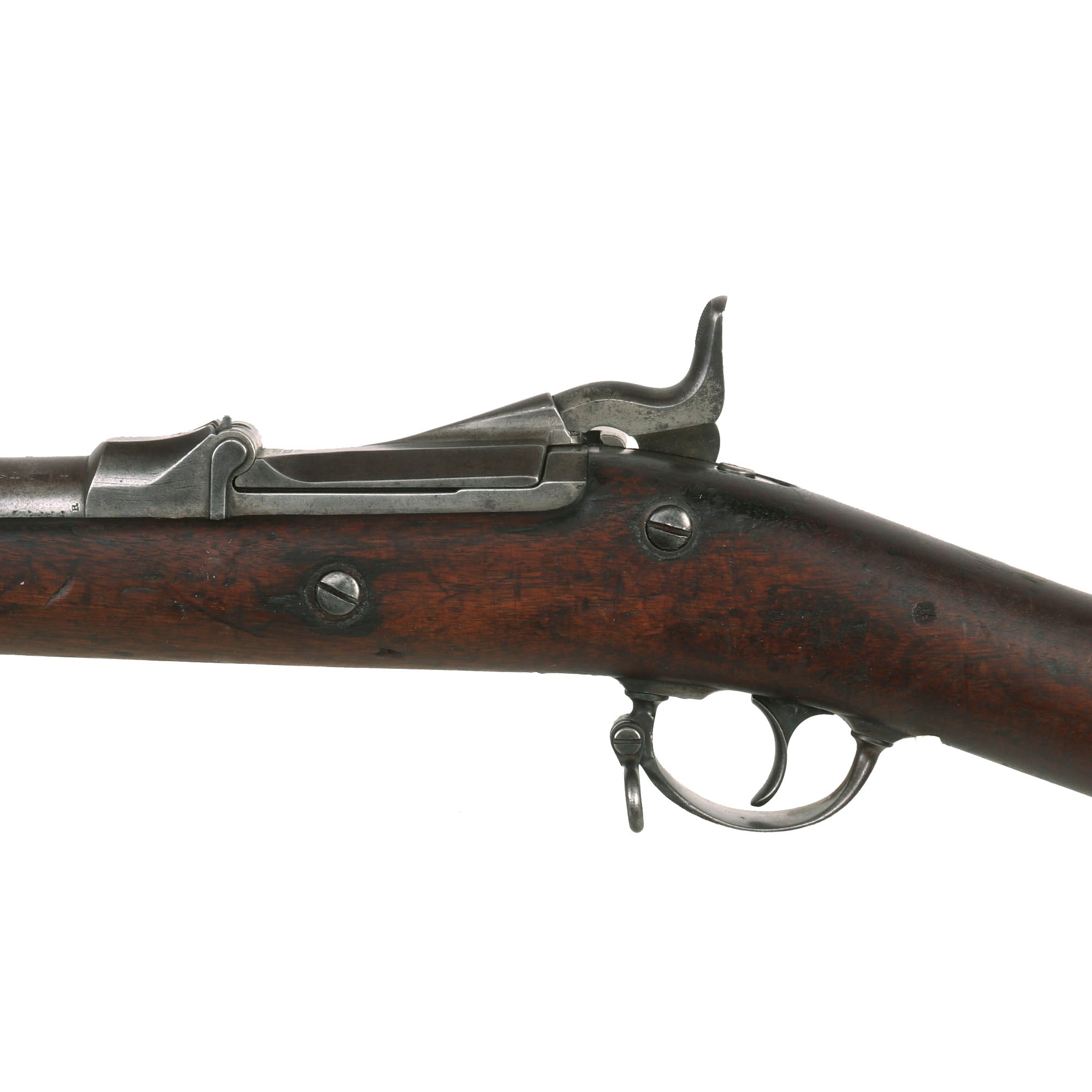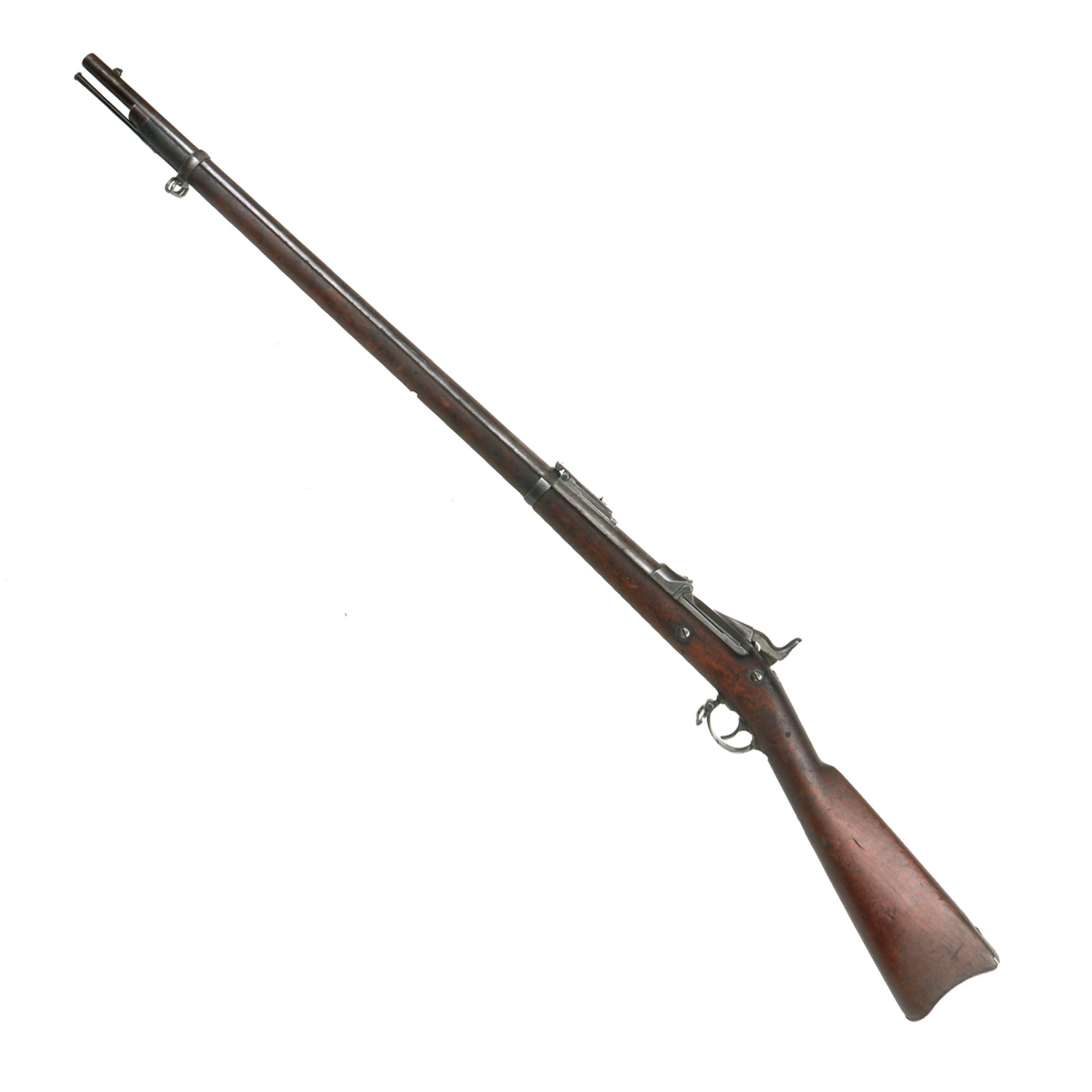 The both barrel bands are U marked, and the butt plate tang is marked with the correct U.S. stamp. Metal finish is a lovely aged gray patina from long service. Center fire breechloader, .45 cal., two bands, two sling swivels with stacking swivel, Buffington sight, with standard ramrod. Lock is marked with a Federal Eagle to the left of U.S. / SPRINGFIELD, indicating that it was manufactured at the United States Armory and Arsenal at Springfield, in Springfield, Massachusetts.