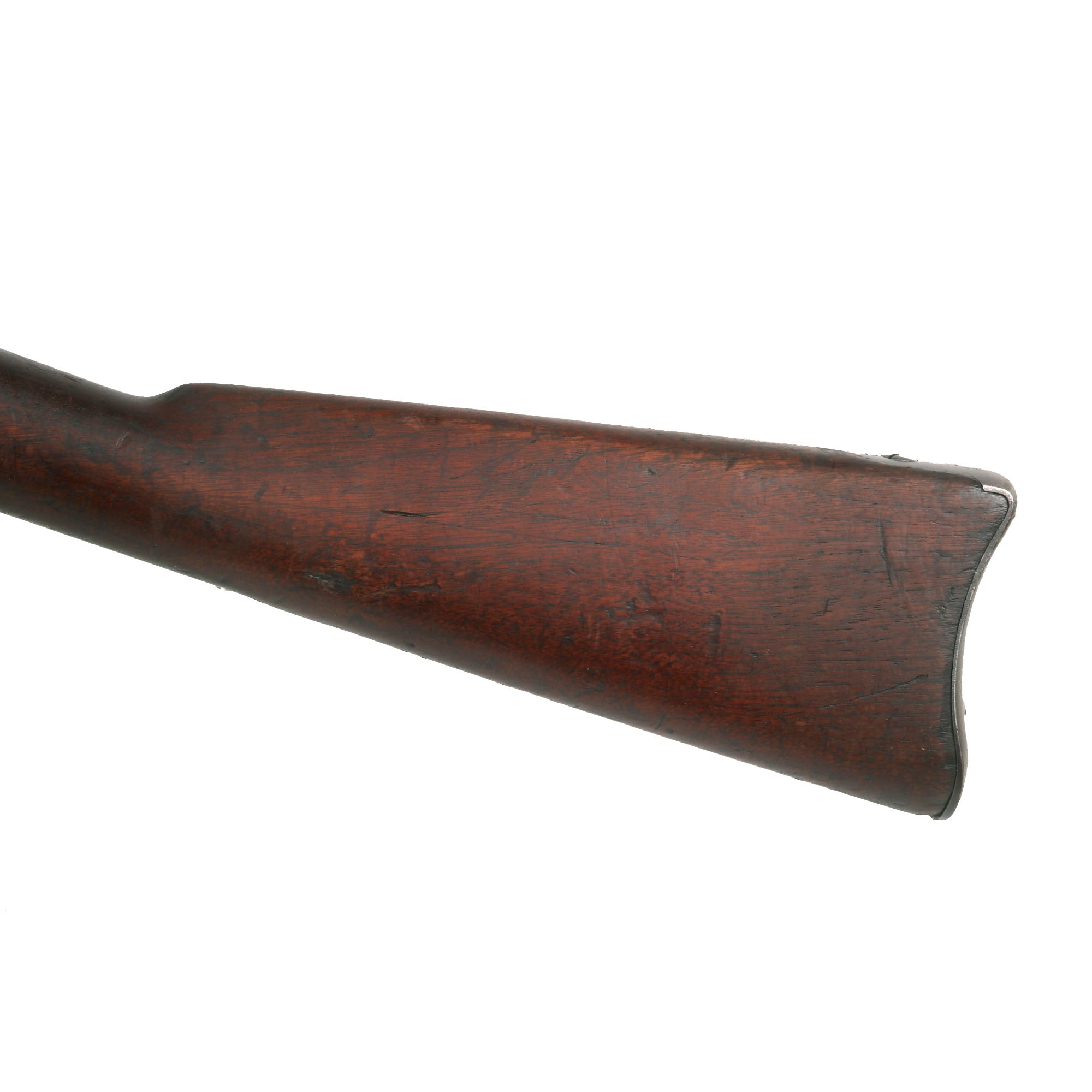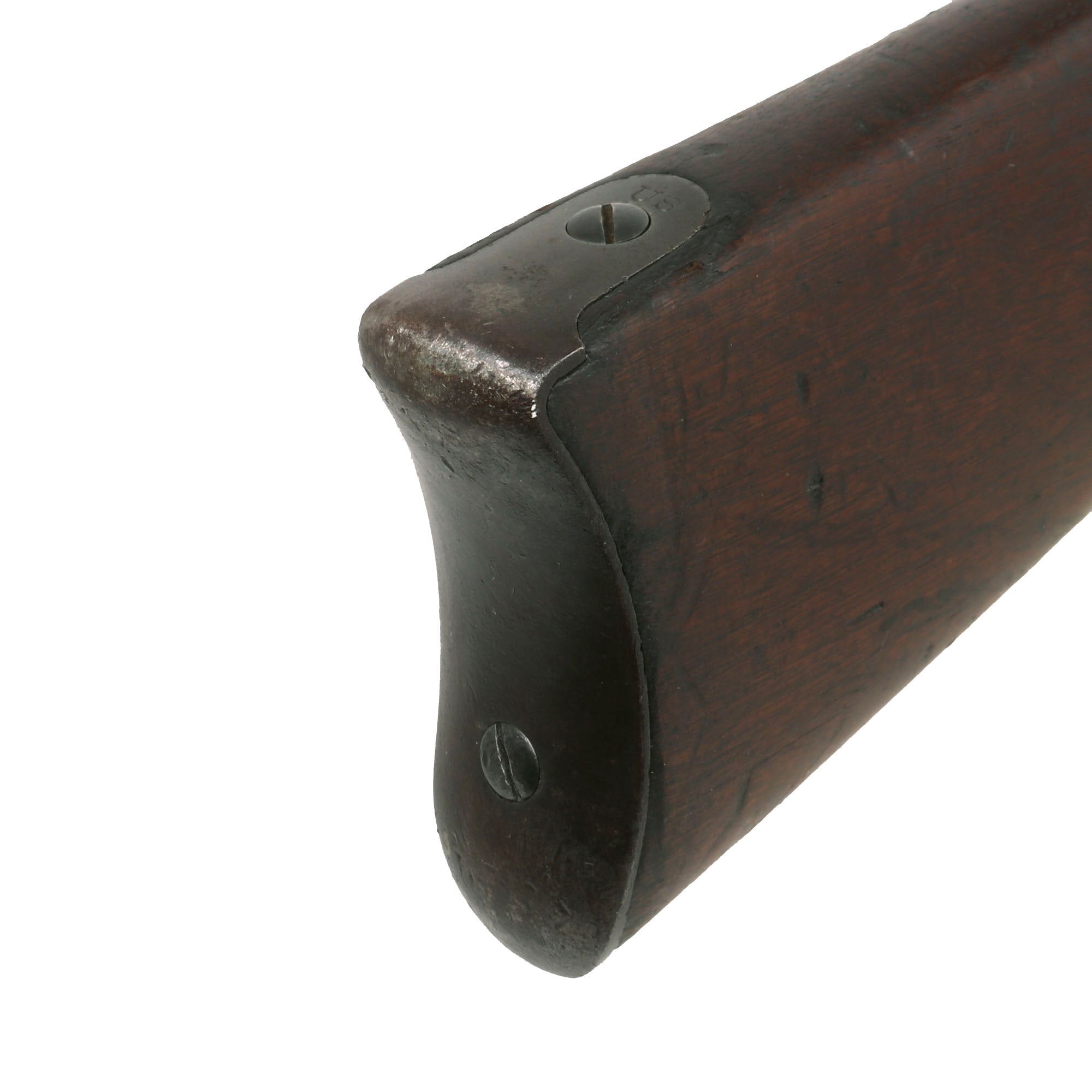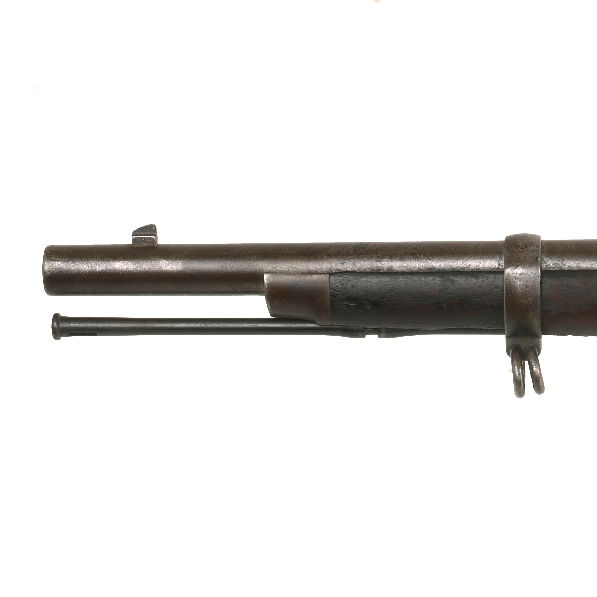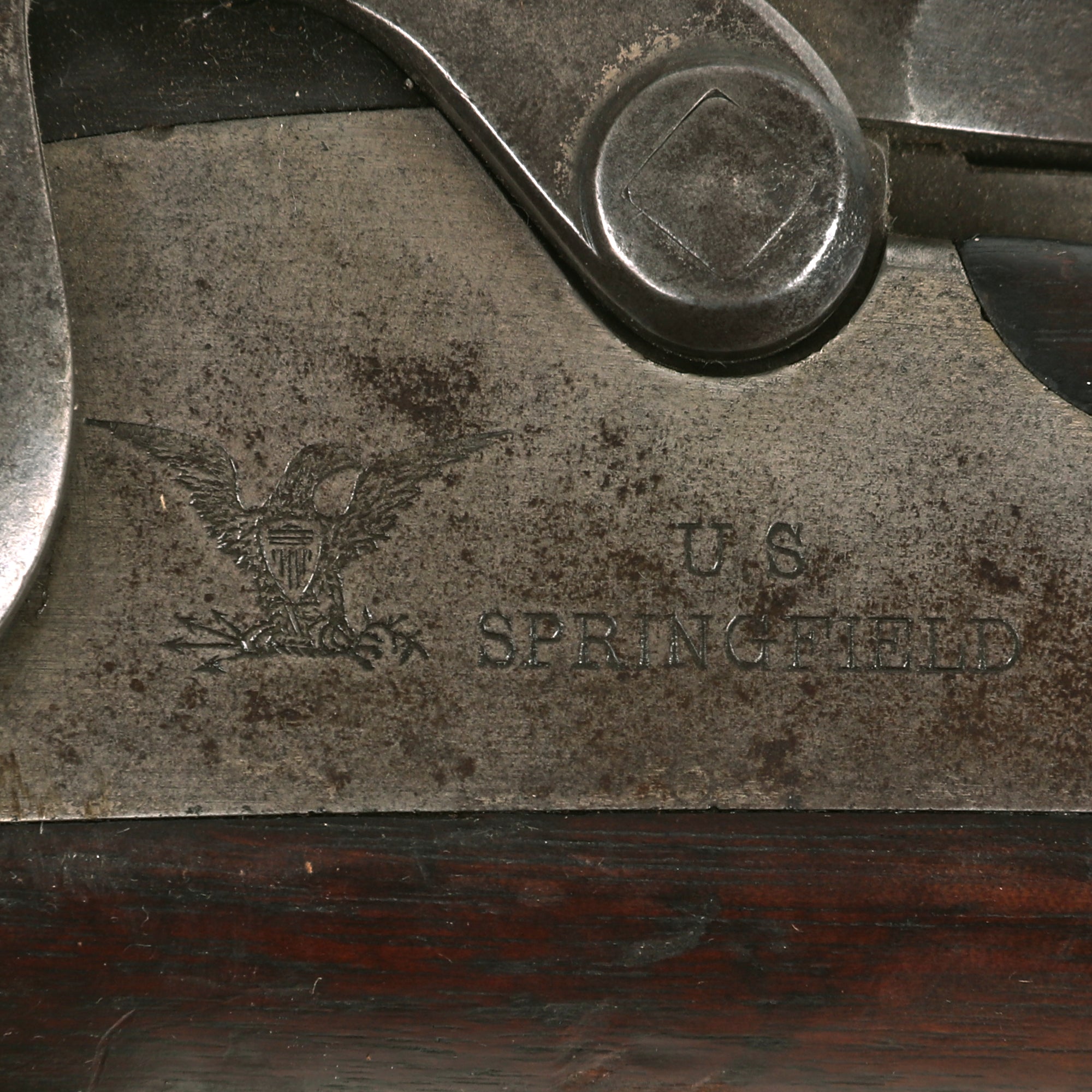 The both barrel bands are U marked, and the butt plate tang is marked with the correct U.S. stamp. Metal finish is a lovely aged gray patina from long service. Center fire breechloader, .45 cal., two bands, two sling swivels with stacking swivel, Buffington sight, with standard ramrod. Lock is marked with a Federal Eagle to the left of U.S. / SPRINGFIELD, indicating that it was manufactured at the United States Armory and Arsenal at Springfield, in Springfield, Massachusetts.