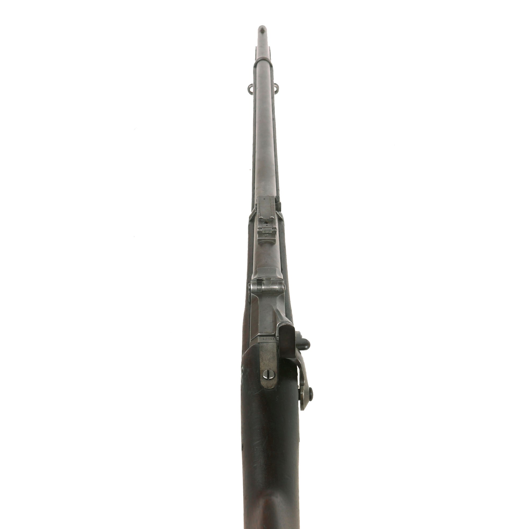 The bore is in very good condition, showing clear lands and grooves with a mostly bright finish. There is some wear to the lands, as well as a bit of past fouling in the grooves, now cleaned away. This was a rifle that did see some level of service, but was well cared for by cleaning the bore after use. The breech block moves correctly, locking closed and with an intact firing pin, and the extractor is still present and functional, though we have not tested it with real brass. The Buffington sight is fully functional, with all of the adjustments moving easily.