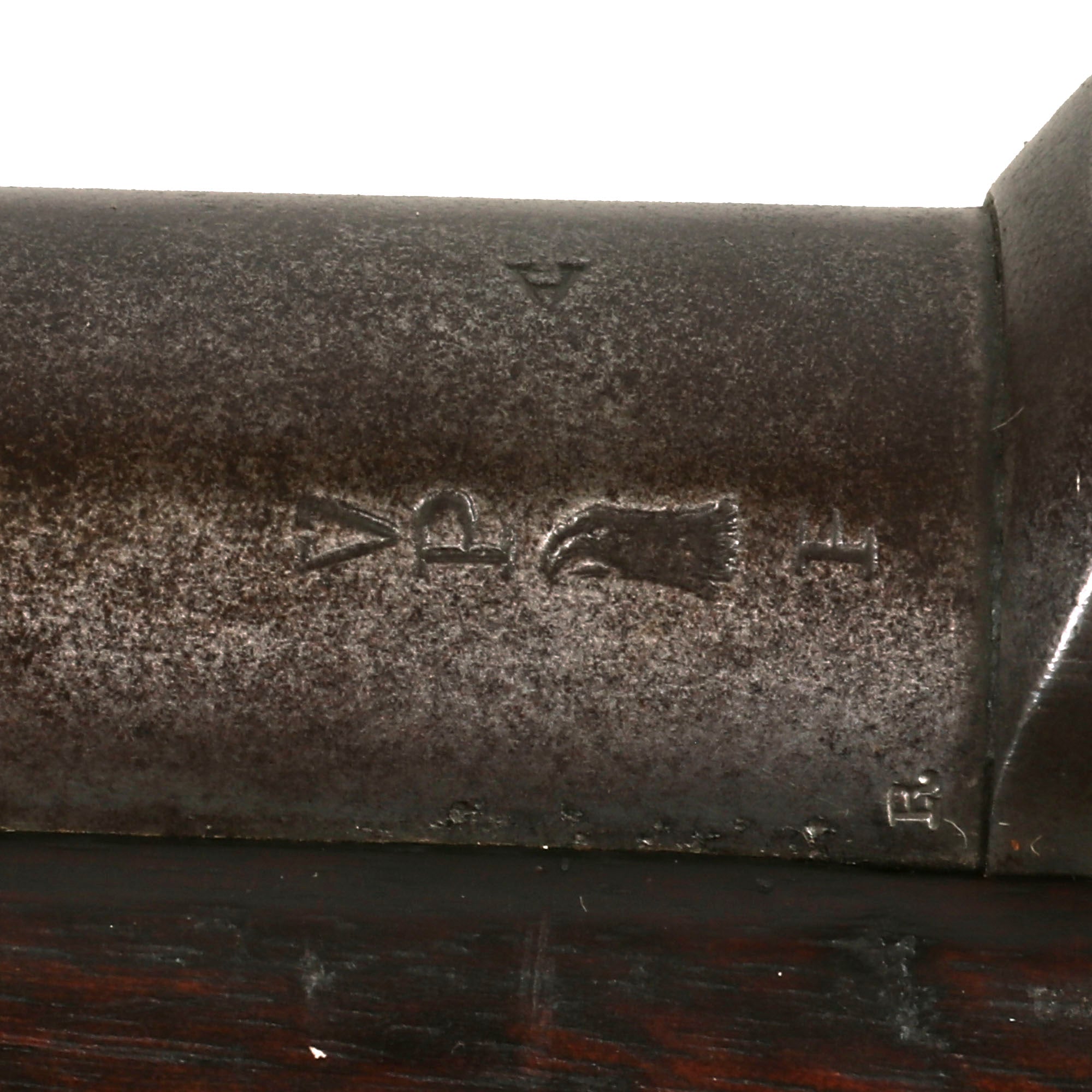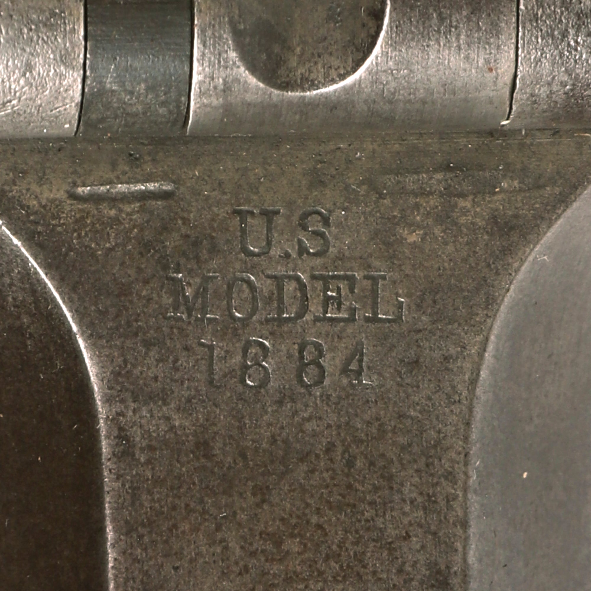 The elegant script SWP belongs to Samuel W. Porter, who was the Master Armorer and Chief Inspector of Springfield Armory from 15 September 1879 to 18 June 1894. A faint stylized P in a circle under the wrist of the stock indicates that the rifle passed all of its overpressure proof testing. Additional marks of interest include inspectors' and proof marks around the breech end of the barrel: a capital A on top and a V over a P over an eagle's head over another P on the left side just above the stock. The upper right corner of the Buffington sight leaf is marked R to indicate that the sight graduations are for a rifle and not a carbine.