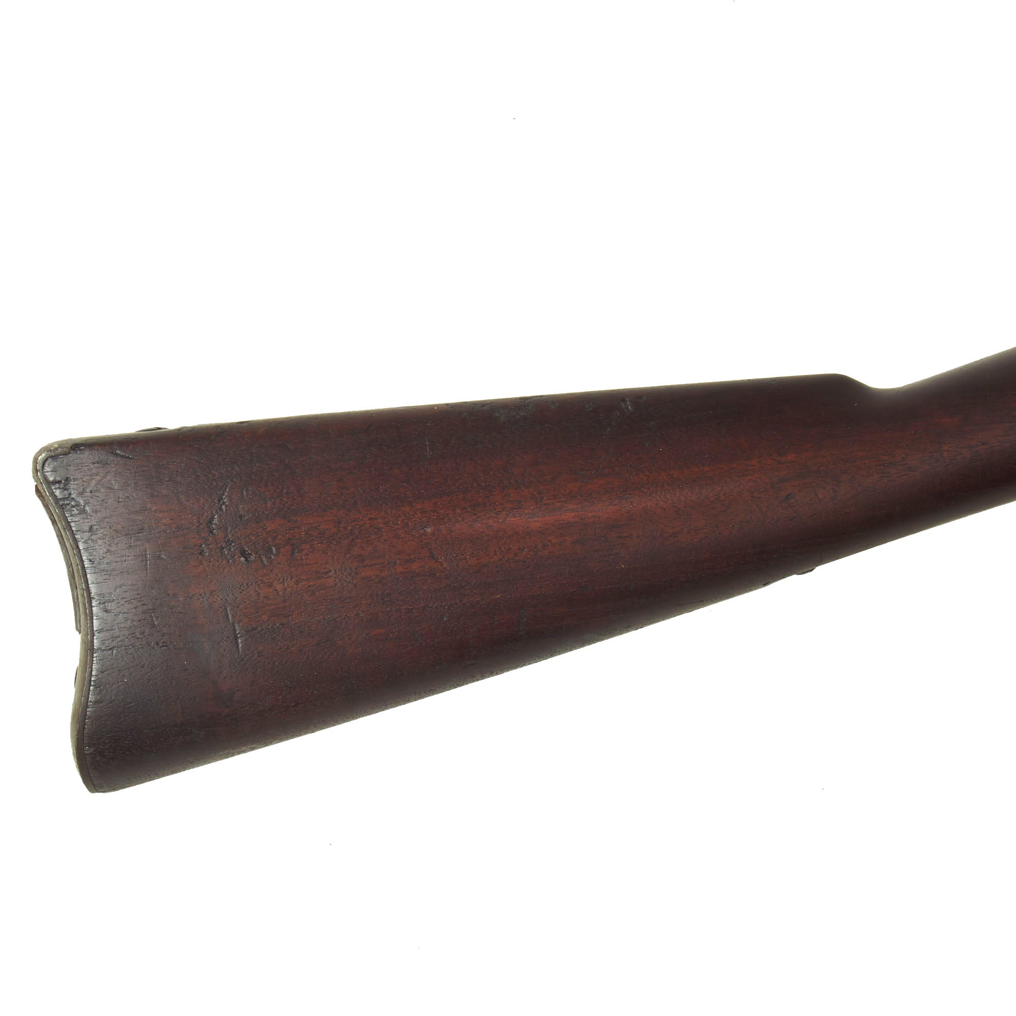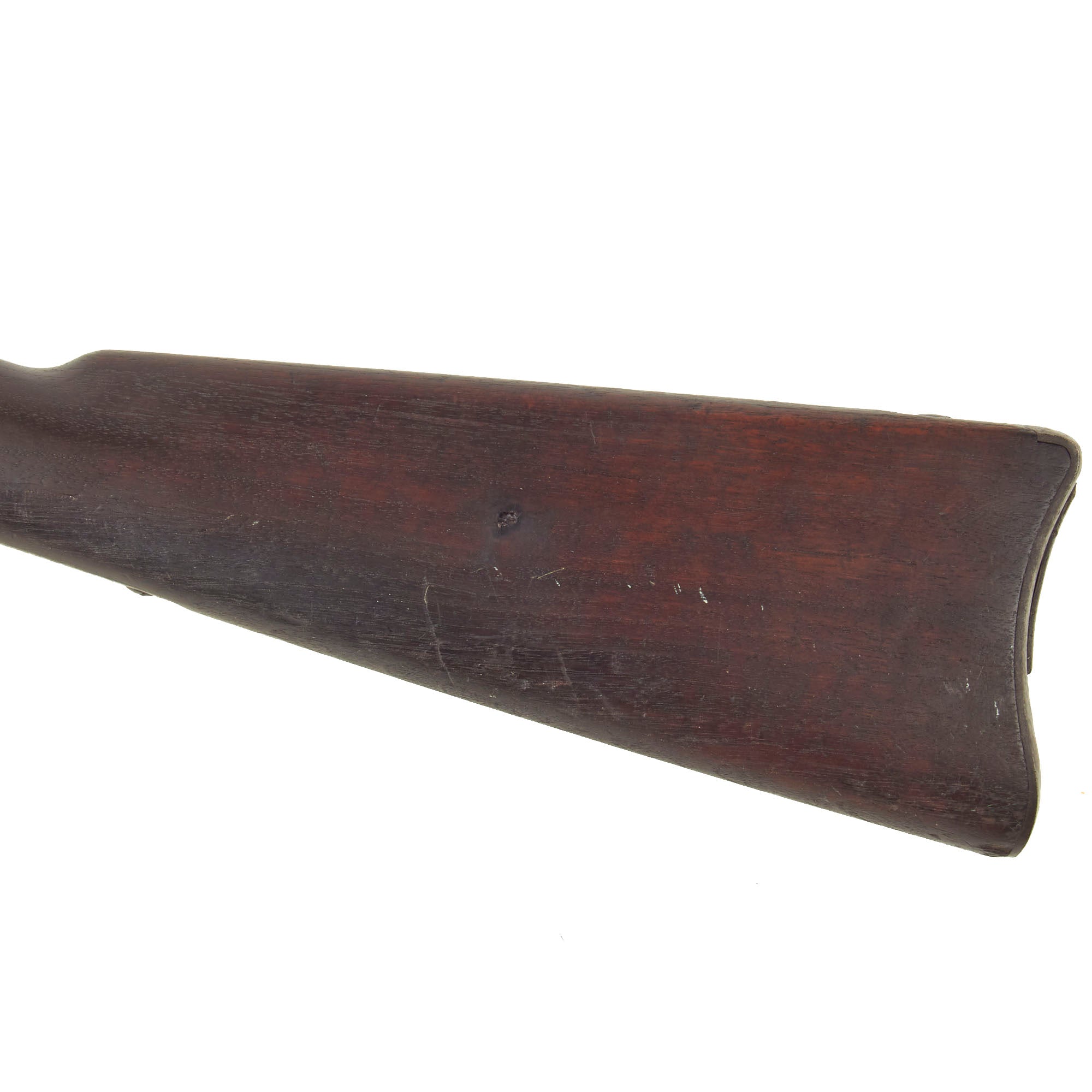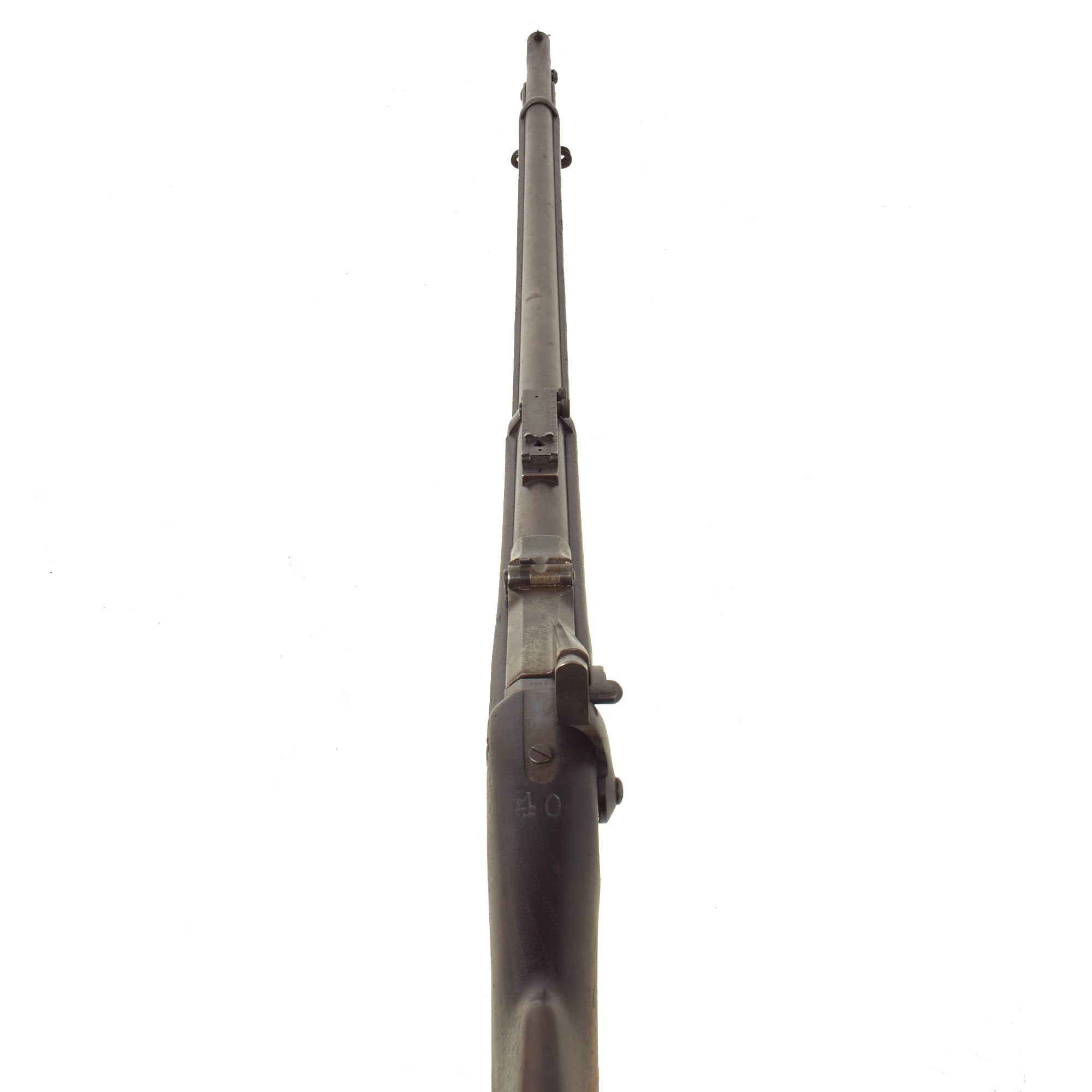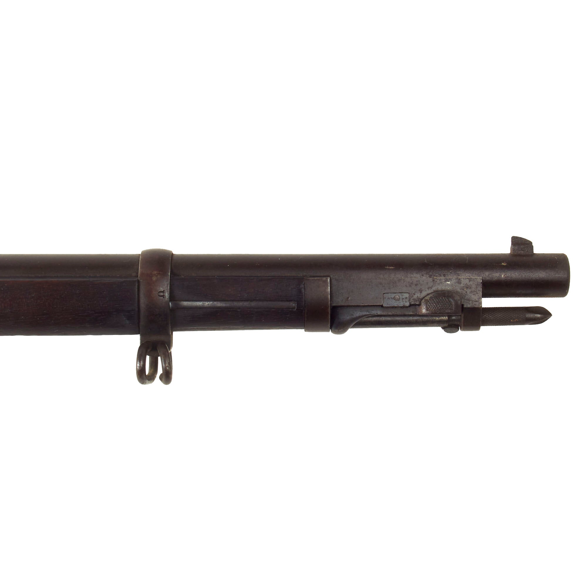 The metalwork on the rifle still shows areas of the original blued finish on the barrel and hardware, as well as some original case hardening on the receiver and on the underside of the breech block, something we rarely see! The rest of the metalwork has faded to a plum colored oxidized patina. The bore is in excellent condition, showing clear lands and grooves and a mostly bright finish. There are just a few spots of fouling and oxidation in the grooves, indicating only light service. The cleaning rod / bayonet is functional, with a worn finish, and intact threads on the end. The locking mechanism by the muzzle is fully functional.