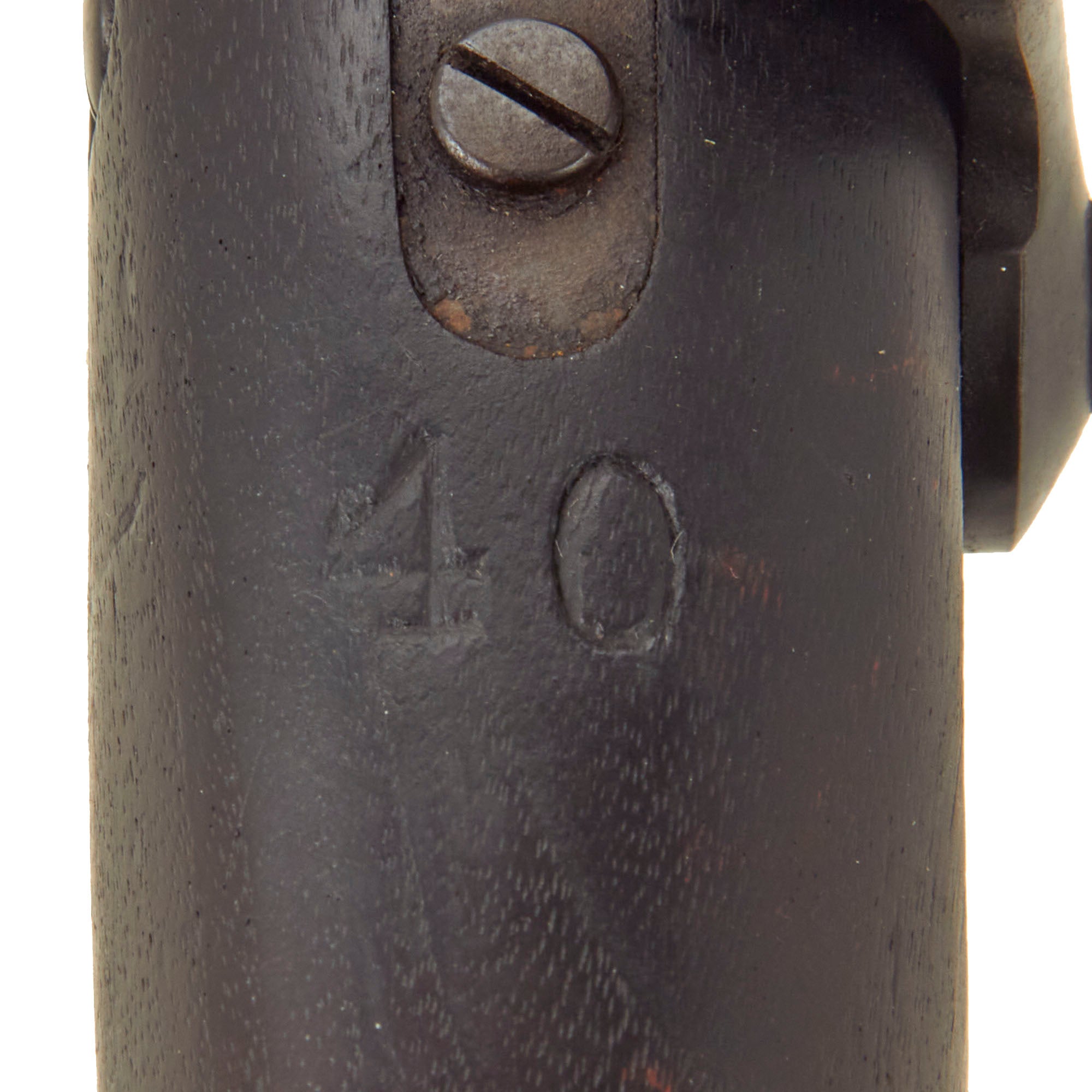 The stock is in very good condition, and is still fully proud over the lock plate, indicating the stock has not been worn down or reconditioned over the years. There are the usual dents and small chips from service, but it's got a lovely red brown color and patina, only achieved after decades. It does show some damage on the left side of the butt stock, which looks to show minor cracking from water exposure. Another nice feature on this example is the butt stock tool compartment, which is covered by a rotating door on the butt plate. This was used to store the take down tool and stuck cartridge extractor. Unfortunately this compartment is empty.