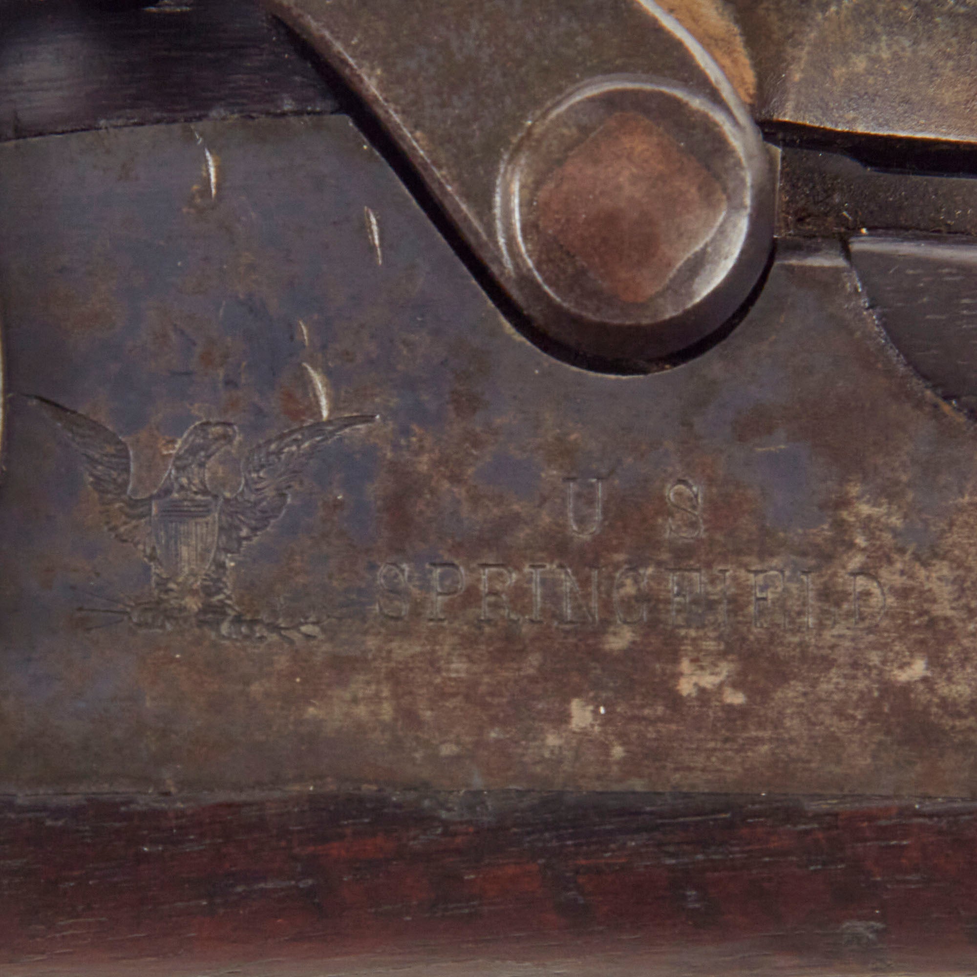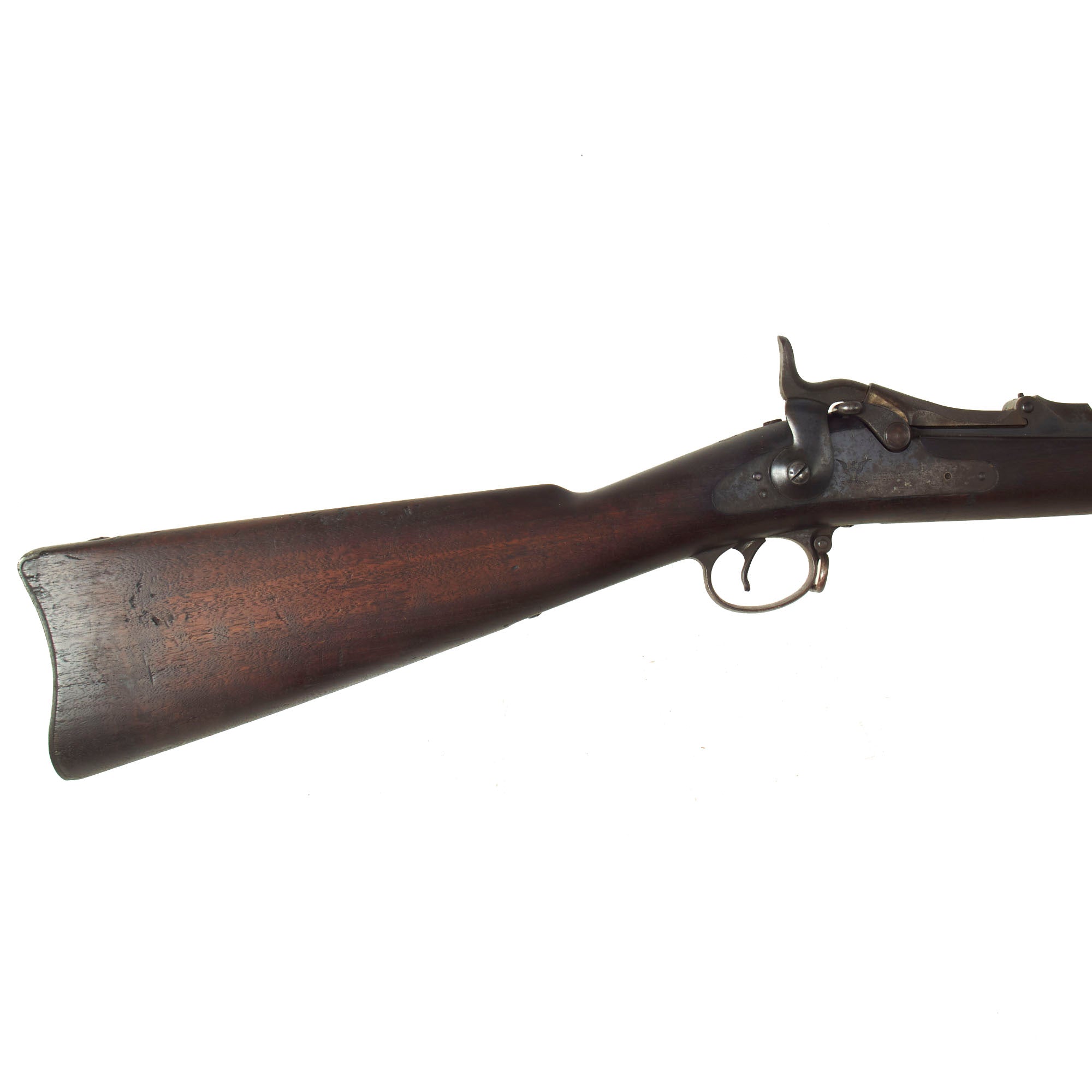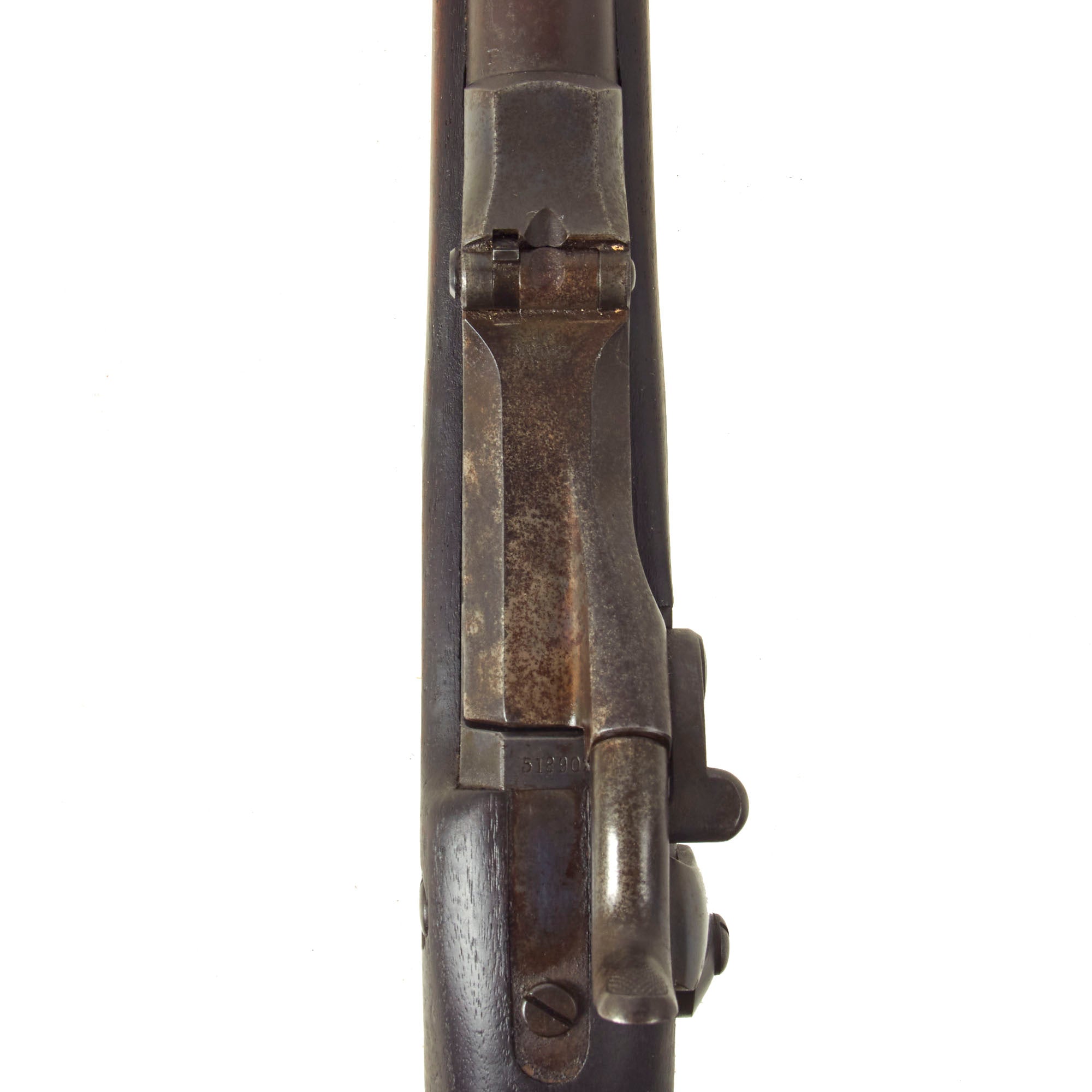 The both barrel bands are U marked, and the butt plate tang is marked with the correct U.S. stamp. Center fire breechloader, .45 cal., two bands, two sling swivels with stacking swivel, Buffington sight, sliding ramrod bayonet. Lock is marked with an eagle and U.S. / SPRINGFIELD, manufactured at the United States Armory and Arsenal at Springfield, in Springfield, Massachusetts. The lock is fully functional, and the cartridge extractor is intact and functional, though we have not tested it on spent brass. The rear sight is fully functional, with both range and windage easily adjustable.