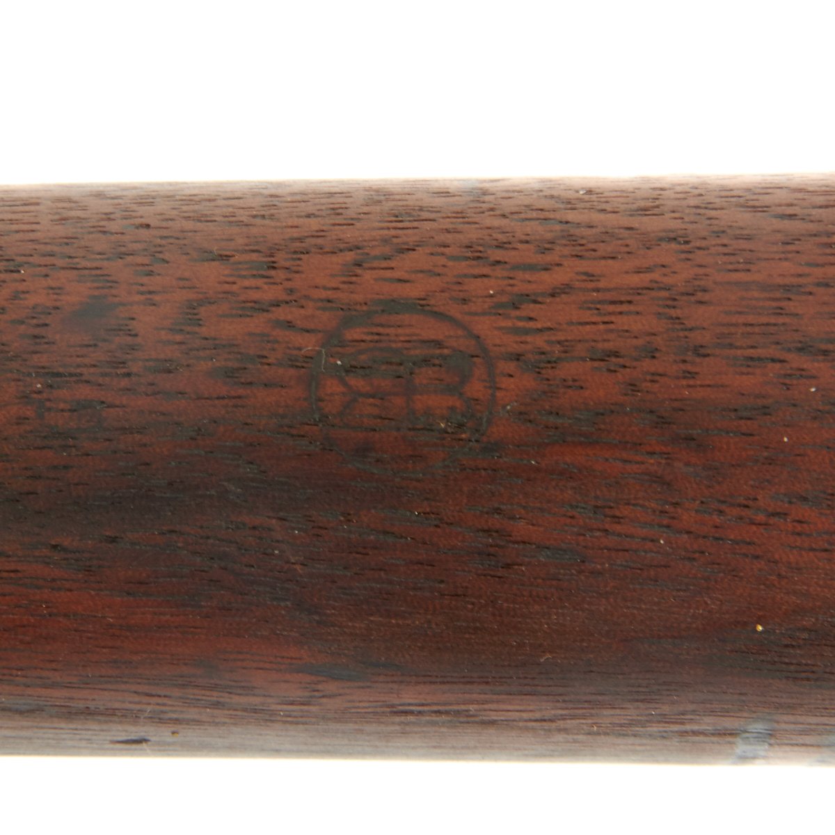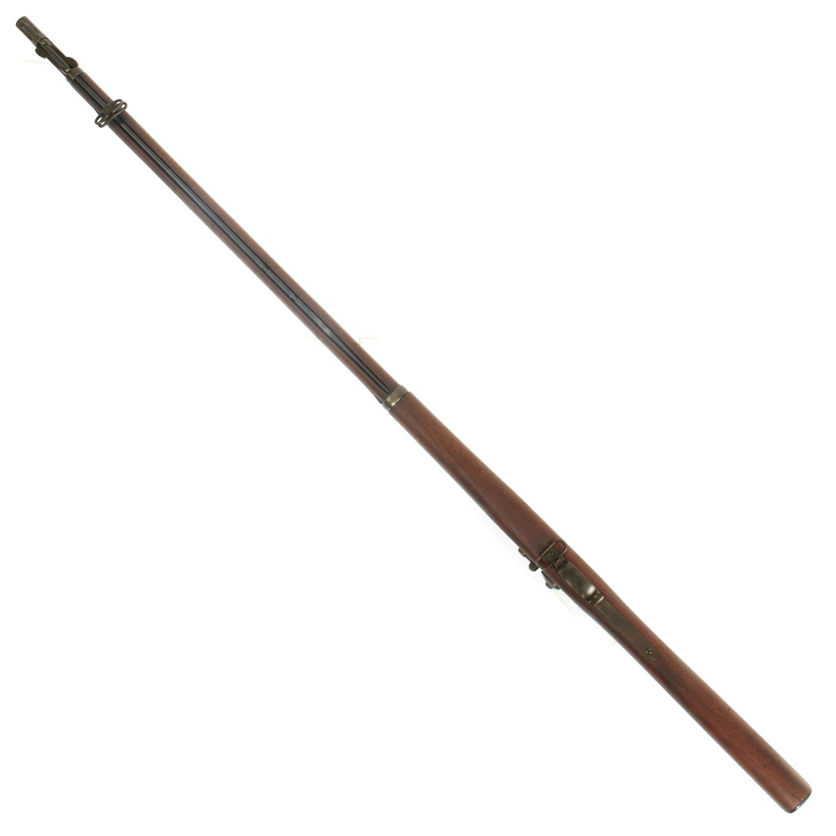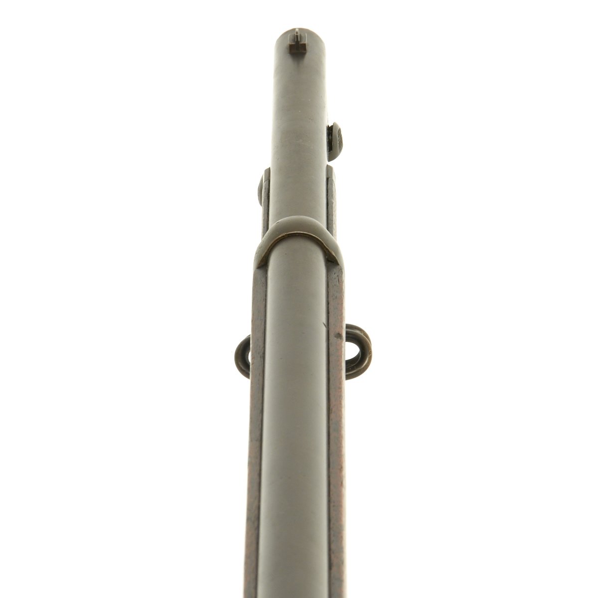 The hardware is in solid condition, with most of the original finish remaining. There are are few spots of light pitting, but otherwise the finish is very nice. The bore is in very good condition, with sharp lands and grooves and a mostly bright finish, with a few oxidized areas in the lands. The cleaning rod / bayonet is in very good shape, with intact threads and a good deal of the original finish.