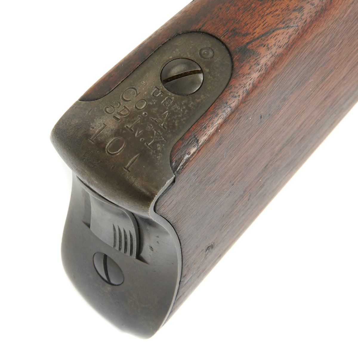 Offered in very good condition is this trapdoor rifle in 45-70 government caliber. Serial #511316 indicates manufacture in 1891, with a government inspector SWP / 1891 cartouche, indicating inspection in the same year. Original metal finish with all proofs still present. The butt plate is marked U.S. and both barrel bands are U marked. Additionally, the butt plate is marked Co. A / 3d N.Y. / 101, for "A" Company of the 3rd New York Regiment.