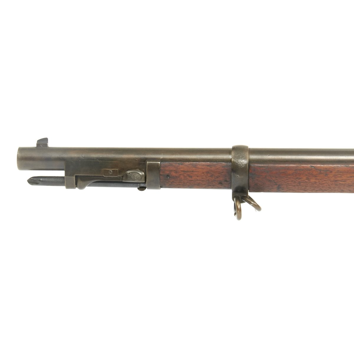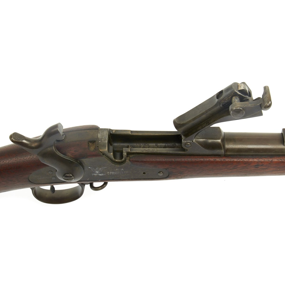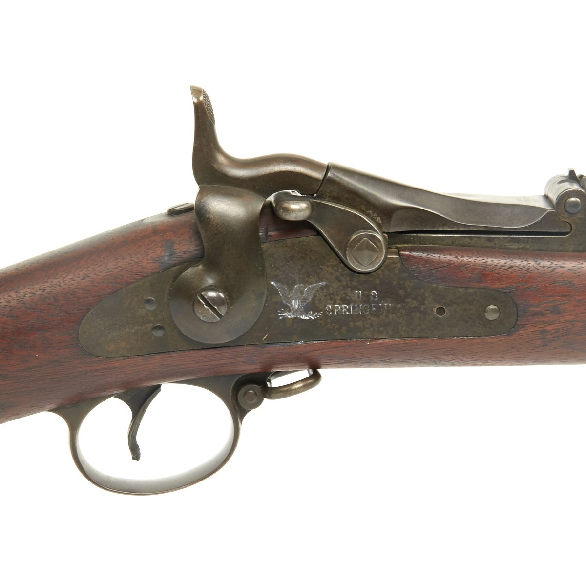Center fire breechloader, .45 cal., two bands, two sling swivels with stacking swivel, Buffington sight, sliding ramrod bayonet. Lock is marked with an eagle and U.S. SPRINGFIELD manufactured by Springfield Armory, Springfield Massachusetts.