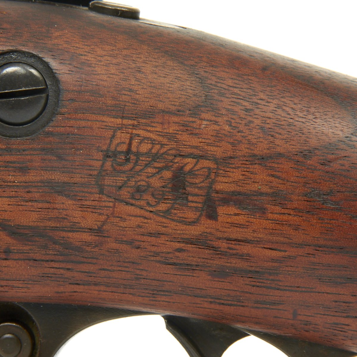 The elegant script SWP belongs to Samuel W. Porter, who was the Master Armorer and Chief Inspector of Springfield Armory from 15 September 1879 to 18 June 1894. A stylized P in a circle under the wrist of the stock indicates that the rifle passed all of its overpressure proof testing. Additional marks of interest include inspectors' and proof marks around the breech end of the barrel: a capital I on top; and a V over a P over an eagle's head over another P on the left side just above the stock. The upper right corner of the Buffington sight leaf is marked R to indicate that the sight graduations are for a rifle and not a carbine.