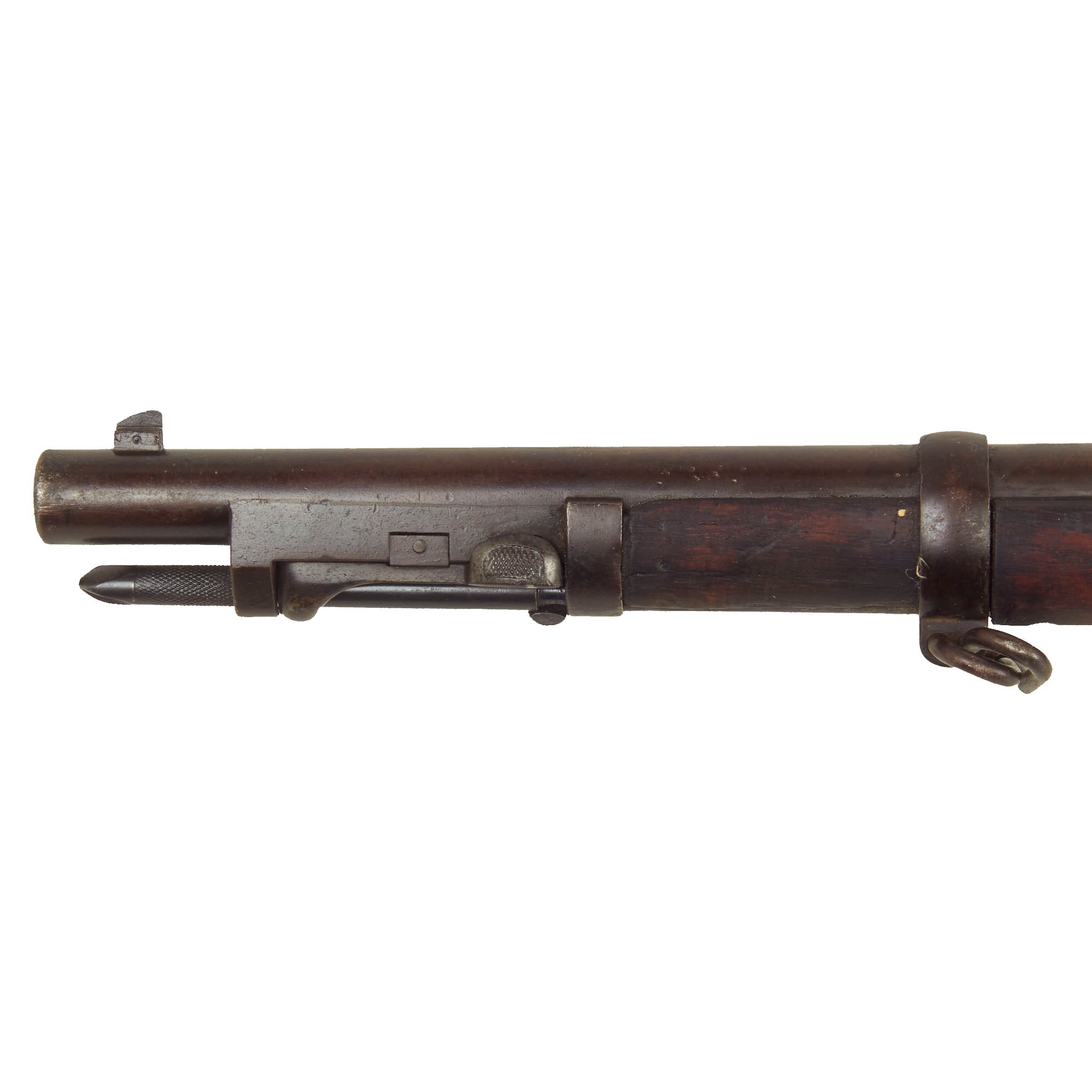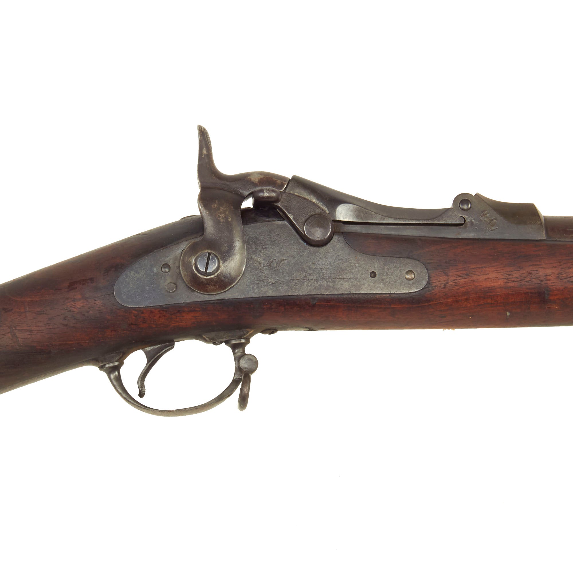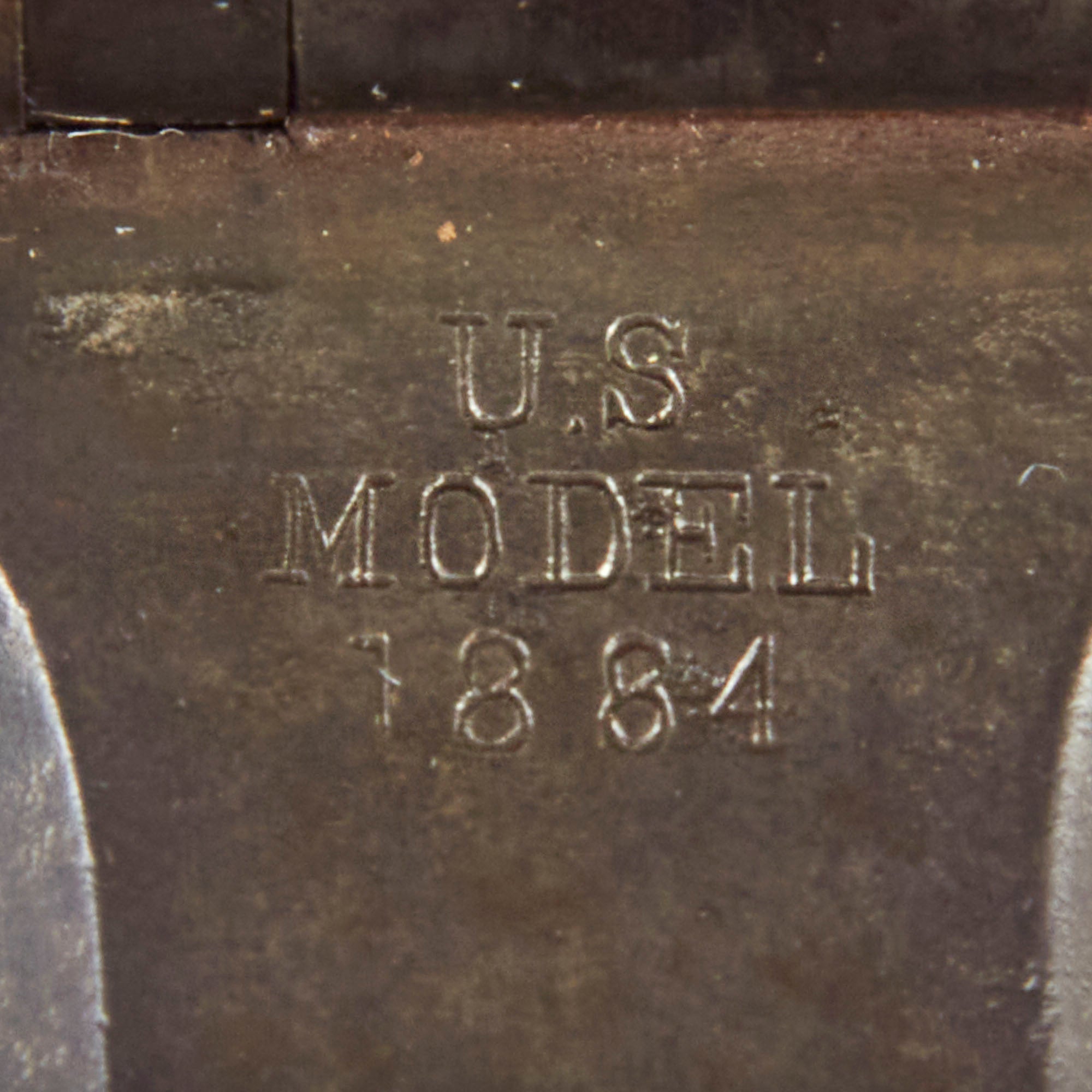 The both barrel bands are U marked, and the butt plate tang is marked with the correct U.S. stamp. Center fire breechloader, .45 cal., two bands, two sling swivels with stacking swivel, Buffington sight, sliding ramrod bayonet. Lock is marked with an eagle and U.S. / SPRINGFIELD, manufactured at the United States Armory and Arsenal at Springfield, in Springfield, Massachusetts. The lock is fully functional, and the cartridge extractor is intact and functional, though we have not tested it on spent brass. The rear sight is fully functional, with both range and windage easily adjustable.