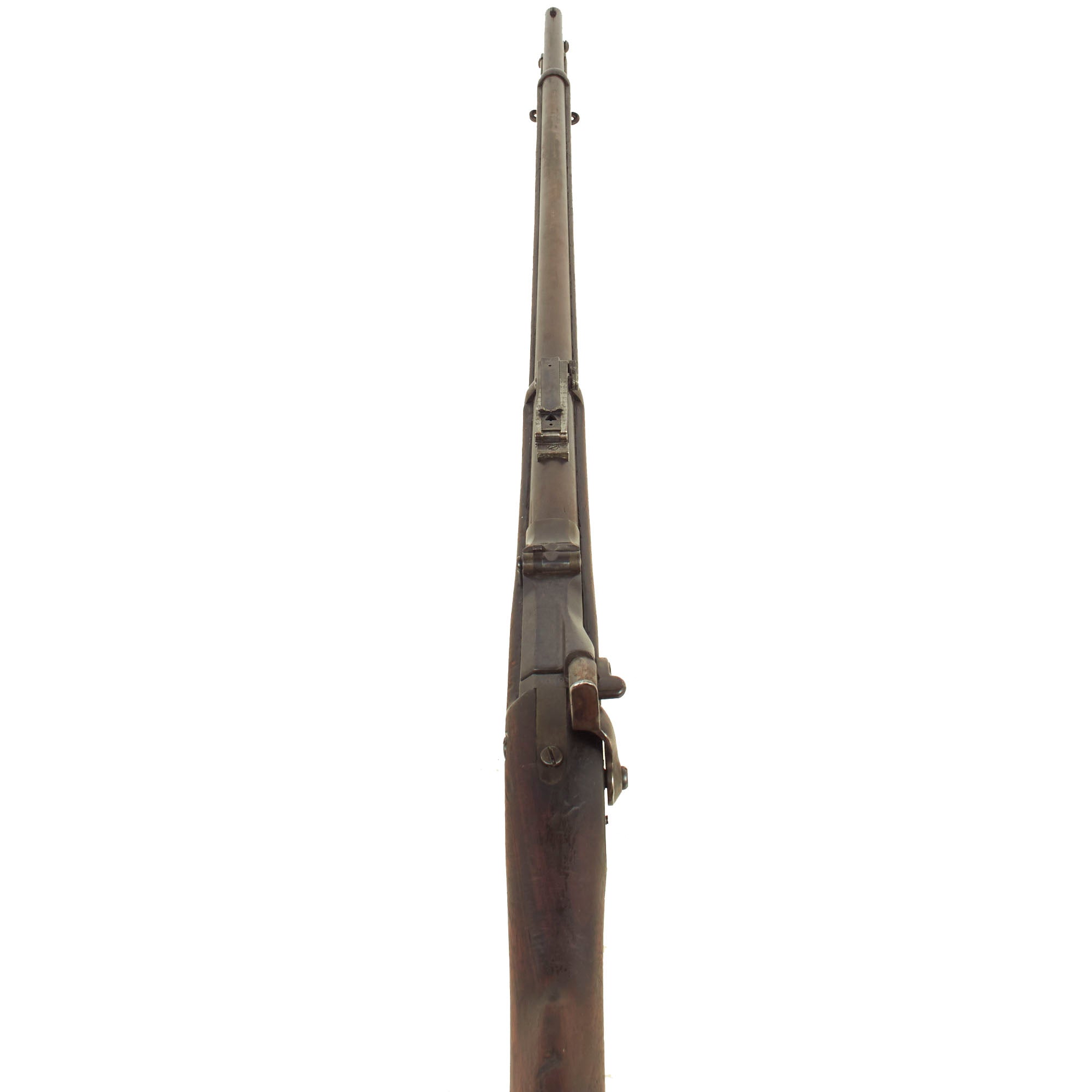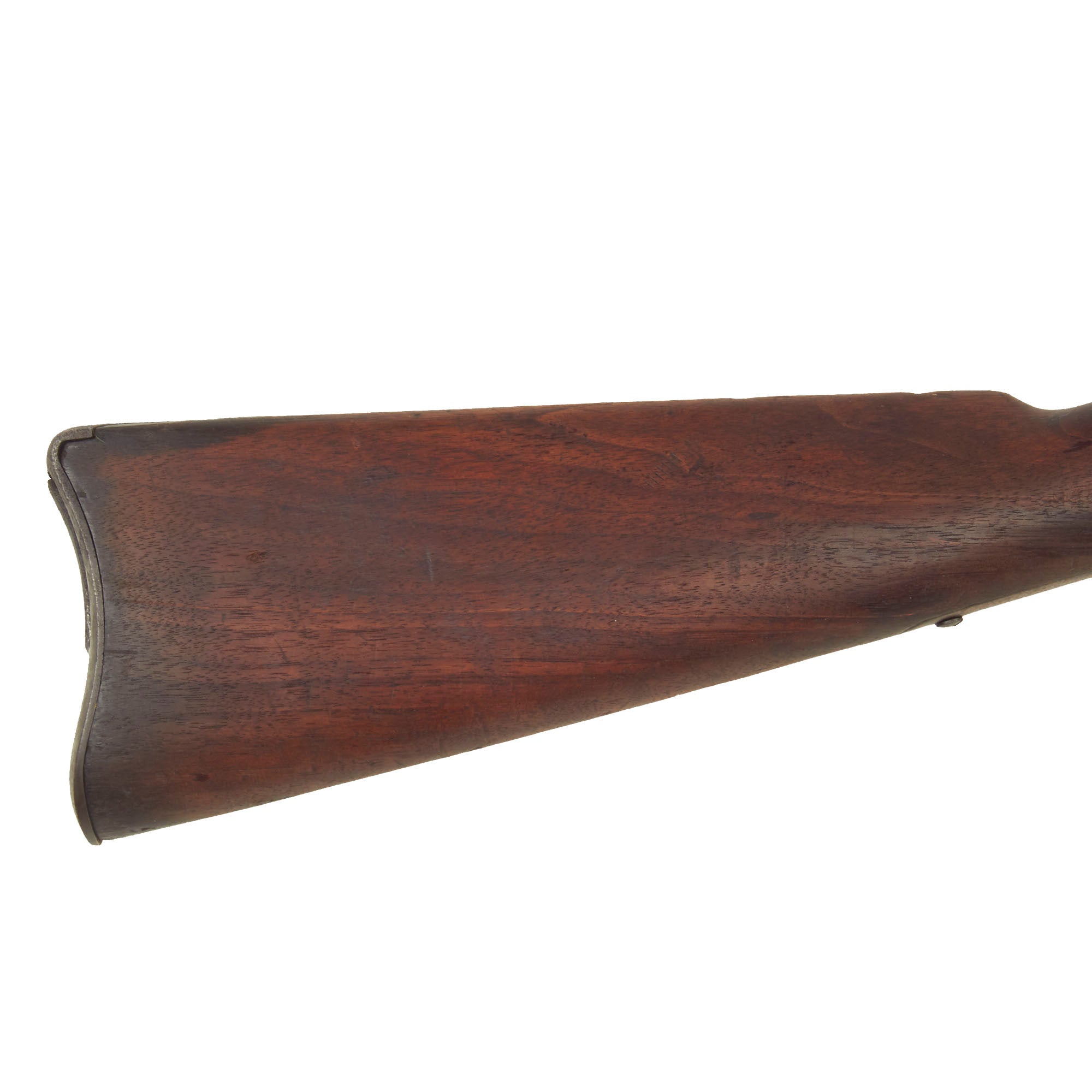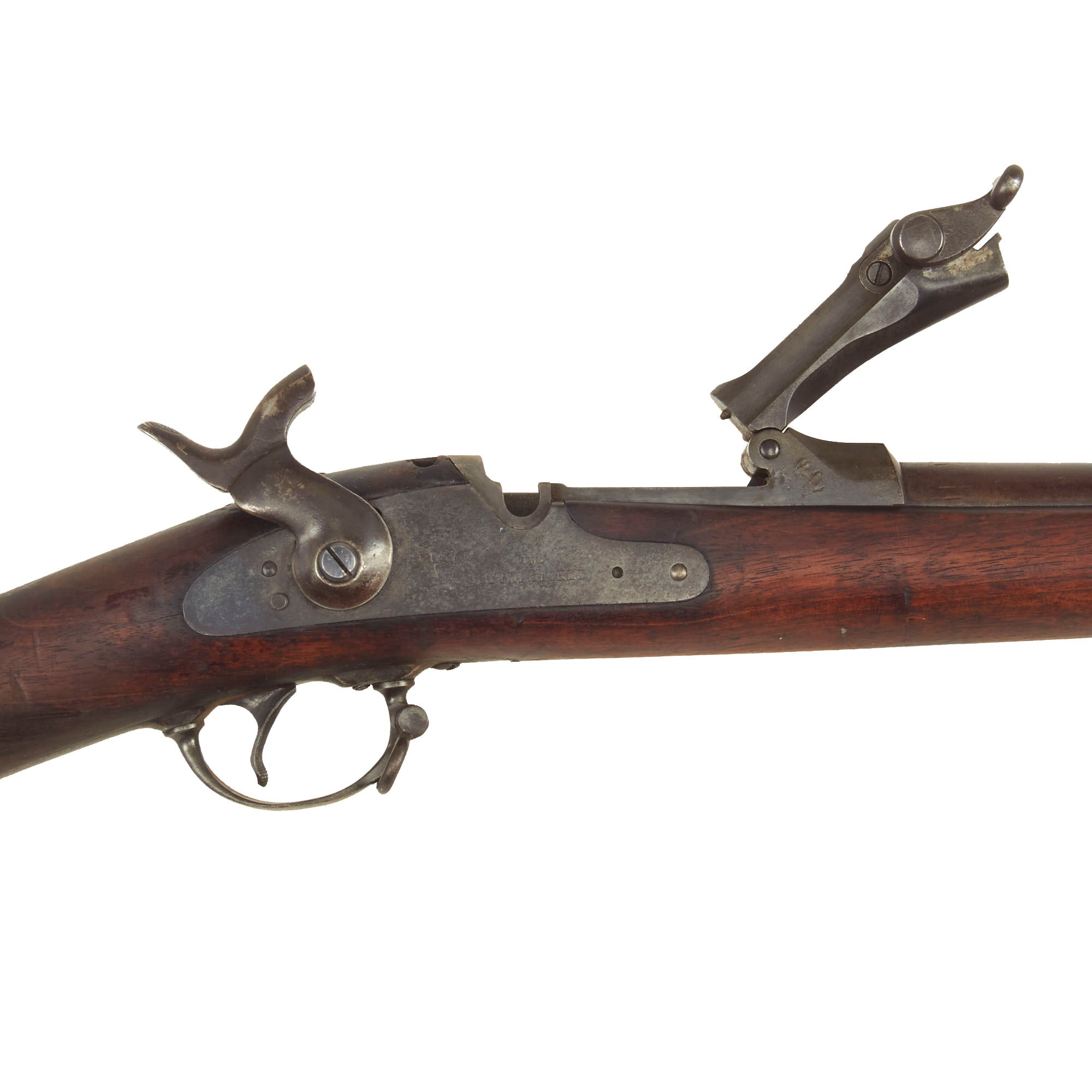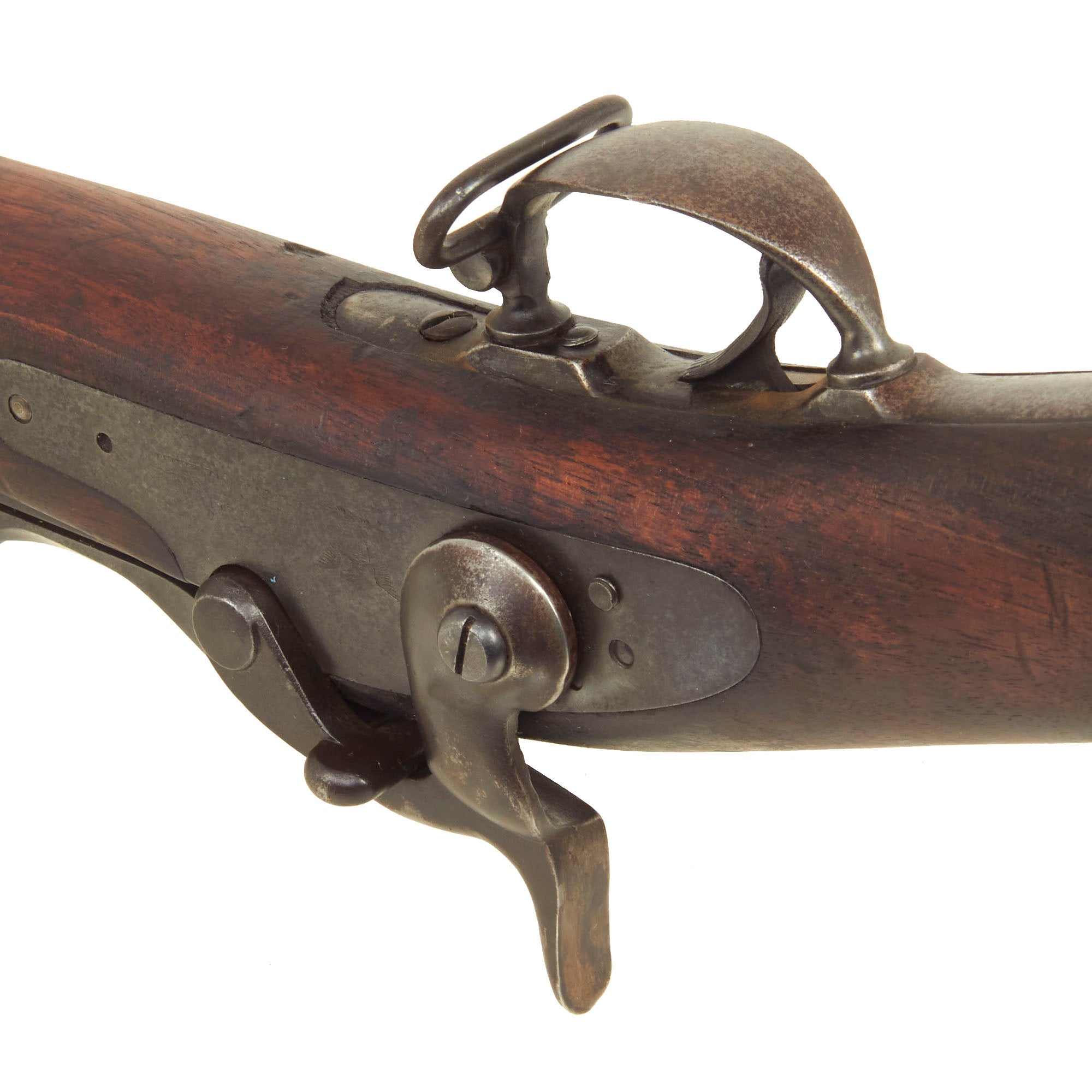 The both barrel bands are U marked, and the butt plate tang is marked with the correct U.S. stamp. Center fire breechloader, .45 cal., two bands, two sling swivels with stacking swivel, Buffington sight, sliding ramrod bayonet. Lock is marked with an eagle and U.S. / SPRINGFIELD, manufactured at the United States Armory and Arsenal at Springfield, in Springfield, Massachusetts. The lock is fully functional, and the cartridge extractor is intact and functional, though we have not tested it on spent brass. The rear sight is fully functional, with both range and windage easily adjustable.