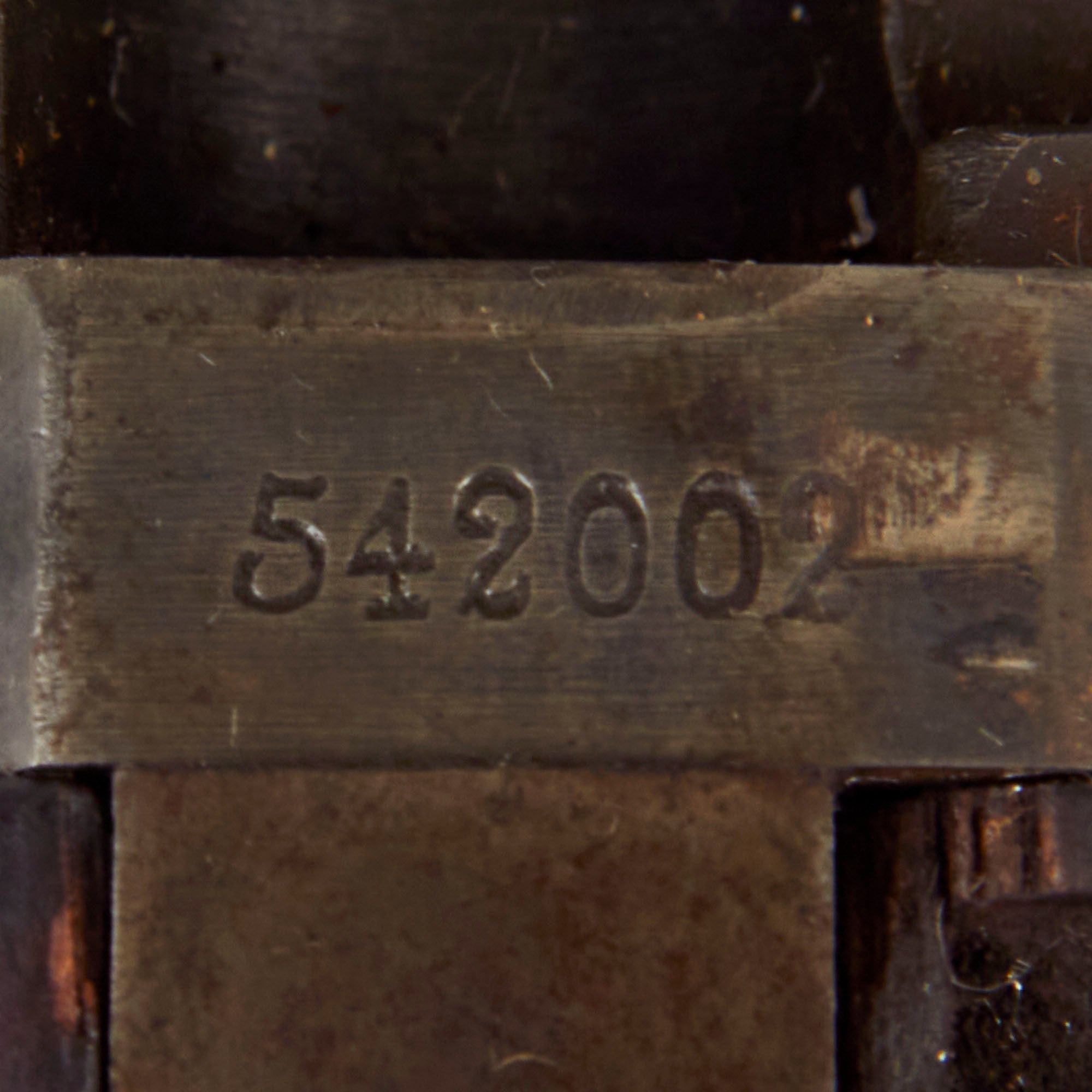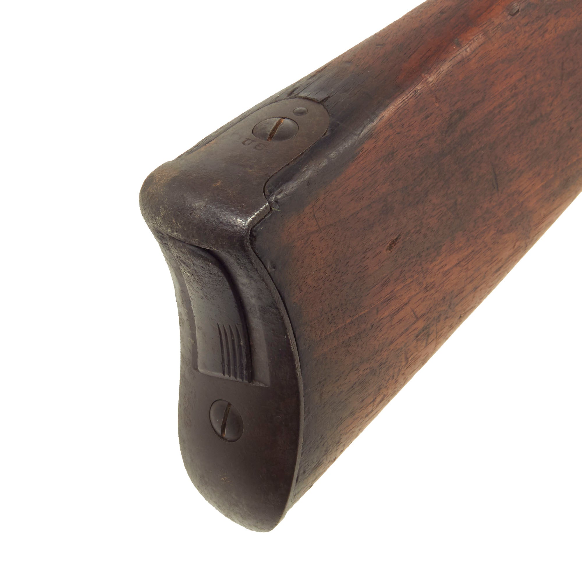 The stock is in very good service used condition, and is still partly proud over the lock plate, indicating the stock has not been worn down or reconditioned over the years. There are the usual dents and chips from service, but it's got a lovely red brown color and patina, only achieved after decades. It does show damage and staining on the butt stock next to the butt plate, due to water exposure. Another nice feature on this example is the butt stock tool compartment, which is covered by a rotating door on the butt plate. This was used to store the take down tool and stuck cartridge extractor. Unfortunately this compartment is empty.