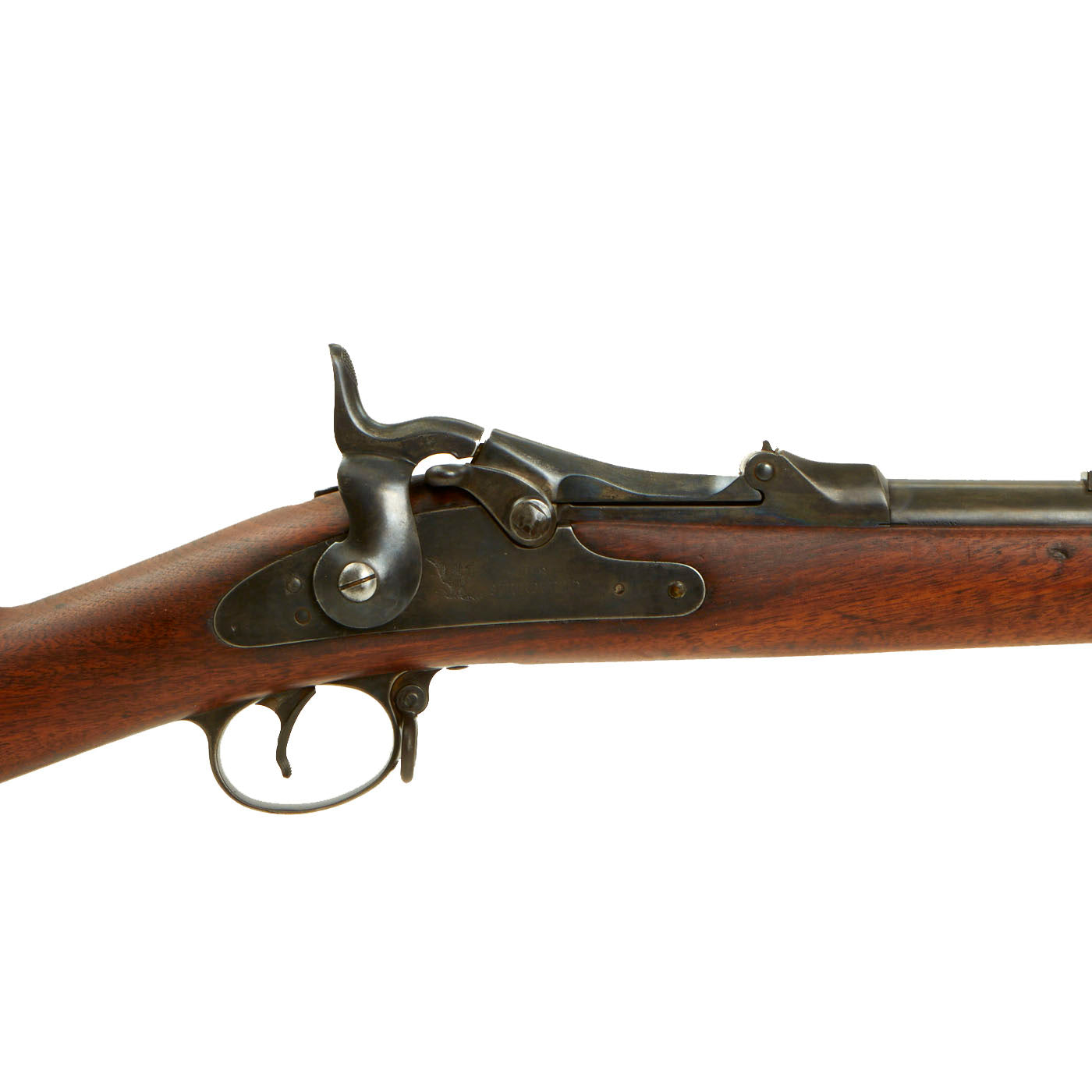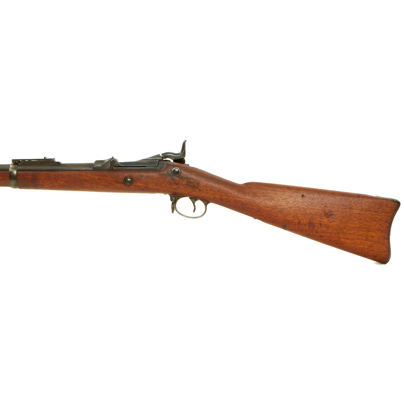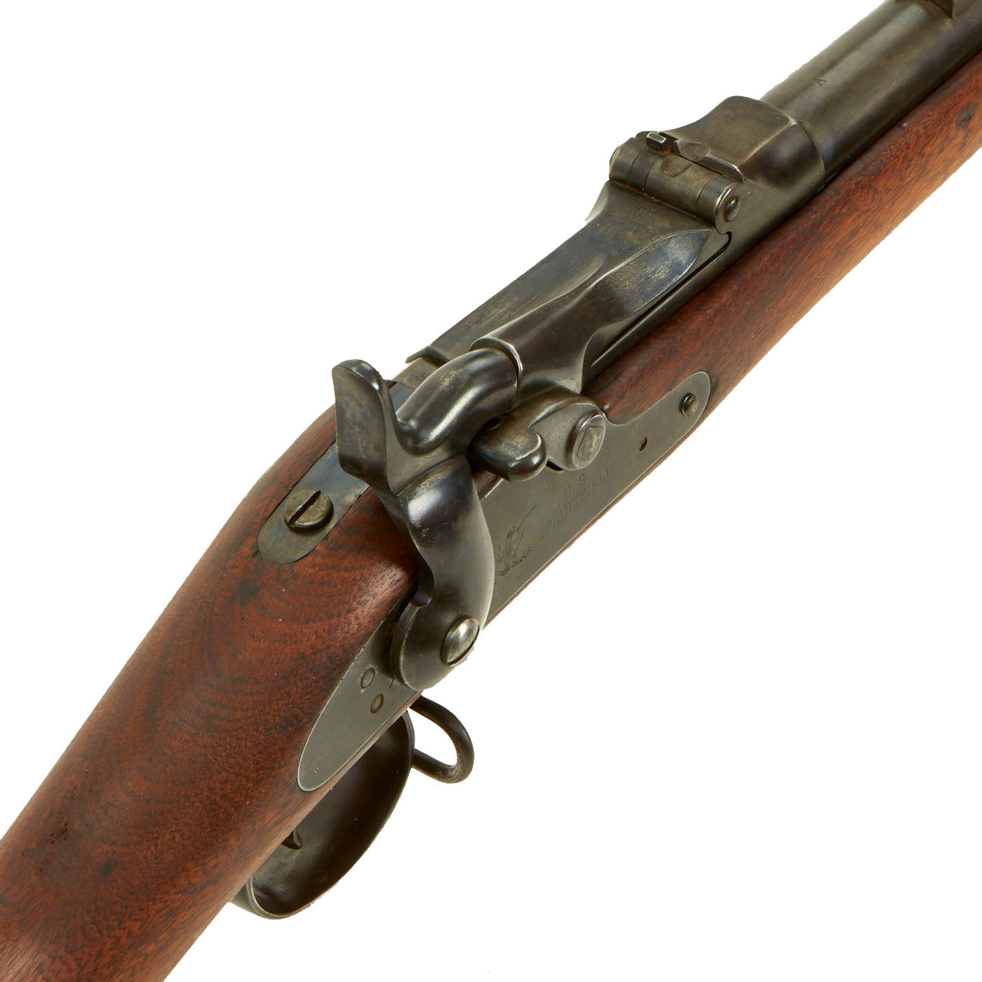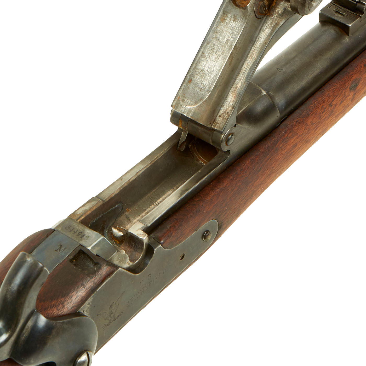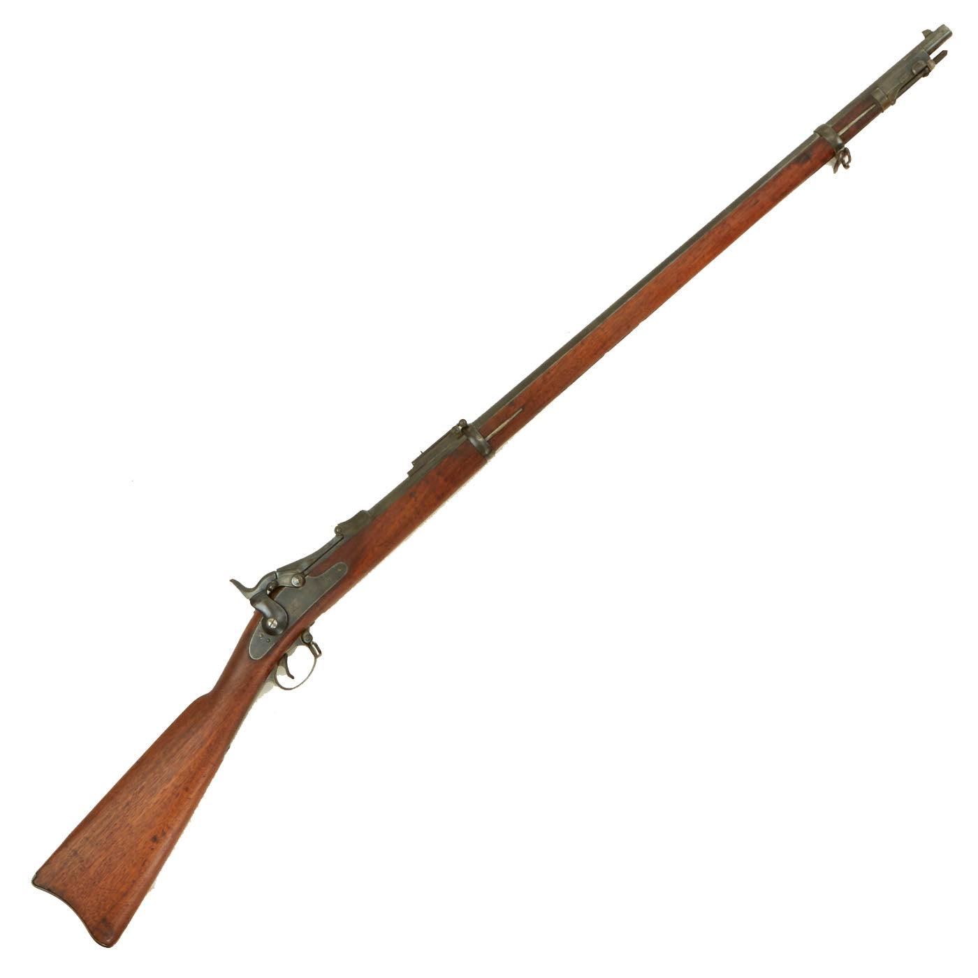 Center fire breechloader, .45 cal., two bands, two sling swivels with stacking swivel, Buffington sight, sliding ramrod bayonet. Lock is marked with an eagle and U.S. / SPRINGFIELD indicating manufacture by Springfield Armory, Springfield Massachusetts. The lock is fully functional, and the cartridge extractor is intact and functional, though we have not tested it on spent brass.