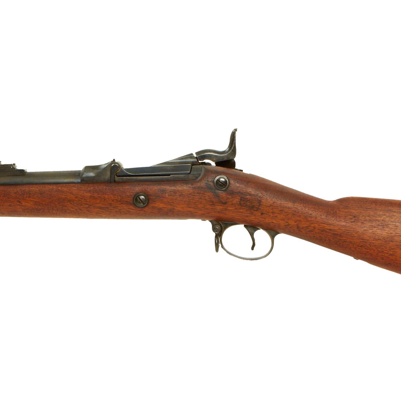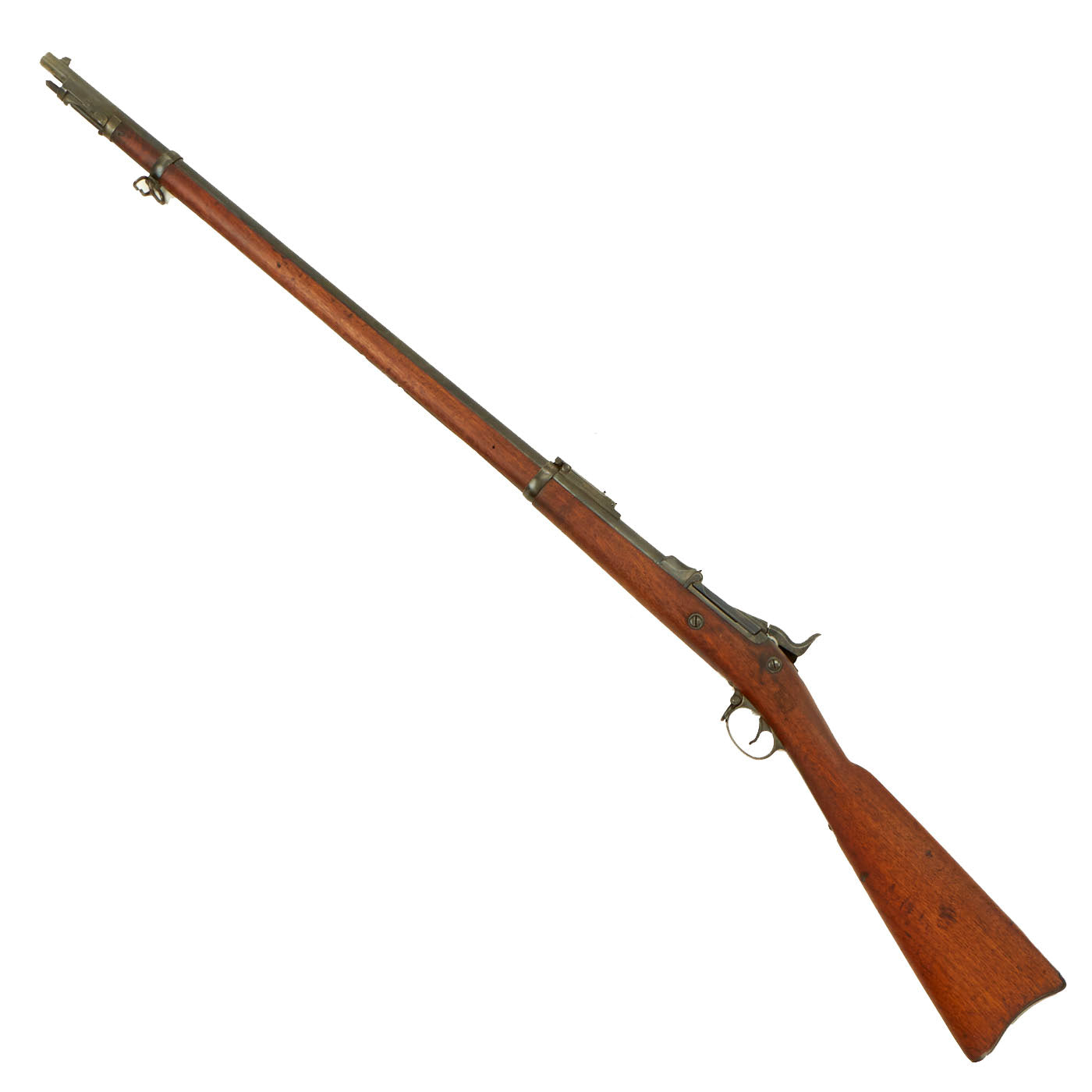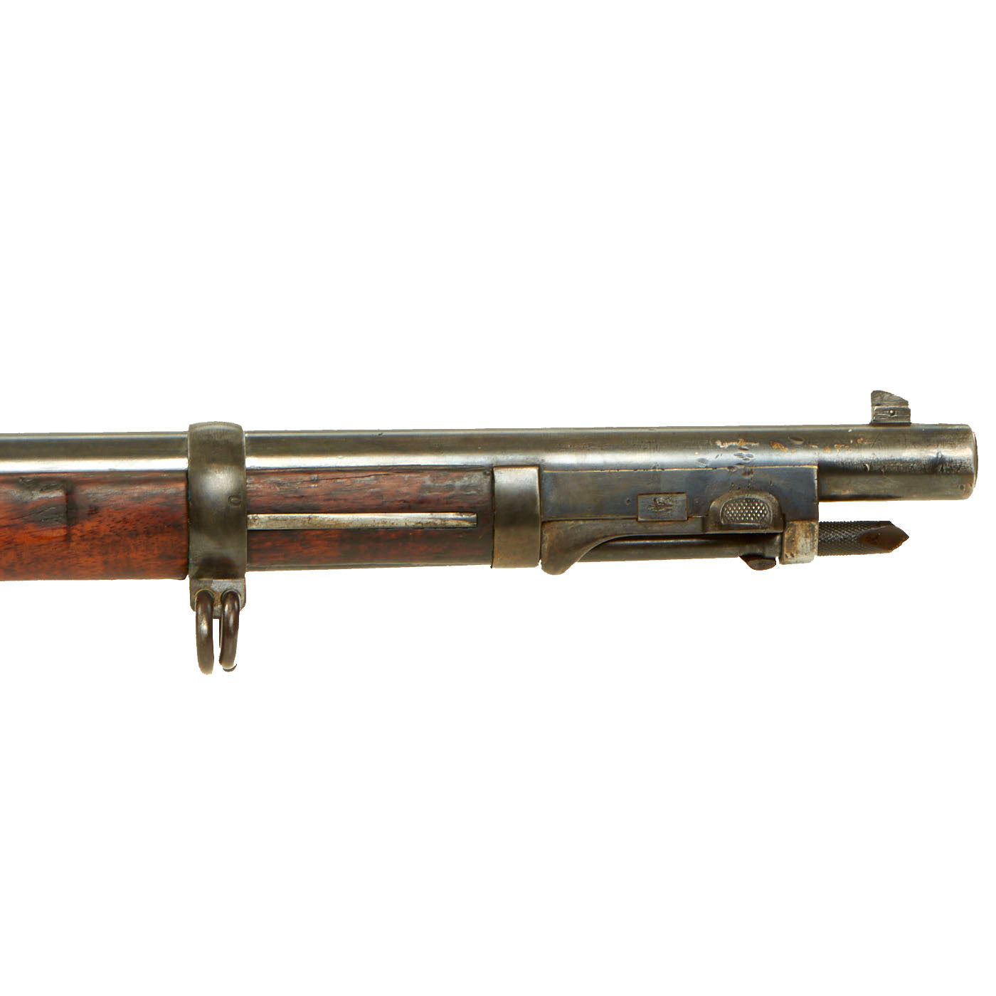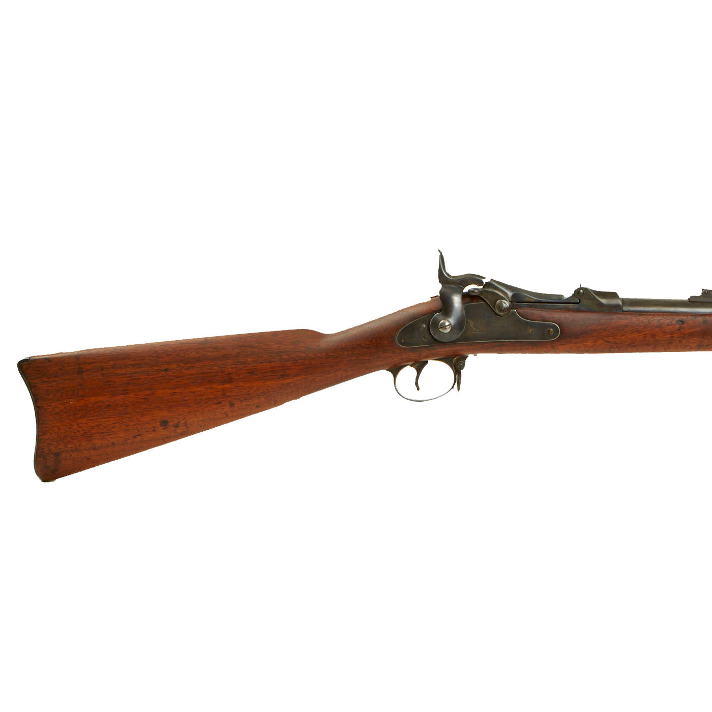 Center fire breechloader, .45 cal., two bands, two sling swivels with stacking swivel, Buffington sight, sliding ramrod bayonet. Lock is marked with an eagle and U.S. / SPRINGFIELD indicating manufacture by Springfield Armory, Springfield Massachusetts. The lock is fully functional, and the cartridge extractor is intact and functional, though we have not tested it on spent brass.