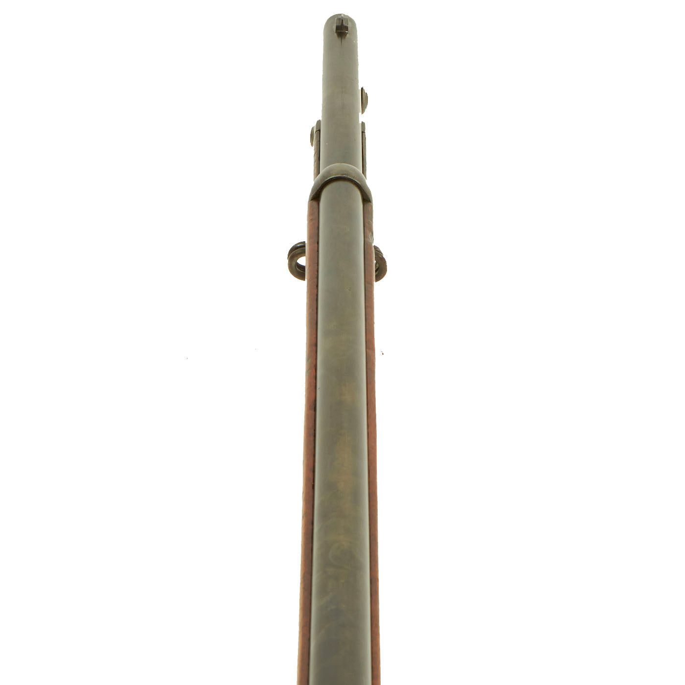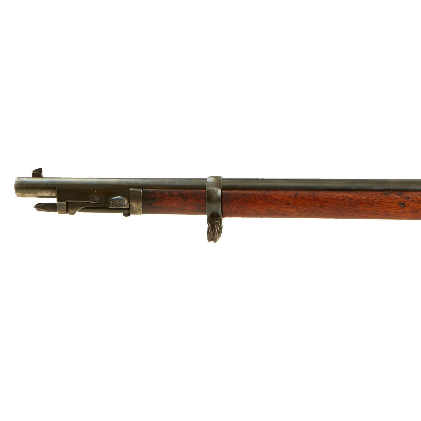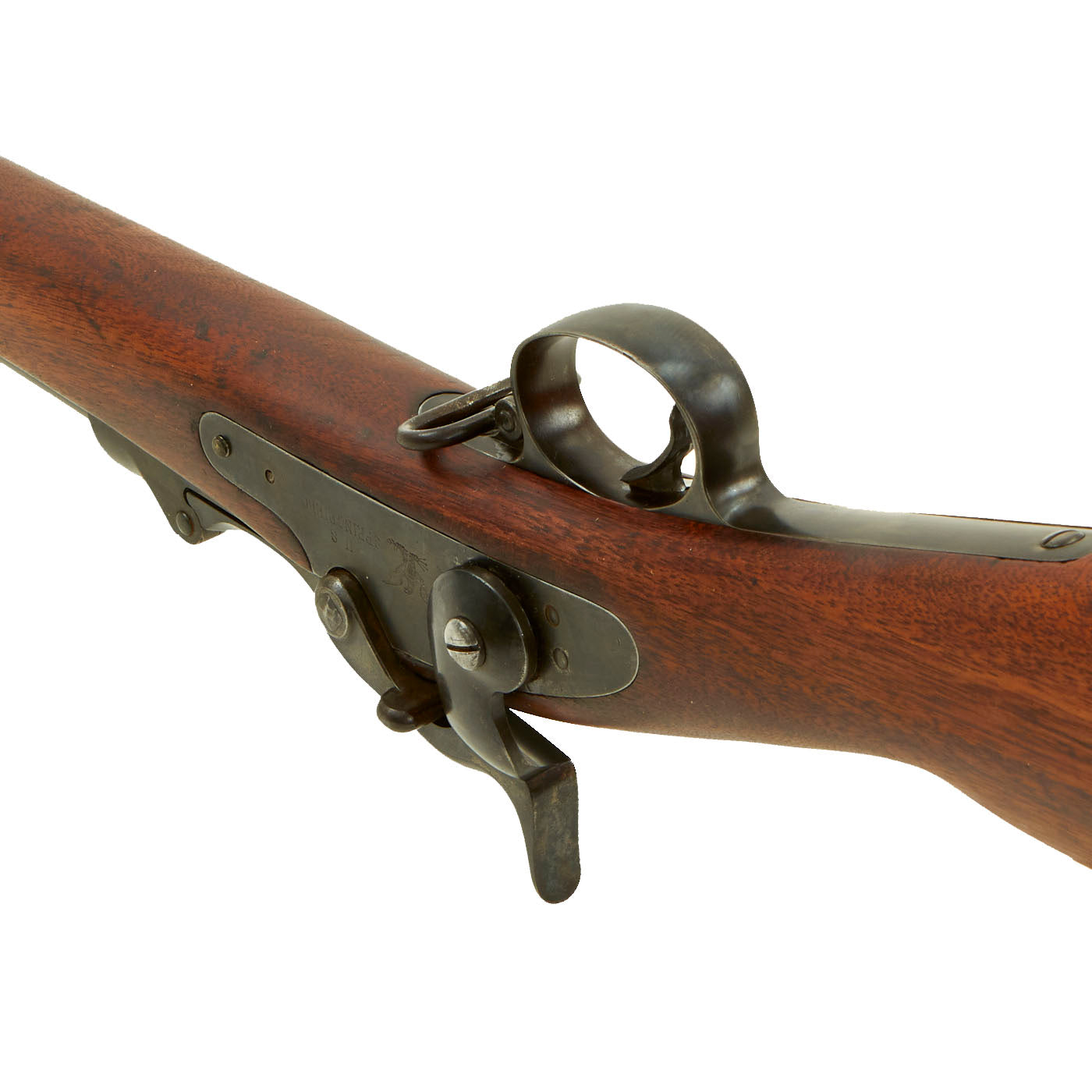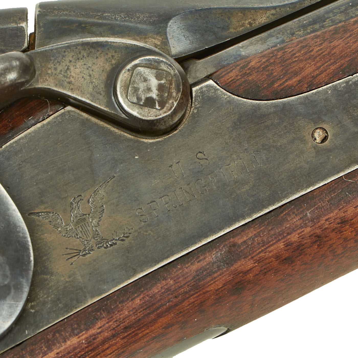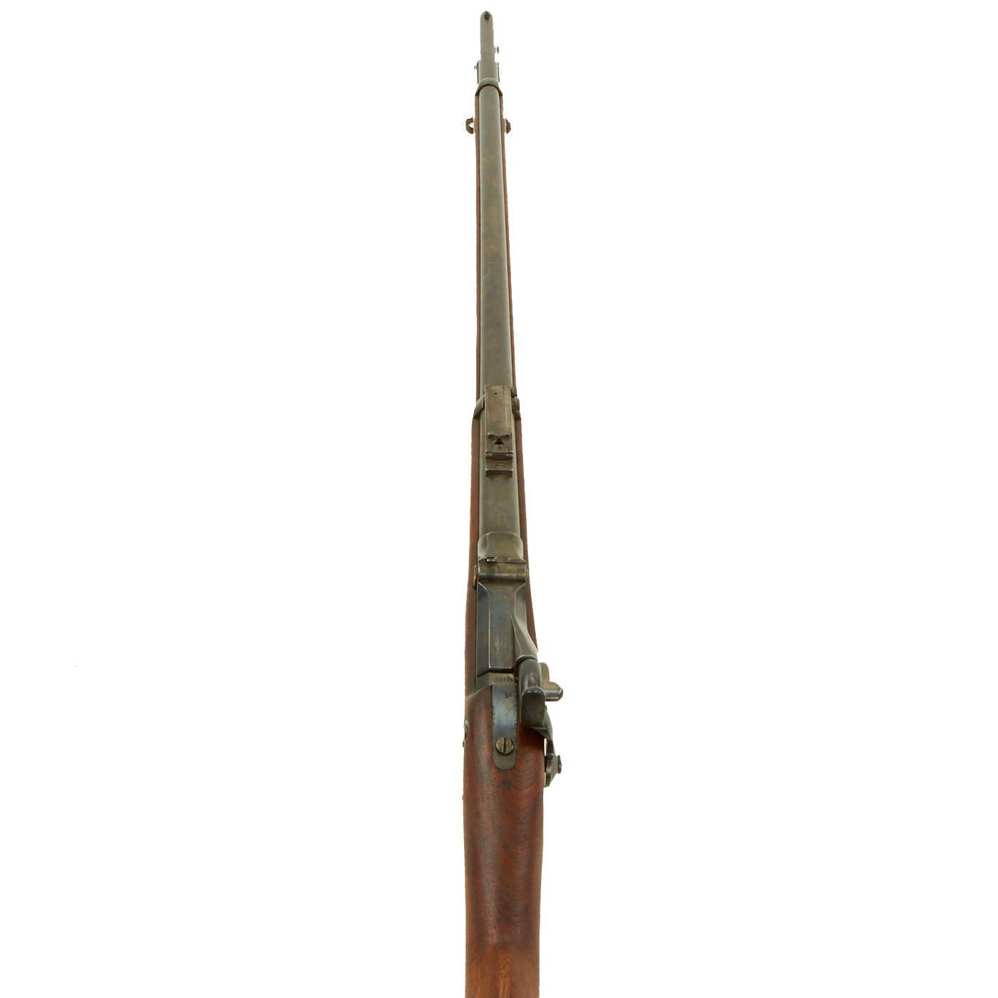 Center fire breechloader, .45 cal., two bands, two sling swivels with stacking swivel, Buffington sight, sliding ramrod bayonet. Lock is marked with an eagle and U.S. / SPRINGFIELD indicating manufacture by Springfield Armory, Springfield Massachusetts. The lock is fully functional, and the cartridge extractor is intact and functional, though we have not tested it on spent brass.