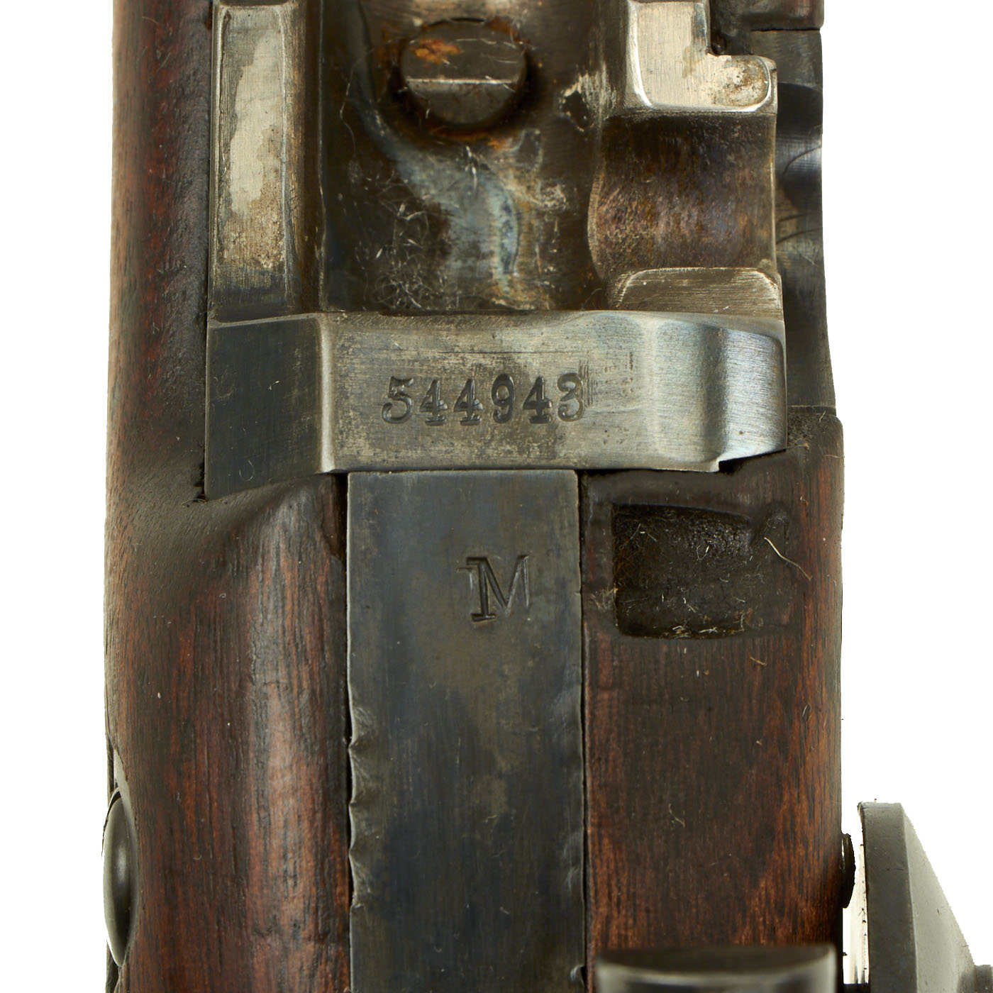 Hardware is in very good condition, with no signs of structural issues, and the original finish well retained. The bore is in very good condition, with clear lands and grooves and a mostly bright finish. There is just a bit of fouling and oxidation in areas. The cleaning rod / bayonet is in good shape, with intact threads, and a nice blued finish. Another nice feature on this example is the butt stock tool compartment, which is covered by a rotating door on the butt plate. This was used to store the take down tool and stuck cartridge extractor. Unfortunately this compartment is empty.