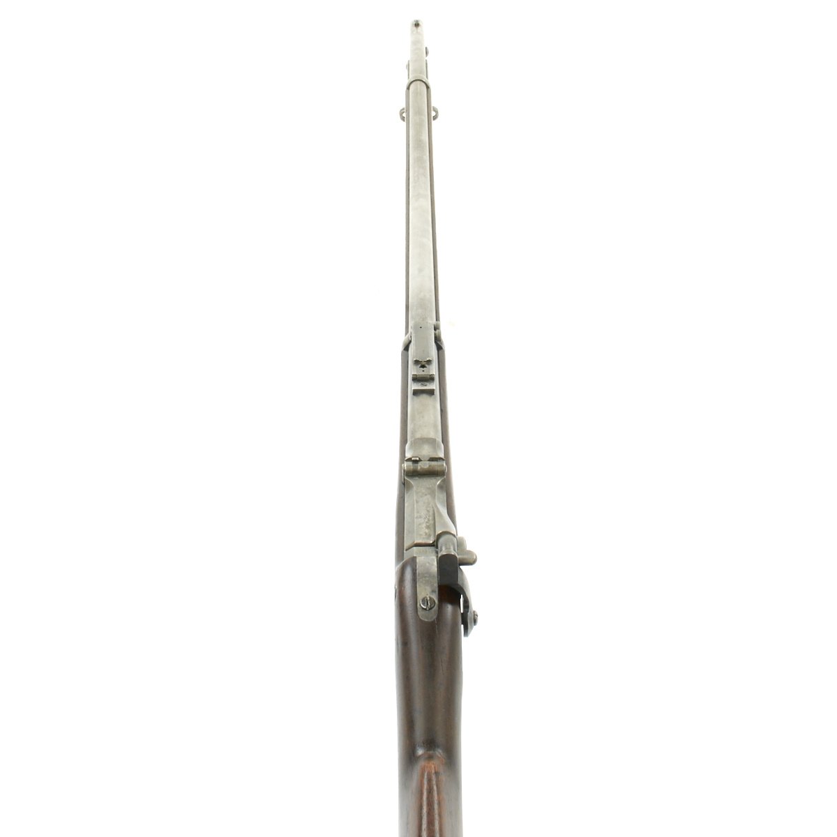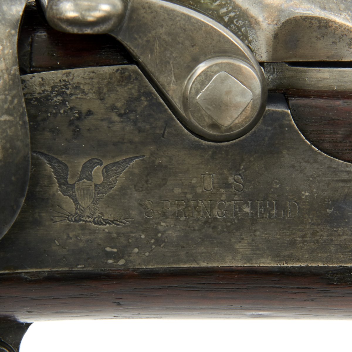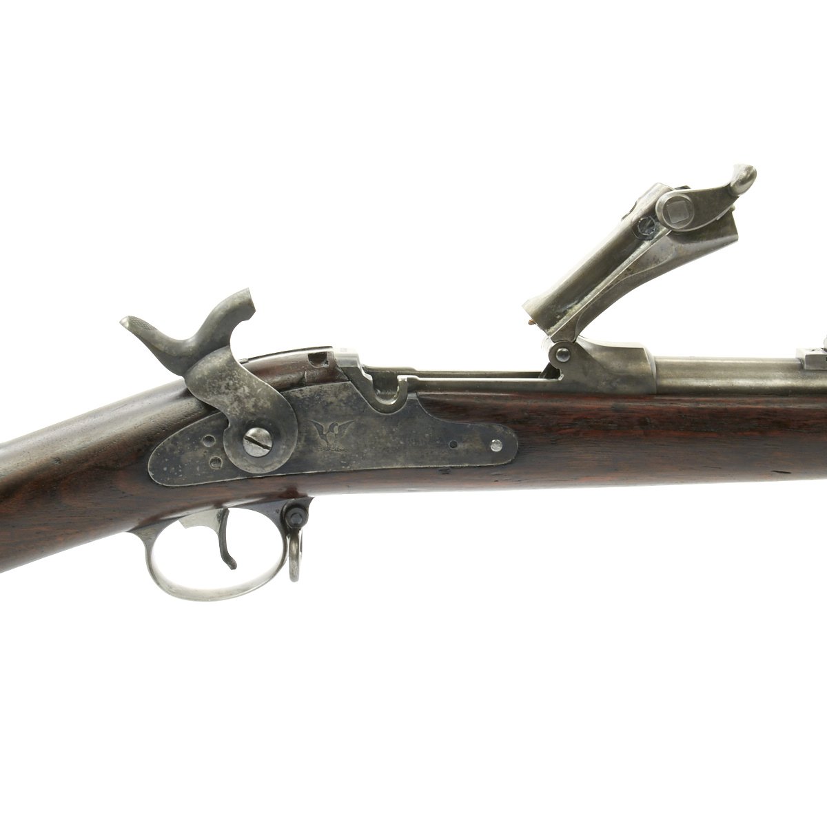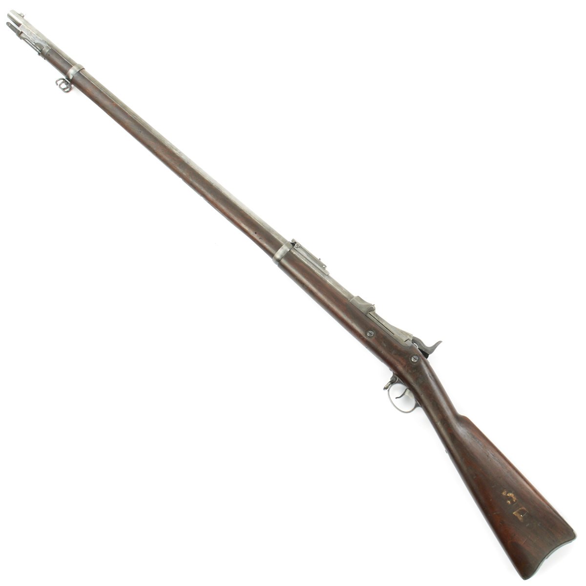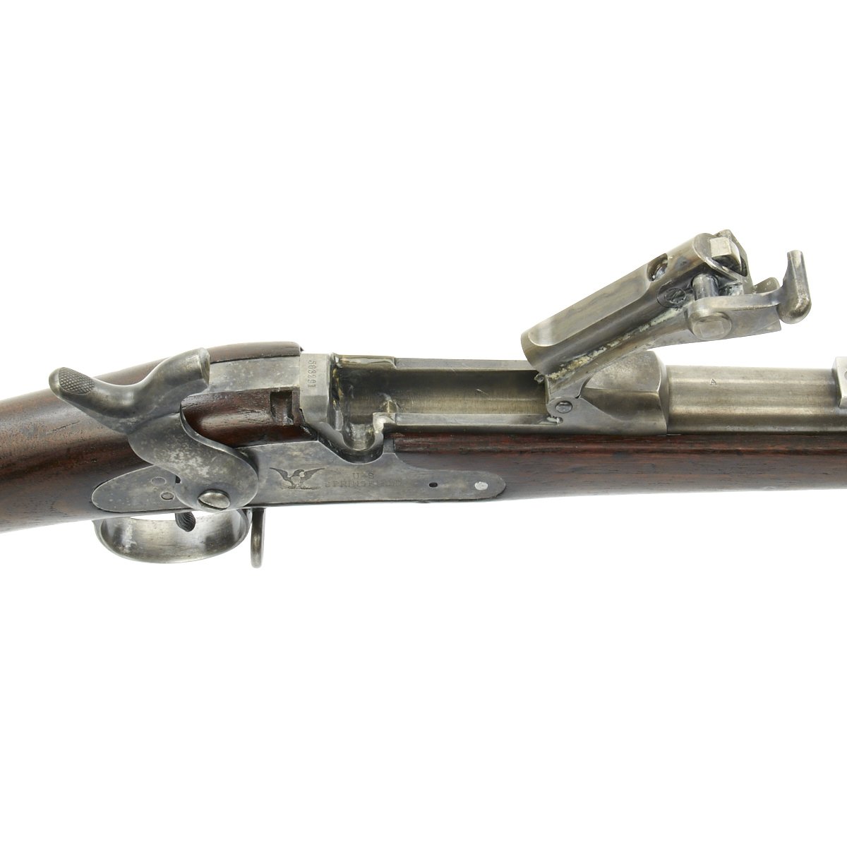 Center fire breechloader, .45 cal., two bands, two sling swivels with stacking swivel, Buffington sight, sliding ramrod bayonet. Lock is marked with an eagle and U.S. SPRINGFIELD manufactured by Springfield Armory, Springfield Massachusetts.