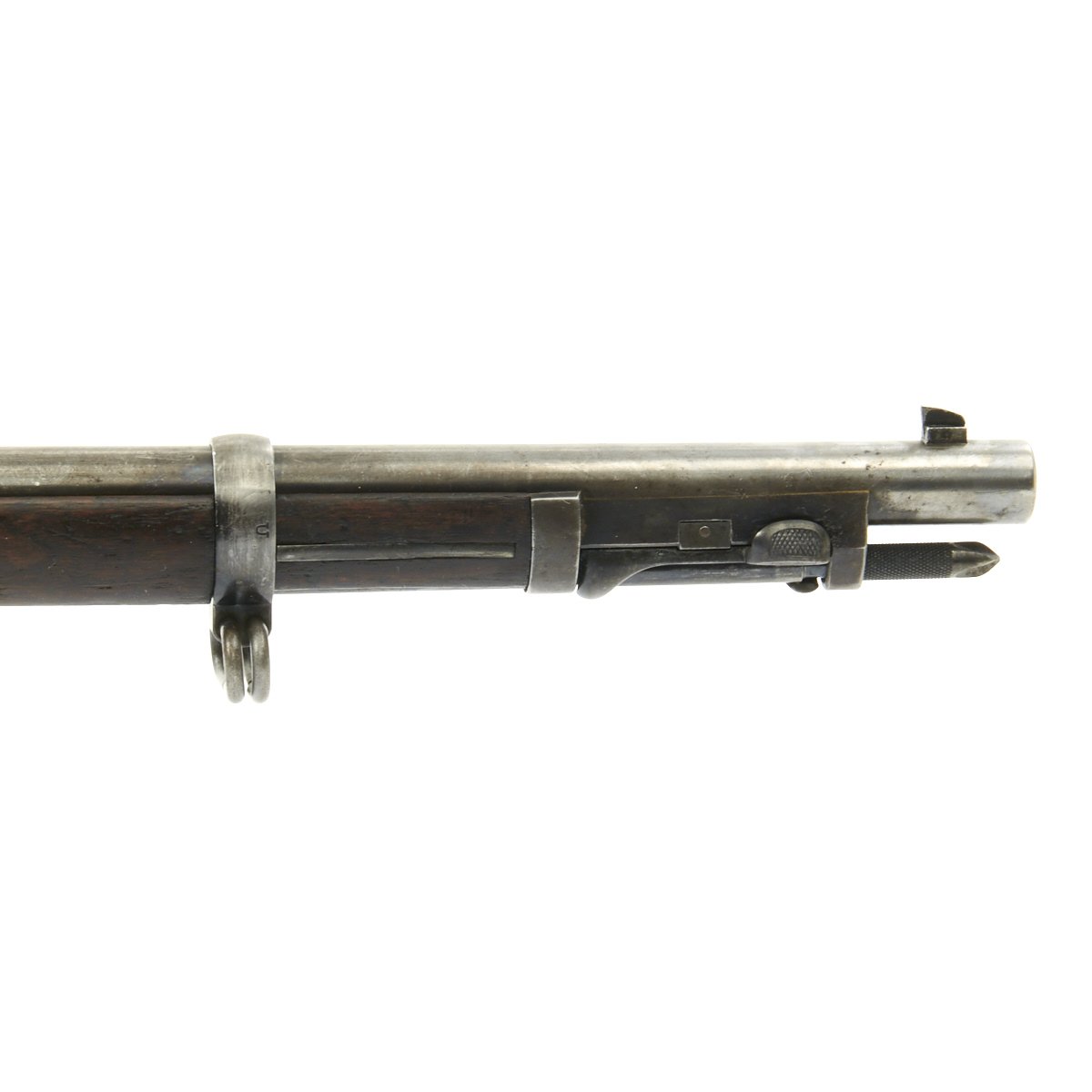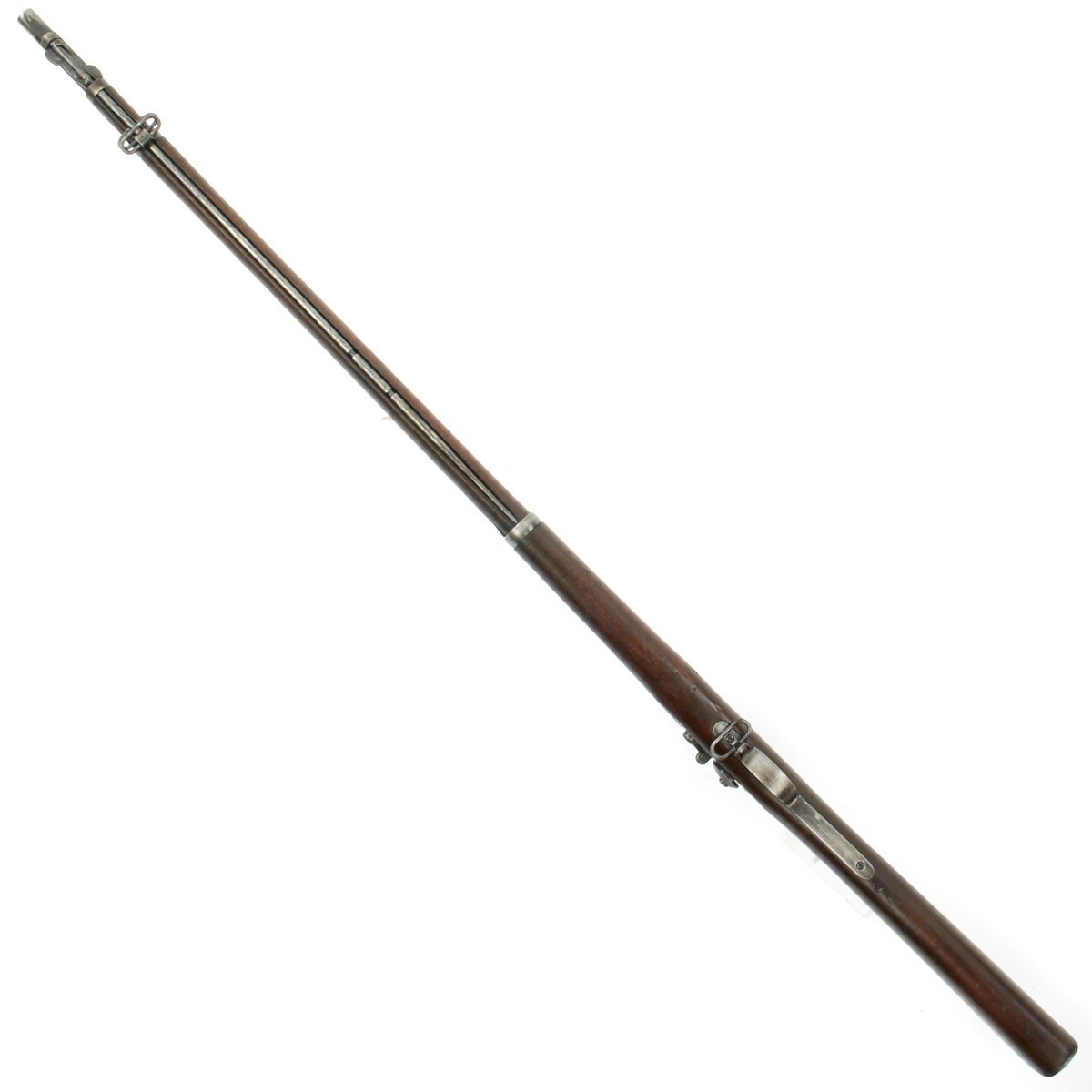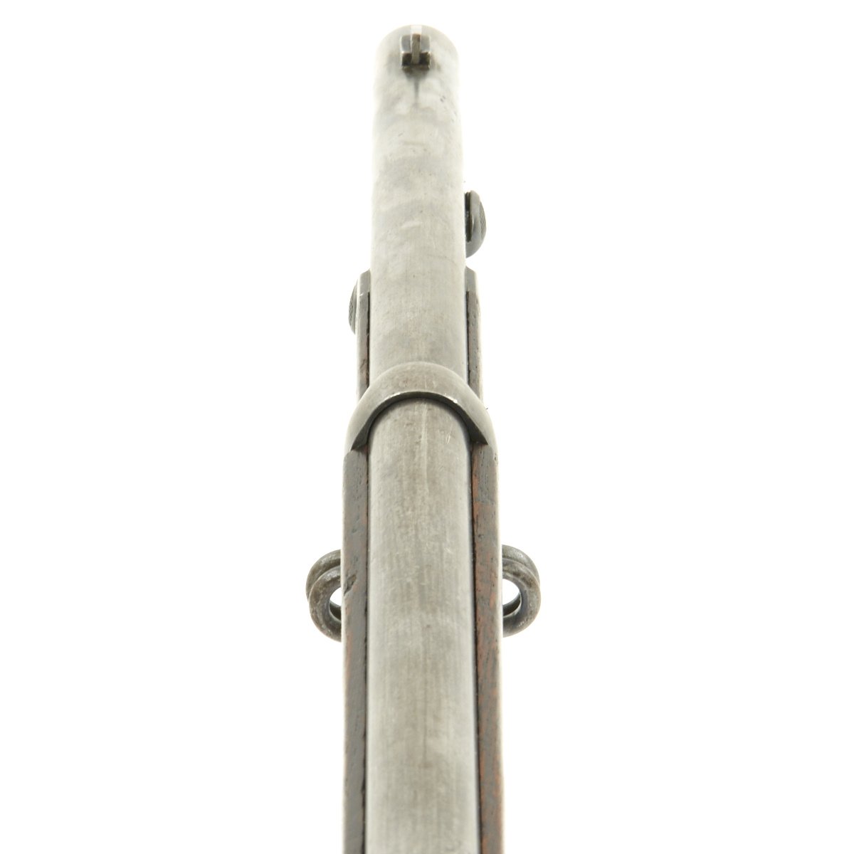Hardware is in solid condition, with no signs of structural issues. The bore is in excellent condition, with crisp lands and grooves and a bright finish. The cleaning rod / bayonet is in good shape, with intact threads and a gray patina similar to the rest of the metalwork.
