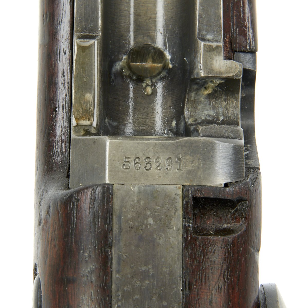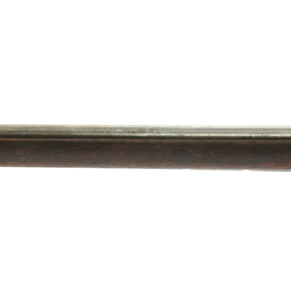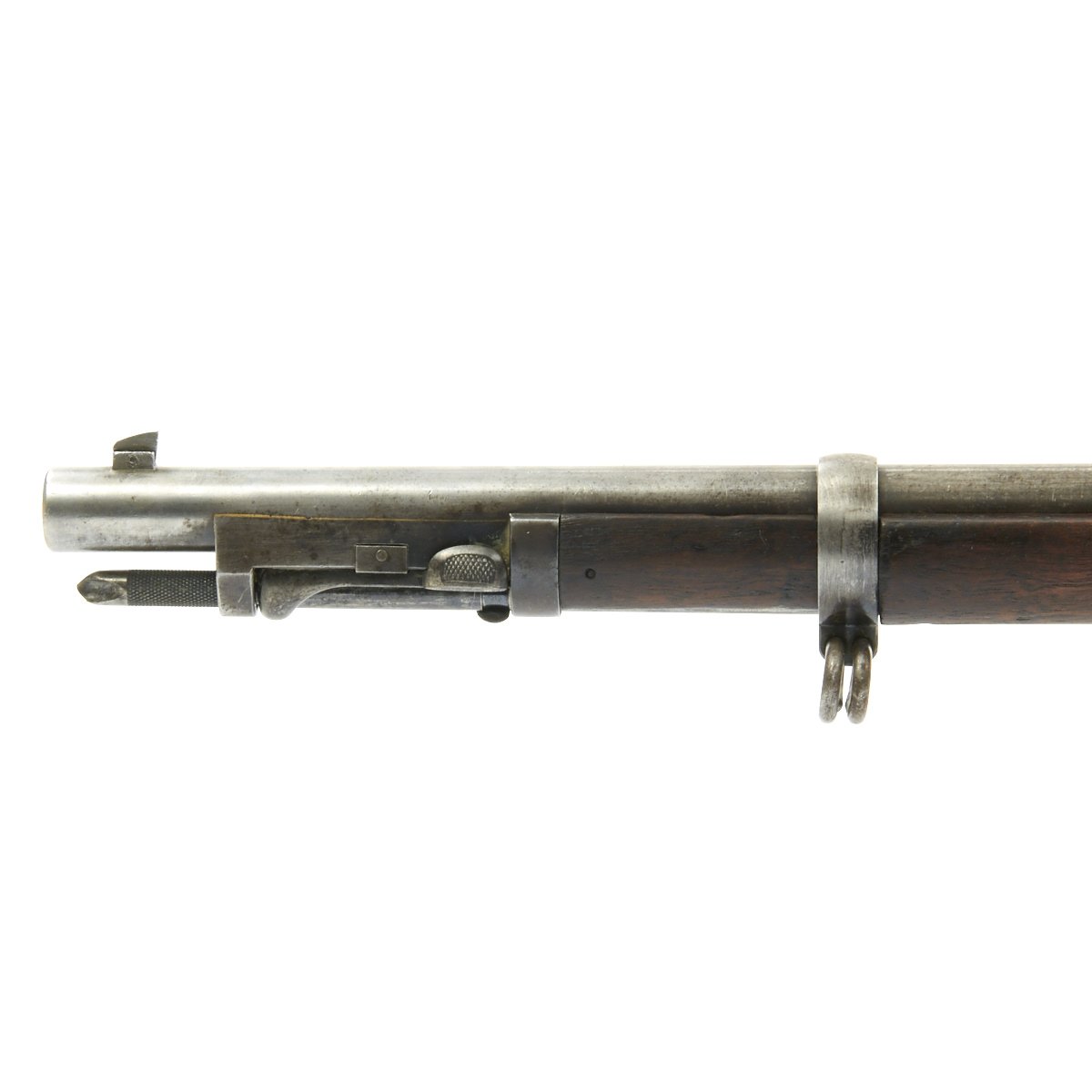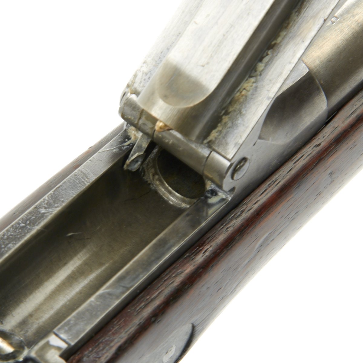 Hardware is in solid condition, with no signs of structural issues. The bore is in excellent condition, with crisp lands and grooves and a bright finish. The cleaning rod / bayonet is in good shape, with intact threads and a gray patina similar to the rest of the metalwork.