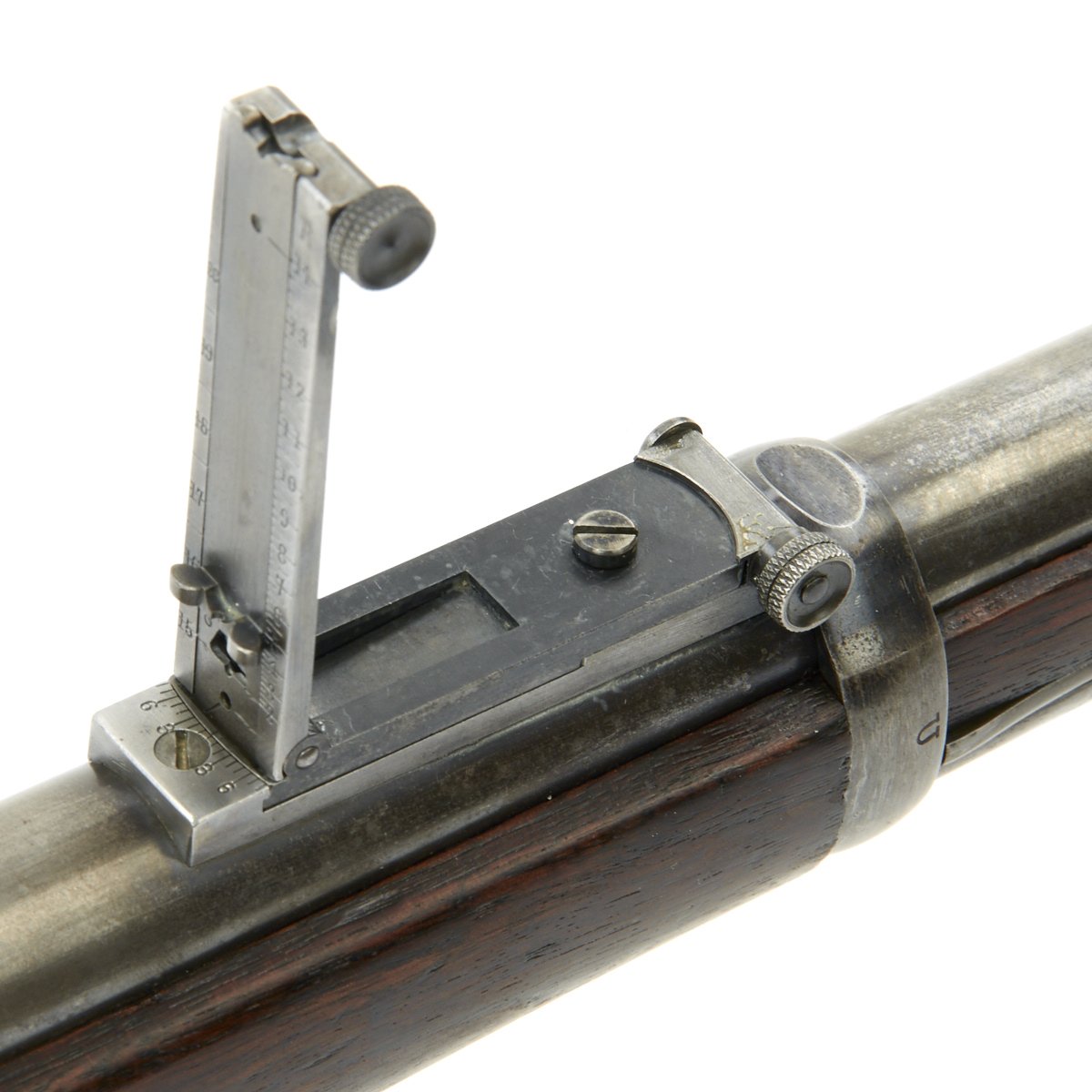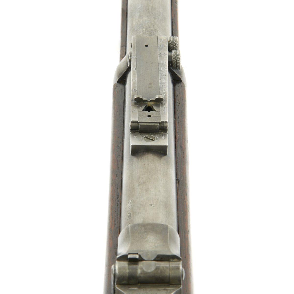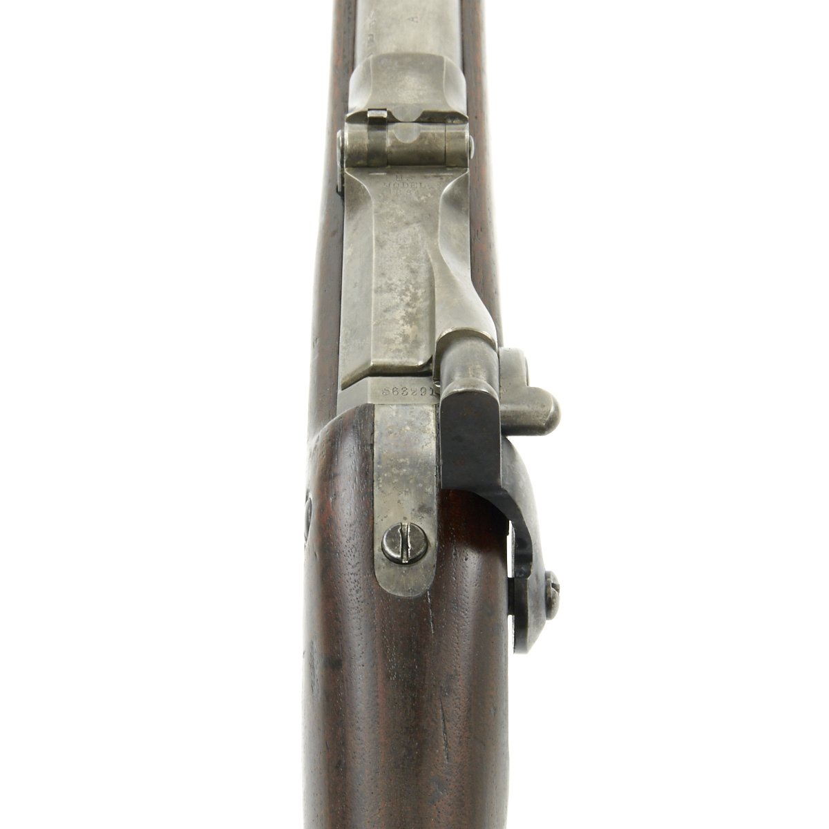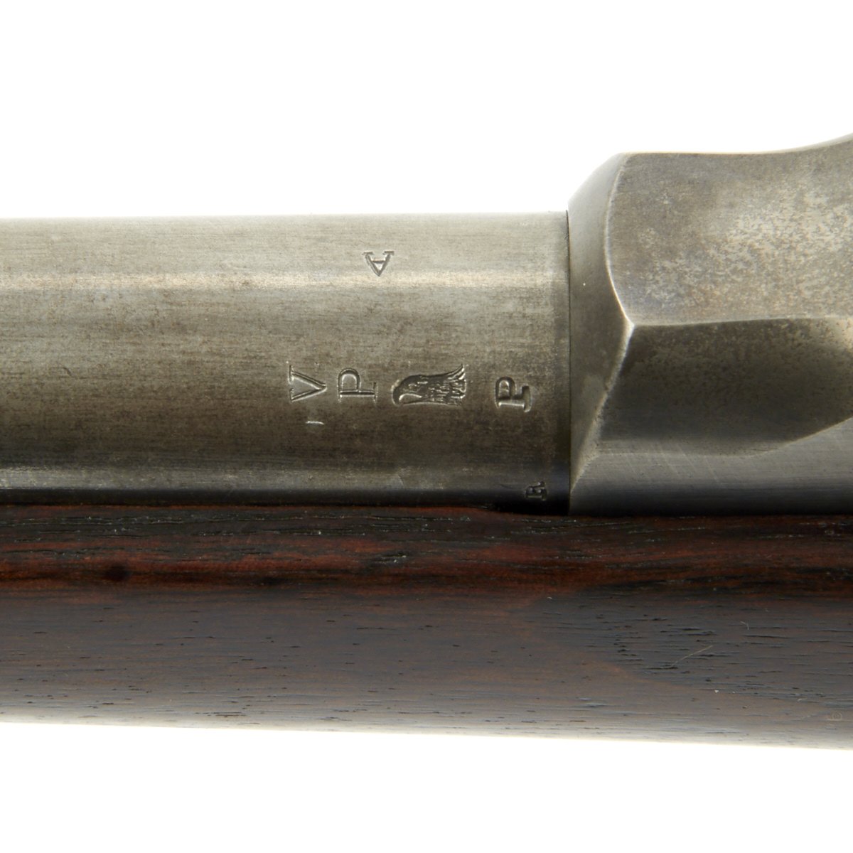 The elegant script SWP belongs to Samuel W. Porter, who was the Master Armorer and Chief Inspector of Springfield Armory from 15 September 1879 to 18 June 1894. A stylized P in a circle under the wrist of the stock indicates that the rifle passed all of its overpressure proof testing. Additional marks of interest include inspectors' and proof marks around the breech end of the barrel: a capital A on top; and a V over a P over an eagle's head over another P on the left side just above the stock. The upper right corner of the Buffington sight leaf is marked R to indicate that the sight graduations are for a rifle and not a carbine.