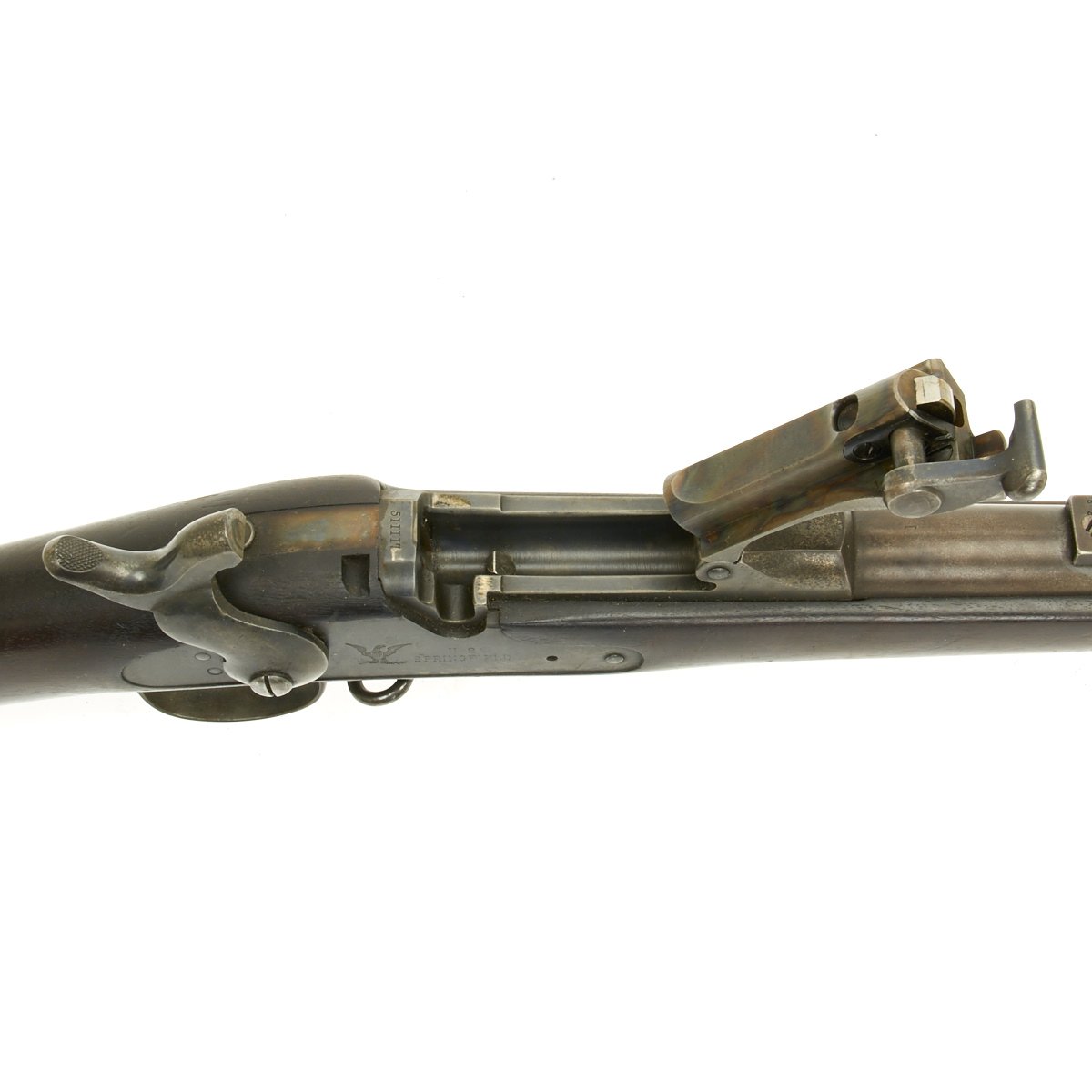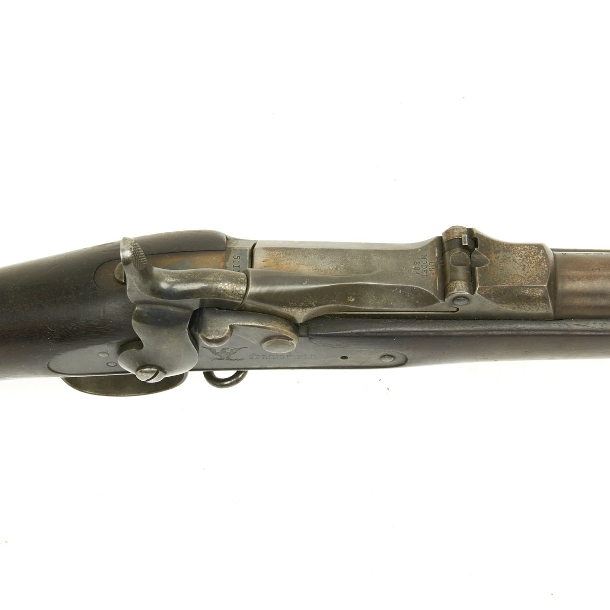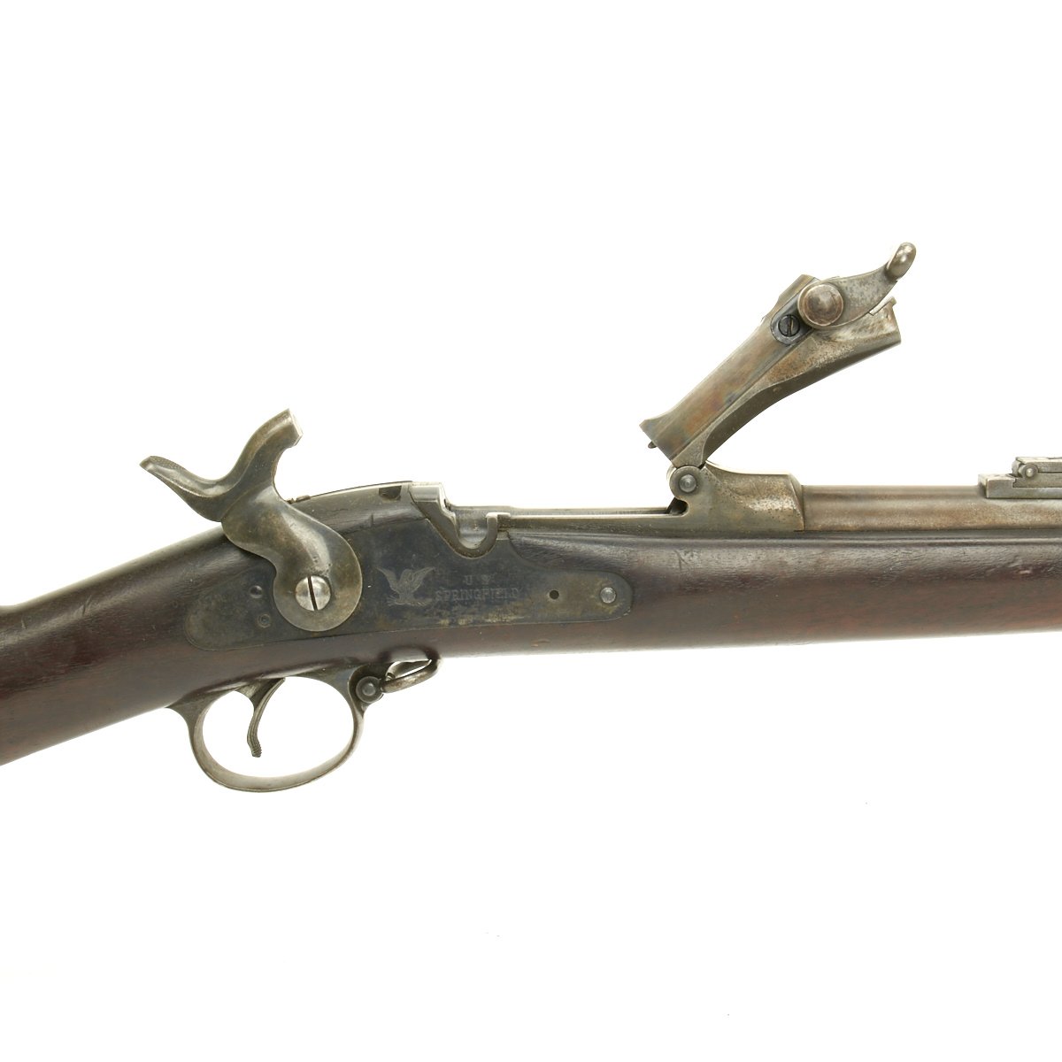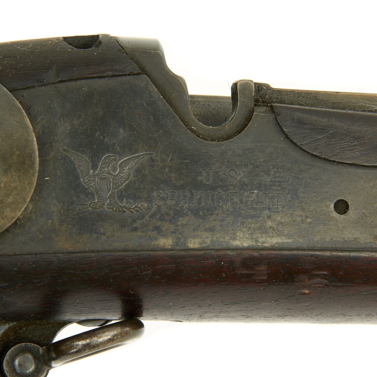 The rifle features an nice un-sanded stock with the edges still proud over the lock plate. It has some scratches and small dings, but has a great finish and color. Center fire breechloader, .45 cal., two bands, two sling swivels with stacking swivel, Buffington sight, sliding ramrod bayonet. Lock is marked with an eagle and U.S. SPRINGFIELD manufactured by Springfield Armory, Springfield Massachusetts.