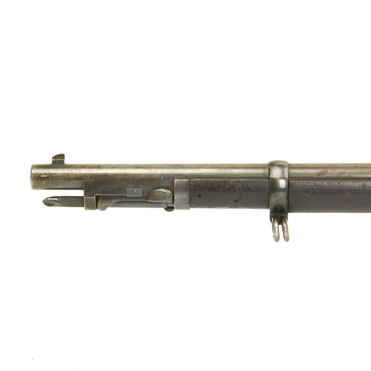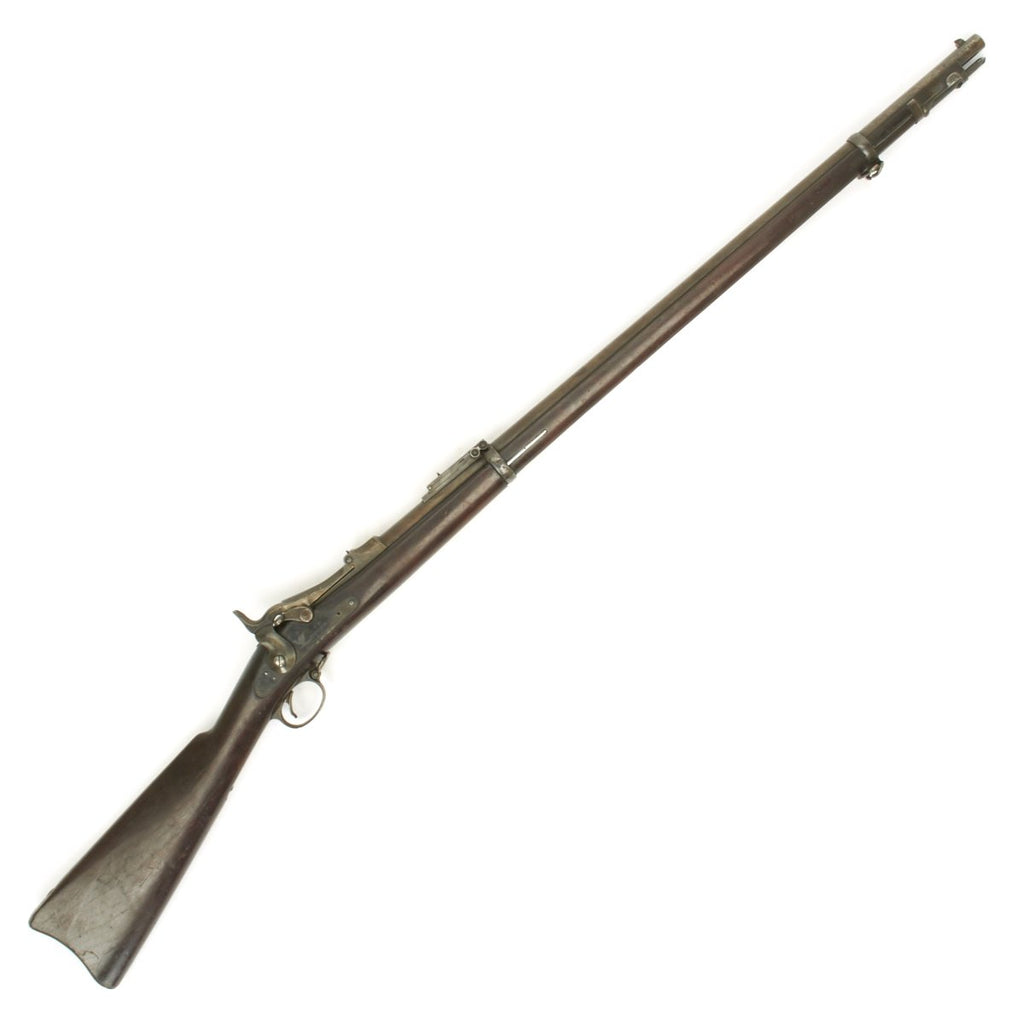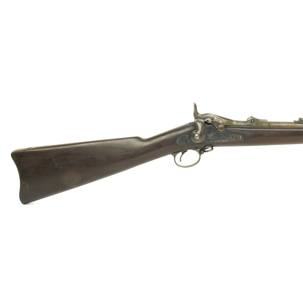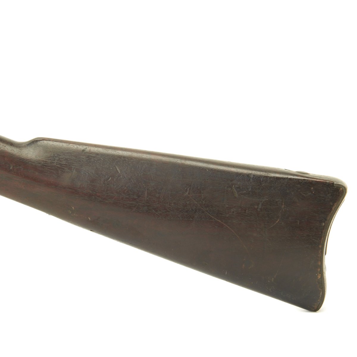 The rifle features an nice un-sanded stock with the edges still proud over the lock plate. It has some scratches and small dings, but has a great finish and color. Center fire breechloader, .45 cal., two bands, two sling swivels with stacking swivel, Buffington sight, sliding ramrod bayonet. Lock is marked with an eagle and U.S. SPRINGFIELD manufactured by Springfield Armory, Springfield Massachusetts.