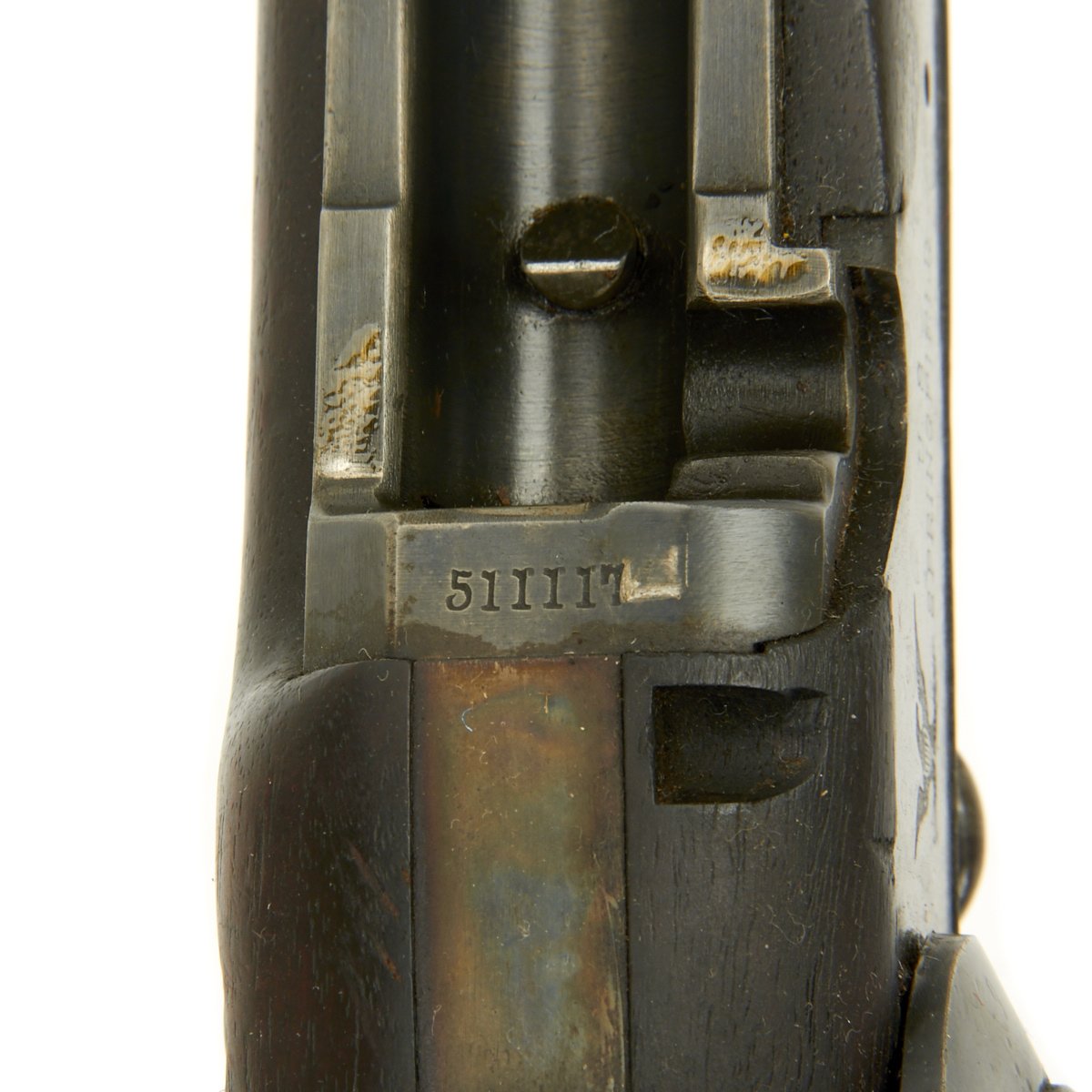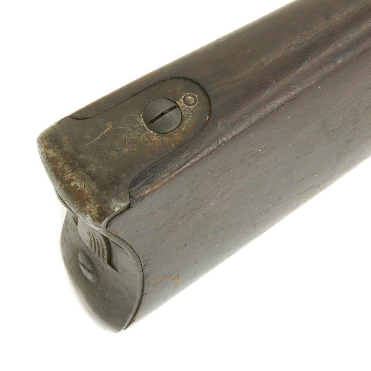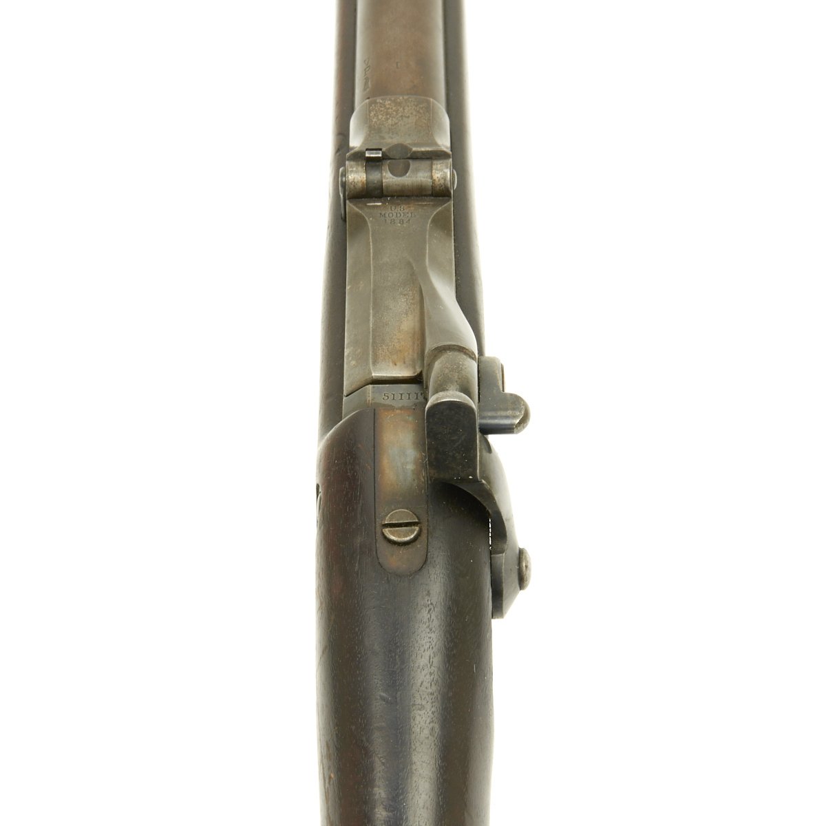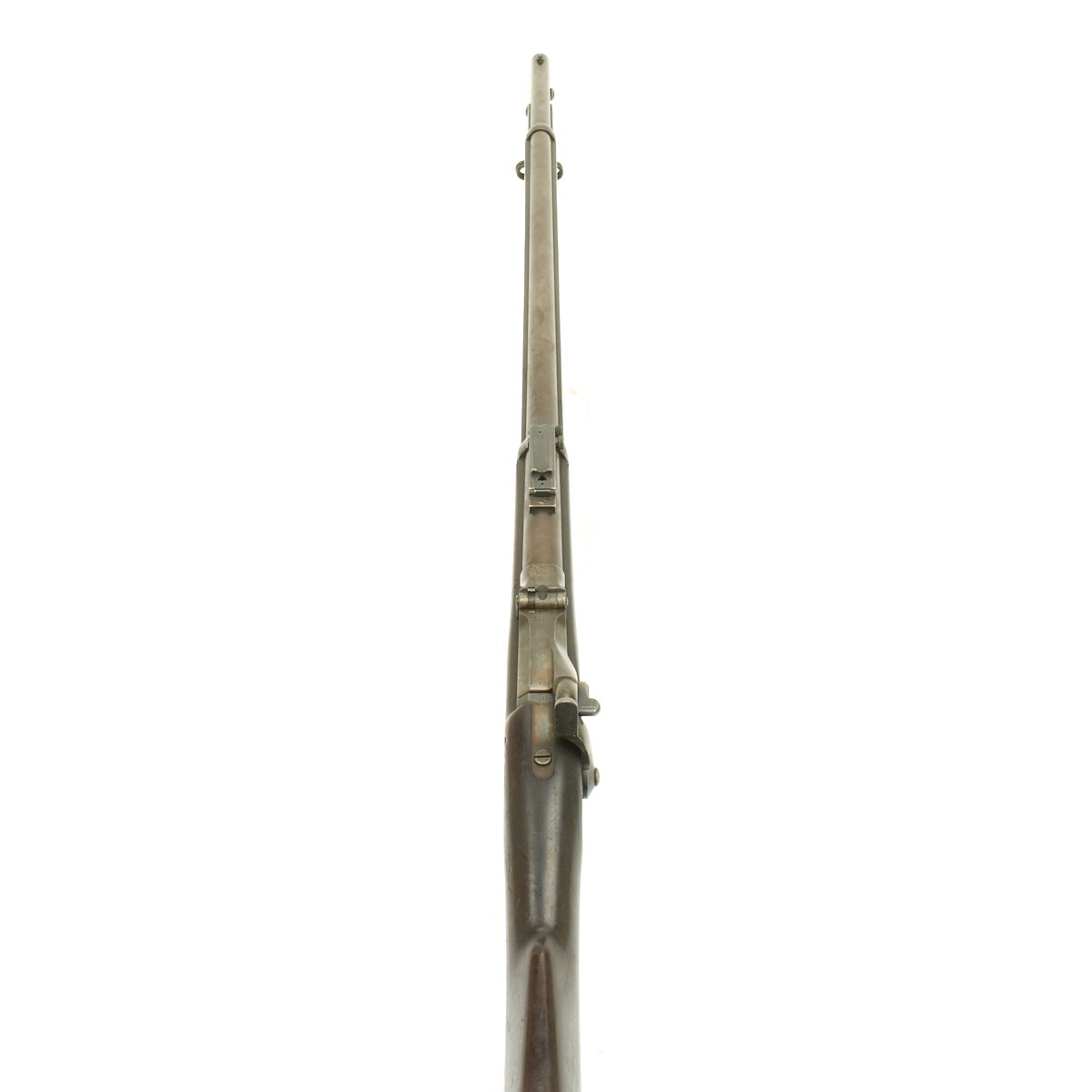 The rifle features an nice un-sanded stock with the edges still proud over the lock plate. It has some scratches and small dings, but has a great finish and color. Center fire breechloader, .45 cal., two bands, two sling swivels with stacking swivel, Buffington sight, sliding ramrod bayonet. Lock is marked with an eagle and U.S. SPRINGFIELD manufactured by Springfield Armory, Springfield Massachusetts.