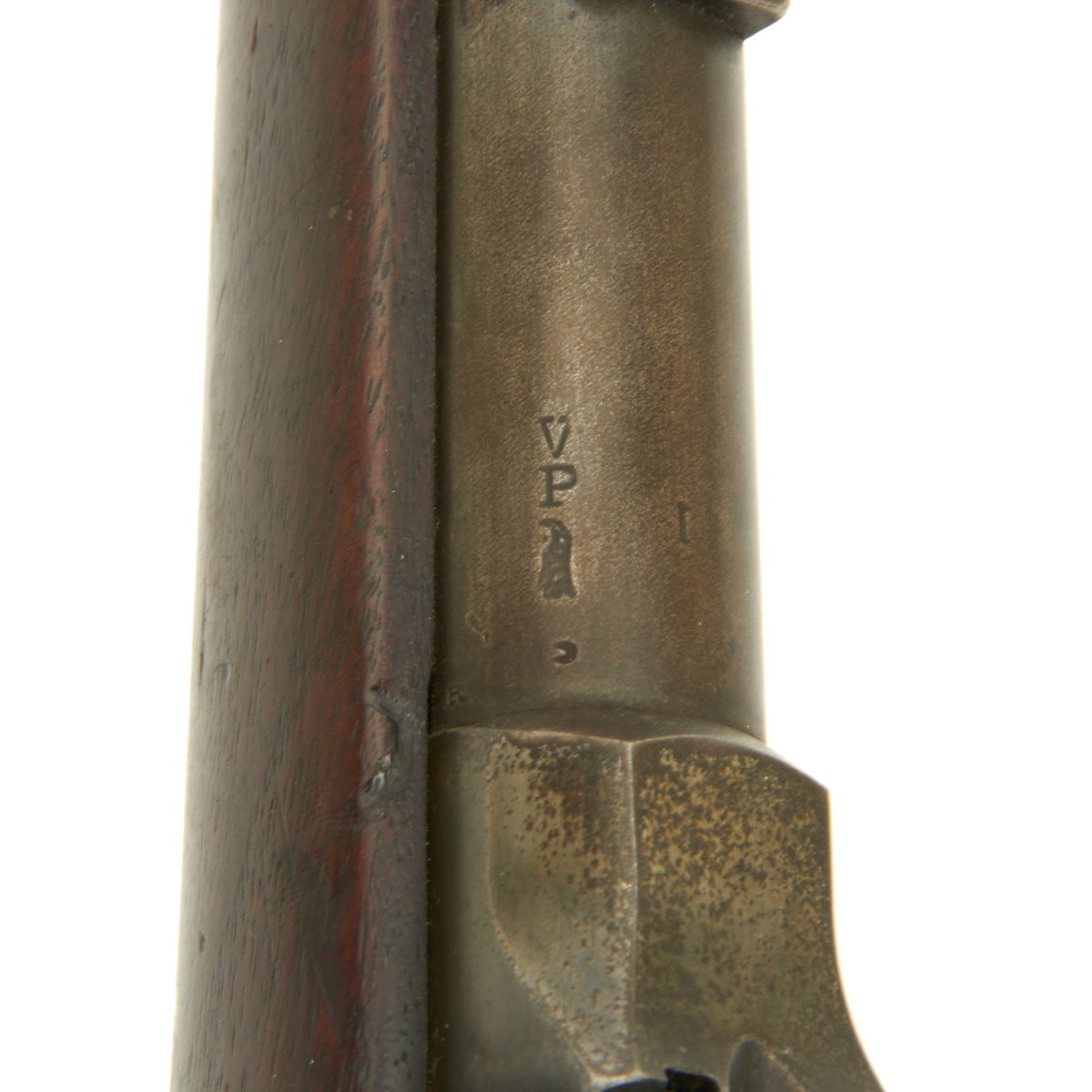 The elegant script SWP belongs to Samuel W. Porter, who was the Master Armorer and Chief Inspector of Springfield Armory from 15 September 1879 to 18 June 1894. A stylized P in a circle under the wrist of the stock indicates that the rifle passed all of its overpressure proof testing. Additional marks of interest include inspectors' and proof marks around the breech end of the barrel: a V over a P over an eagle's head over another P on the left side just above the stock. The upper right corner of the Buffington sight leaf is marked R to indicate that the sight graduations are for a rifle and not a carbine.