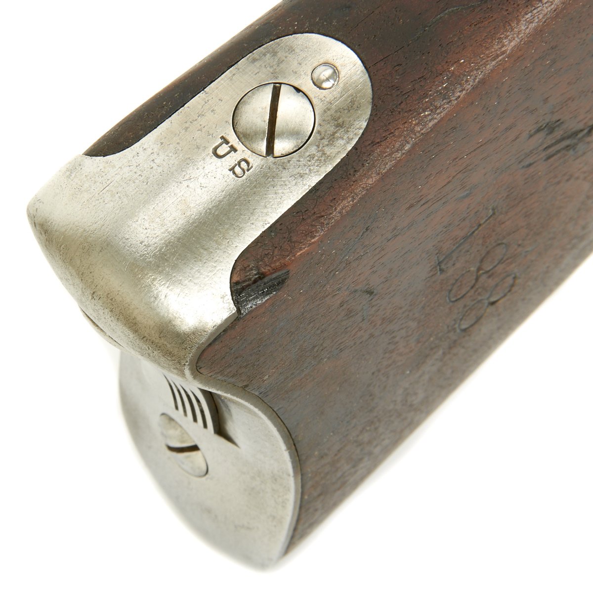 Another excellent and rarely seen feature on this example is the butt stock tool compartment, which is covered by a rotating door on the butt plate. We have had many Springfield Trapdoor rifles, but only a few have had this feature. Also, there are arsenal markings on the side and top of the butt stock: C / 37 and 22 / 188. These are most likely rack numbers for the specific person it was issued to.