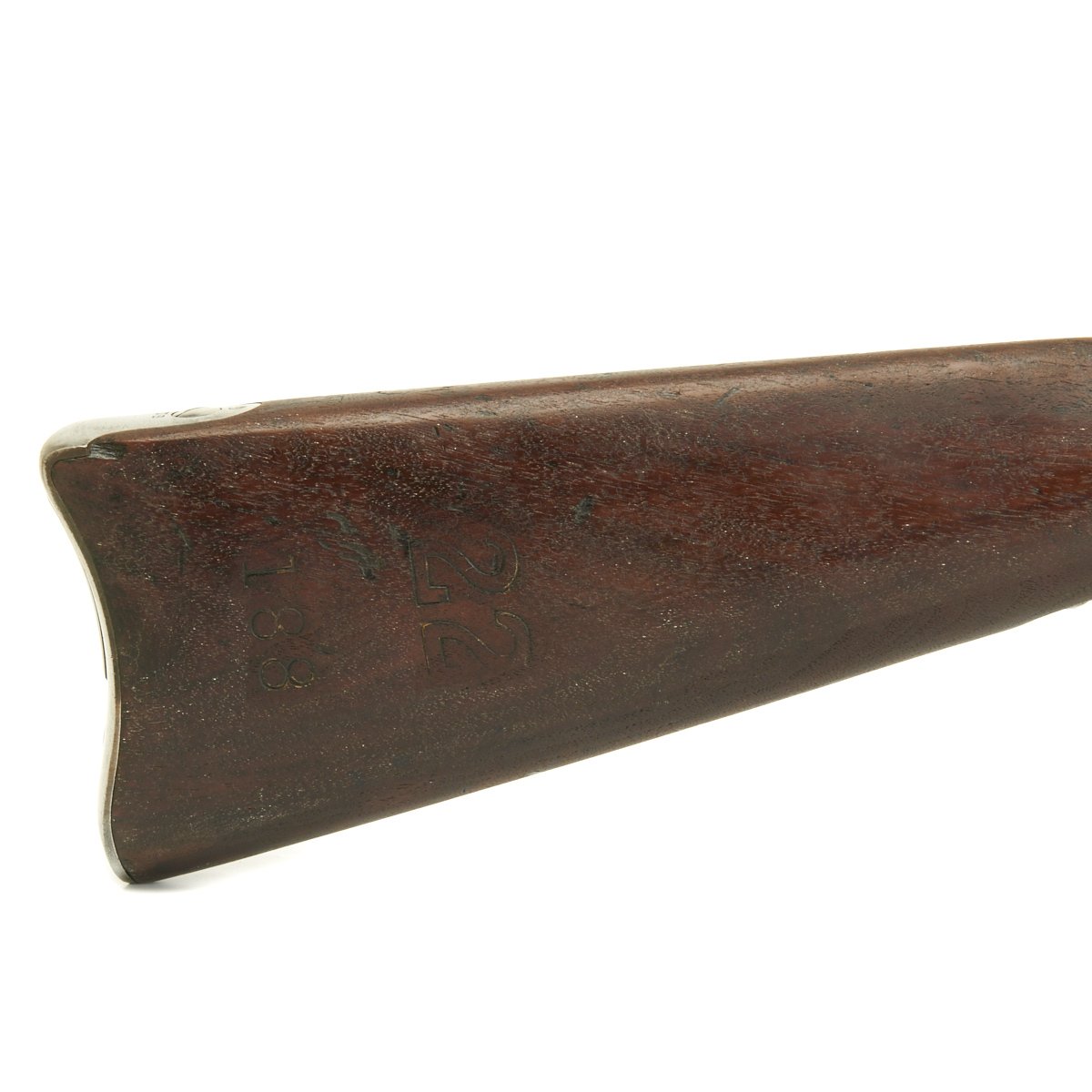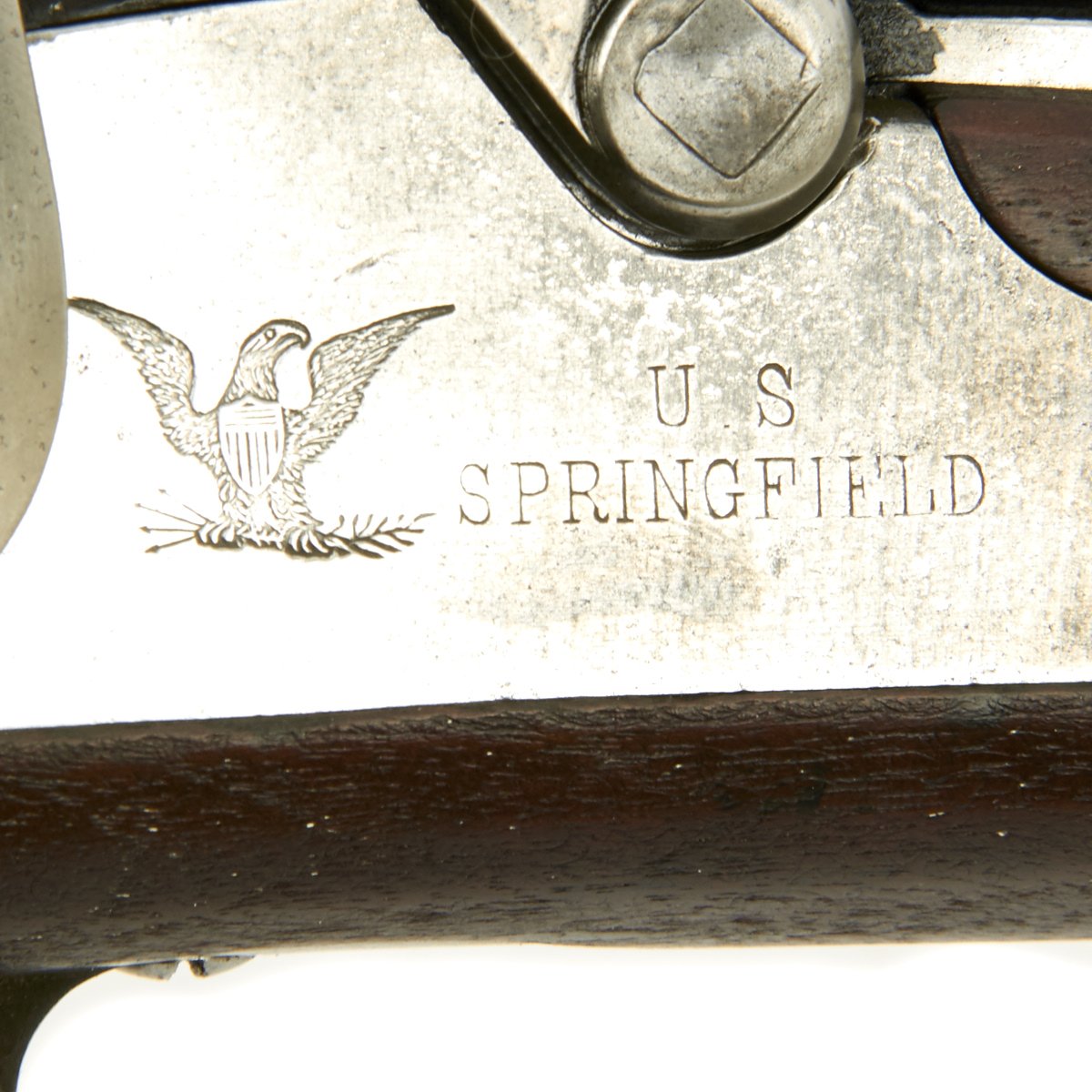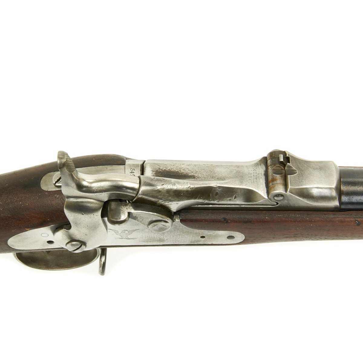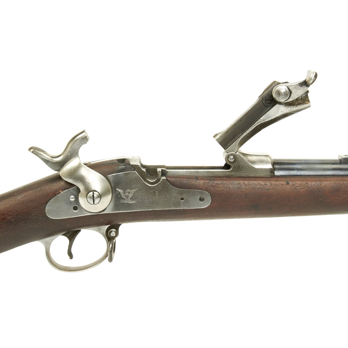 The rifle features an nice un-sanded stock with the edges still proud over the lock plate. Center fire breechloader, .45 cal., two bands, two sling swivels, Buffington sight, sliding ramrod bayonet. Lock is marked with an eagle and U.S. SPRINGFIELD manufactured by Springfield Armory, Springfield Massachusetts.