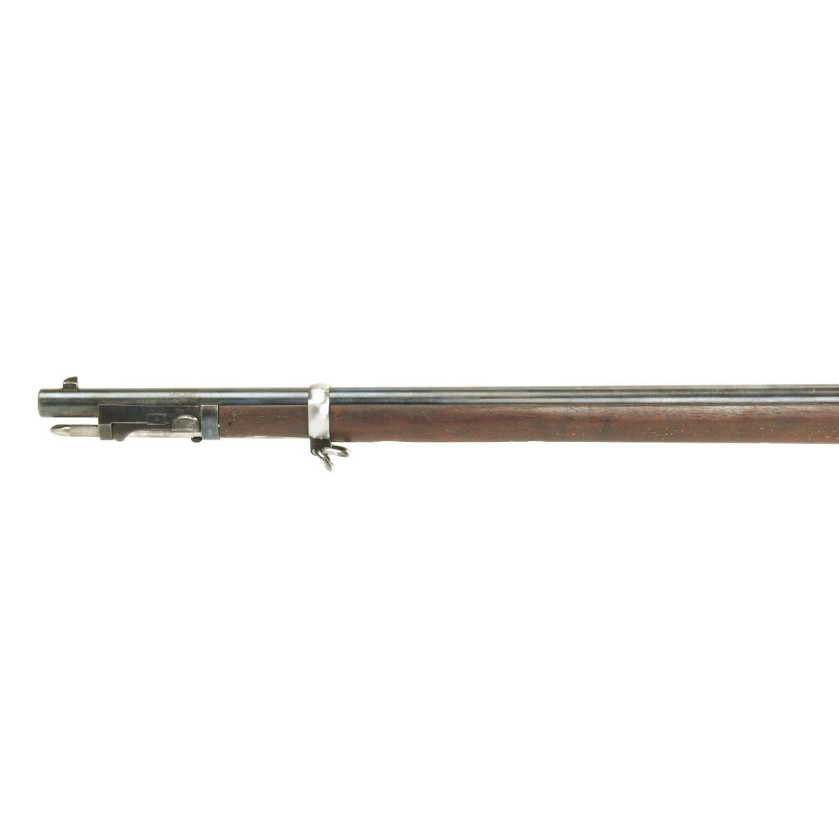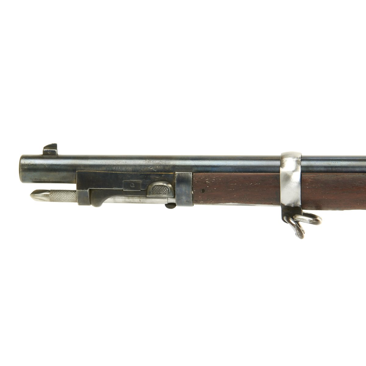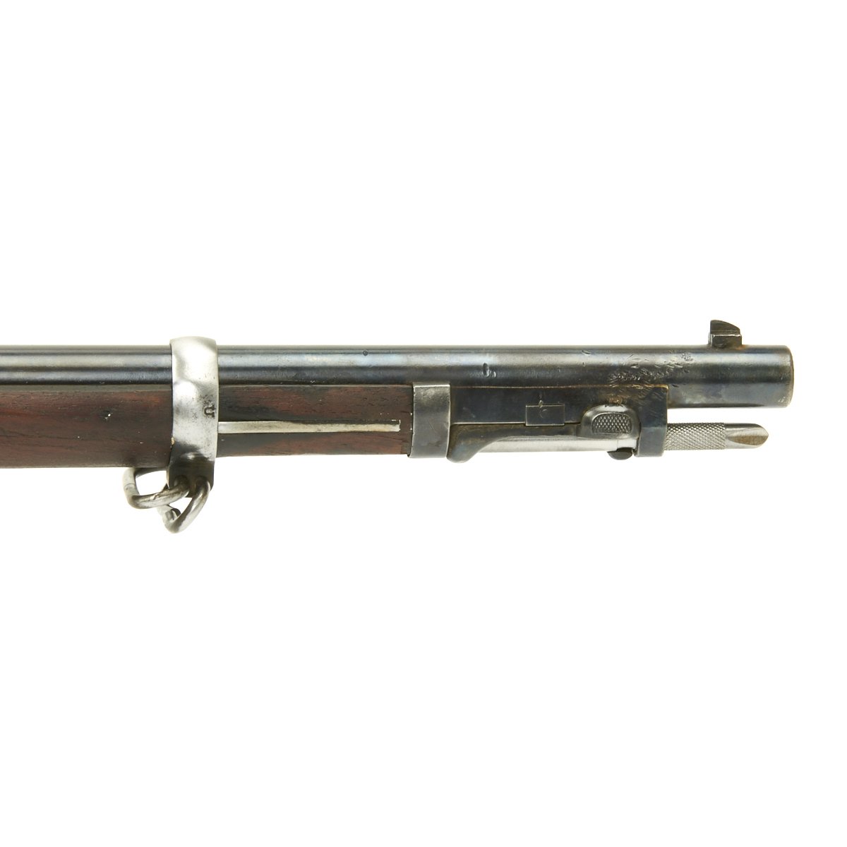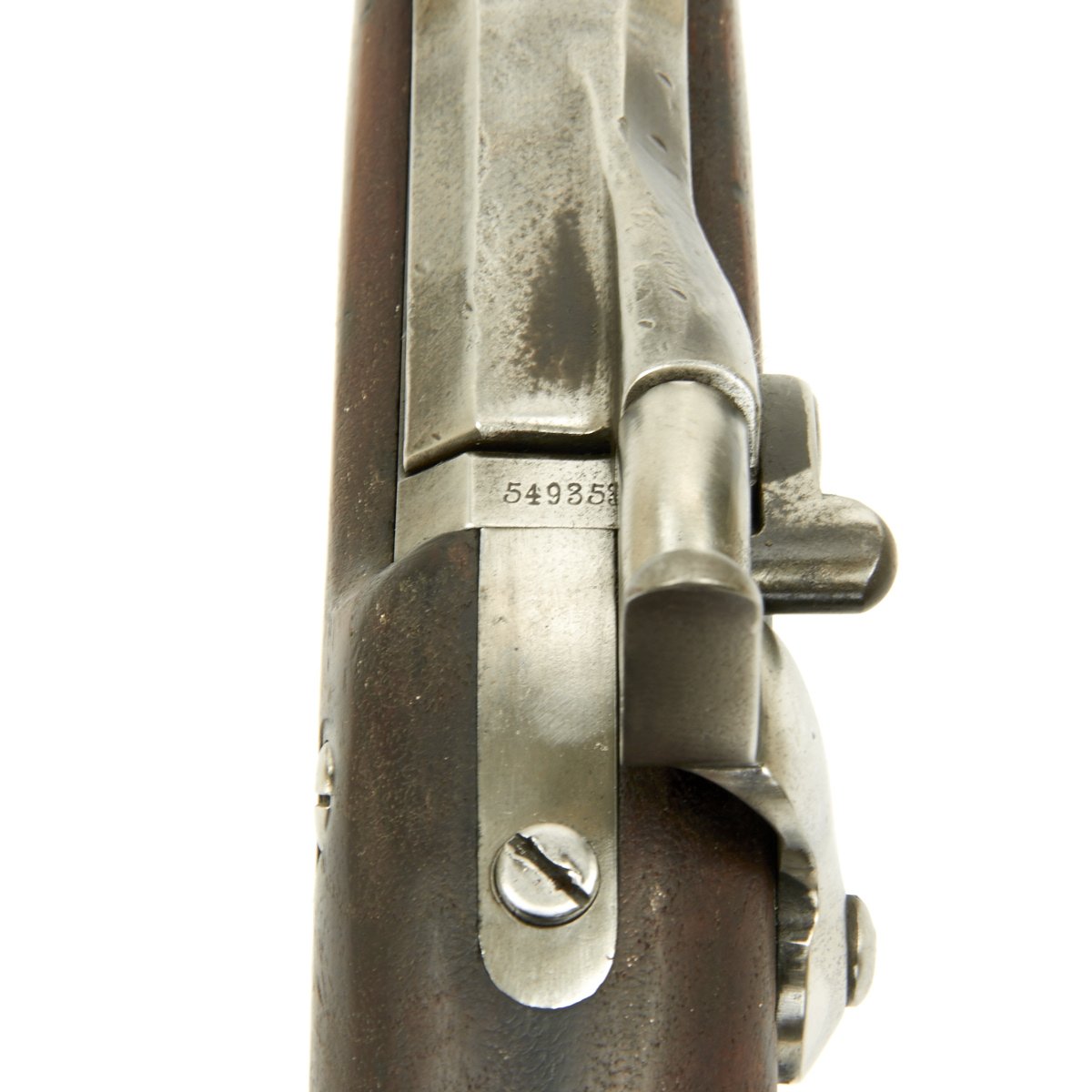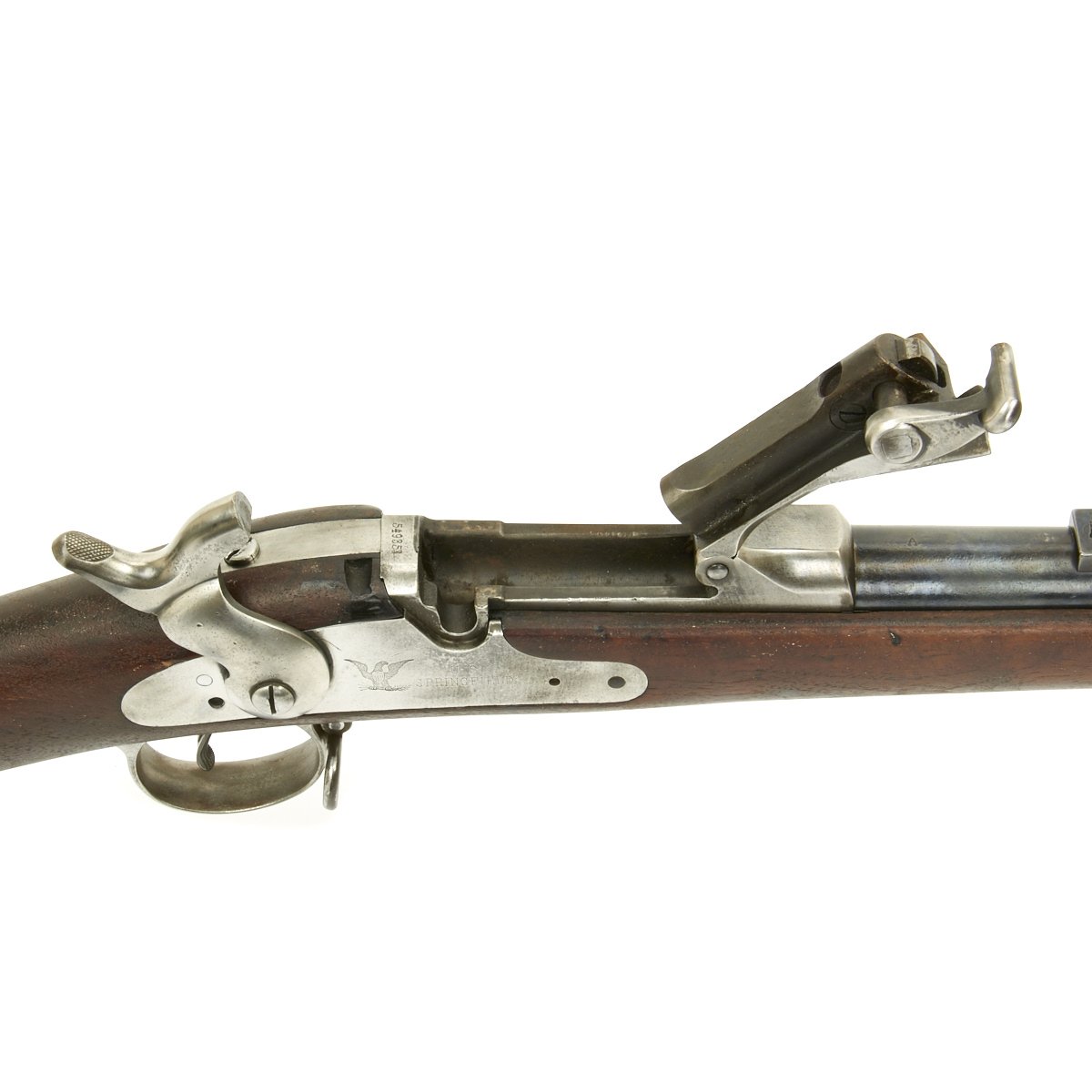 The rifle features an nice un-sanded stock with the edges still proud over the lock plate. Center fire breechloader, .45 cal., two bands, two sling swivels, Buffington sight, sliding ramrod bayonet. Lock is marked with an eagle and U.S. SPRINGFIELD manufactured by Springfield Armory, Springfield Massachusetts.