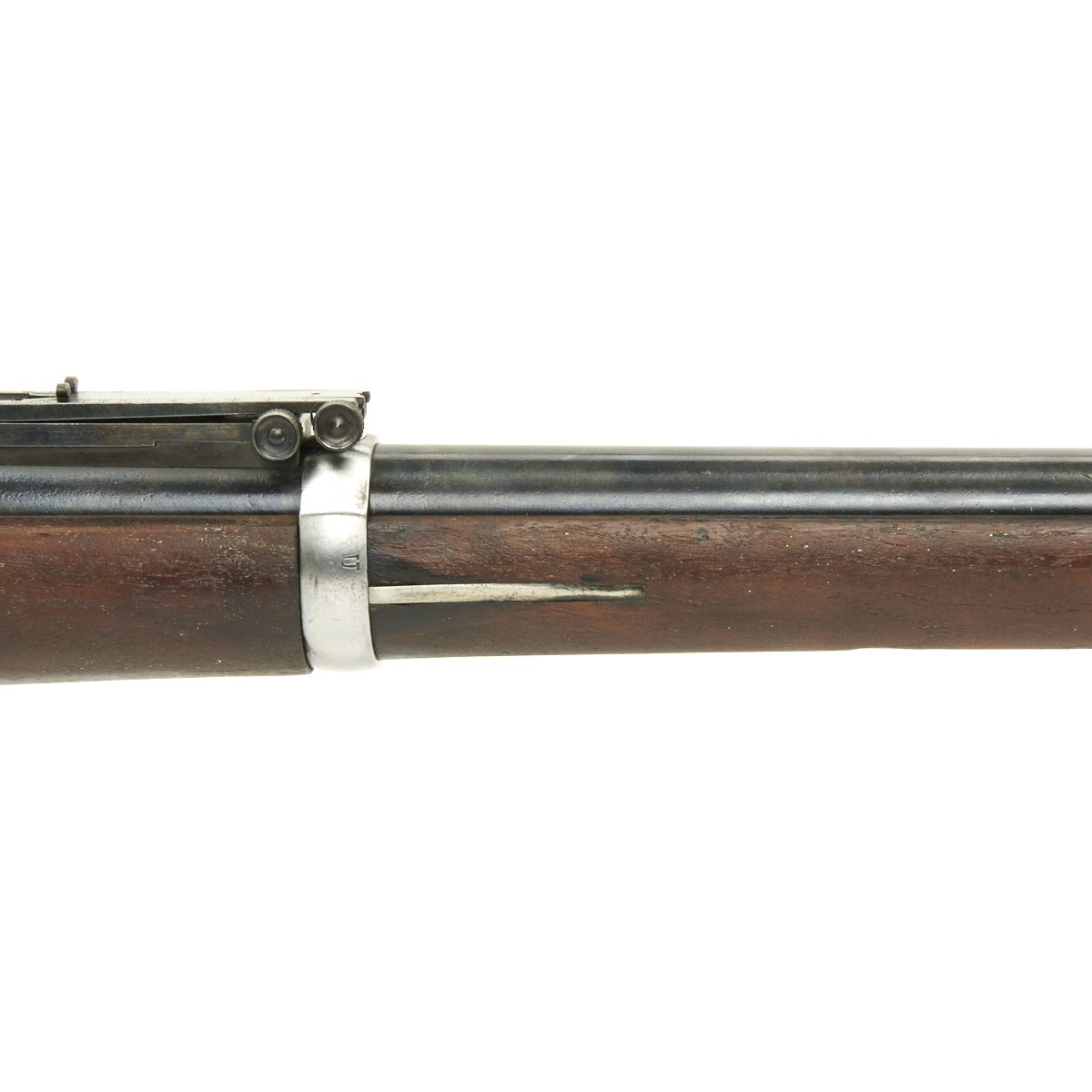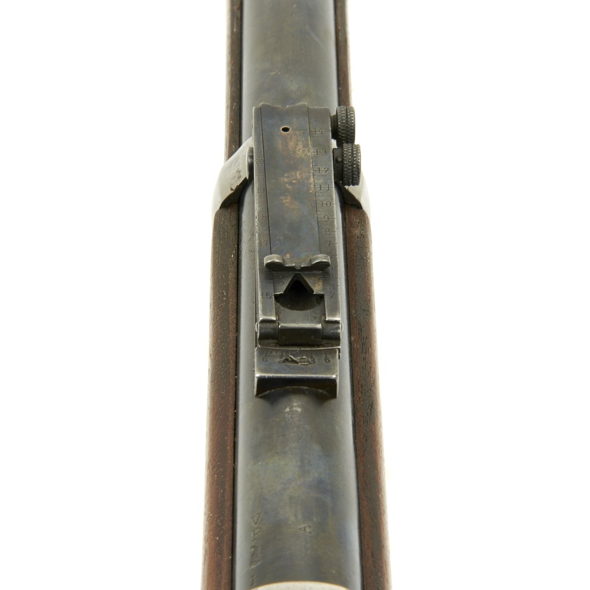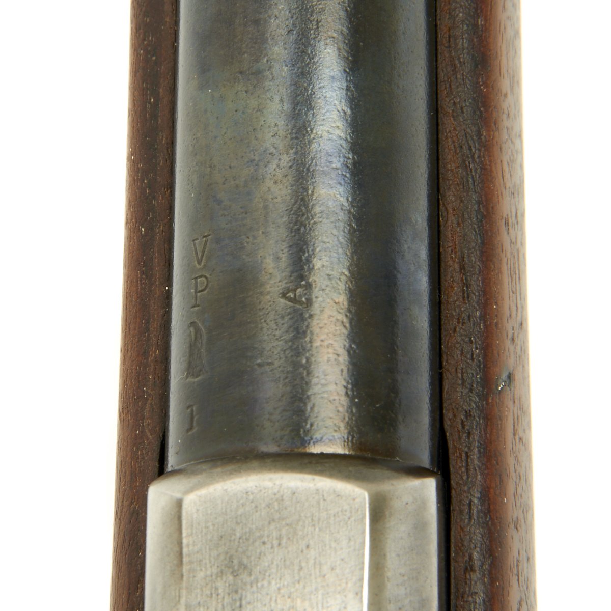 The elegant script SWP belongs to Samuel W. Porter, who was the Master Armorer and Chief Inspector of Springfield Armory from 15 September 1879 to 18 June 1894. Additional marks of interest include inspectors' and proof marks around the breech end of the barrel: a V over a P over an eagle's head over another P on the left side just above the stock. The upper right corner of the Buffington sight leaf is marked R to indicate that the sight graduations are for a rifle and not a carbine.