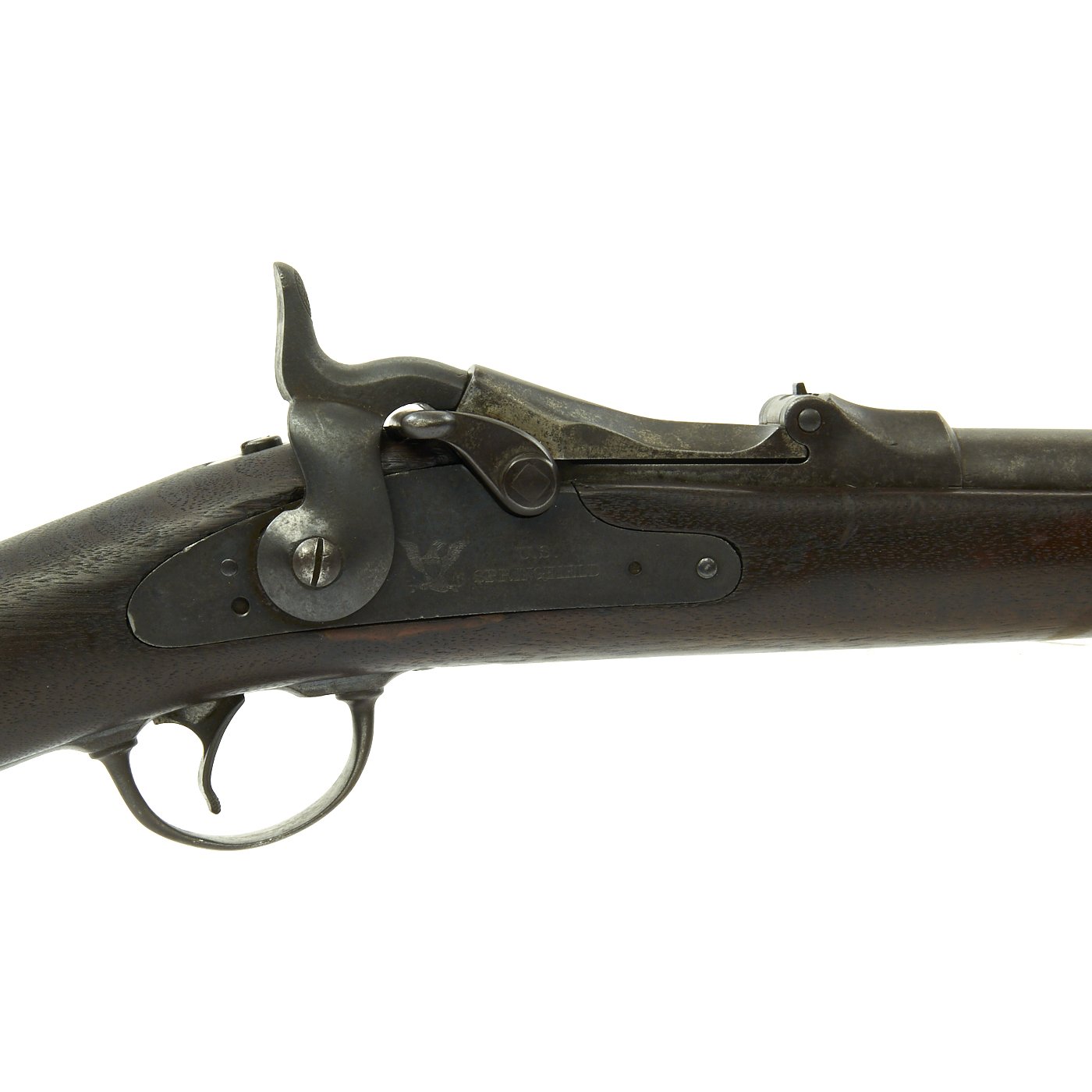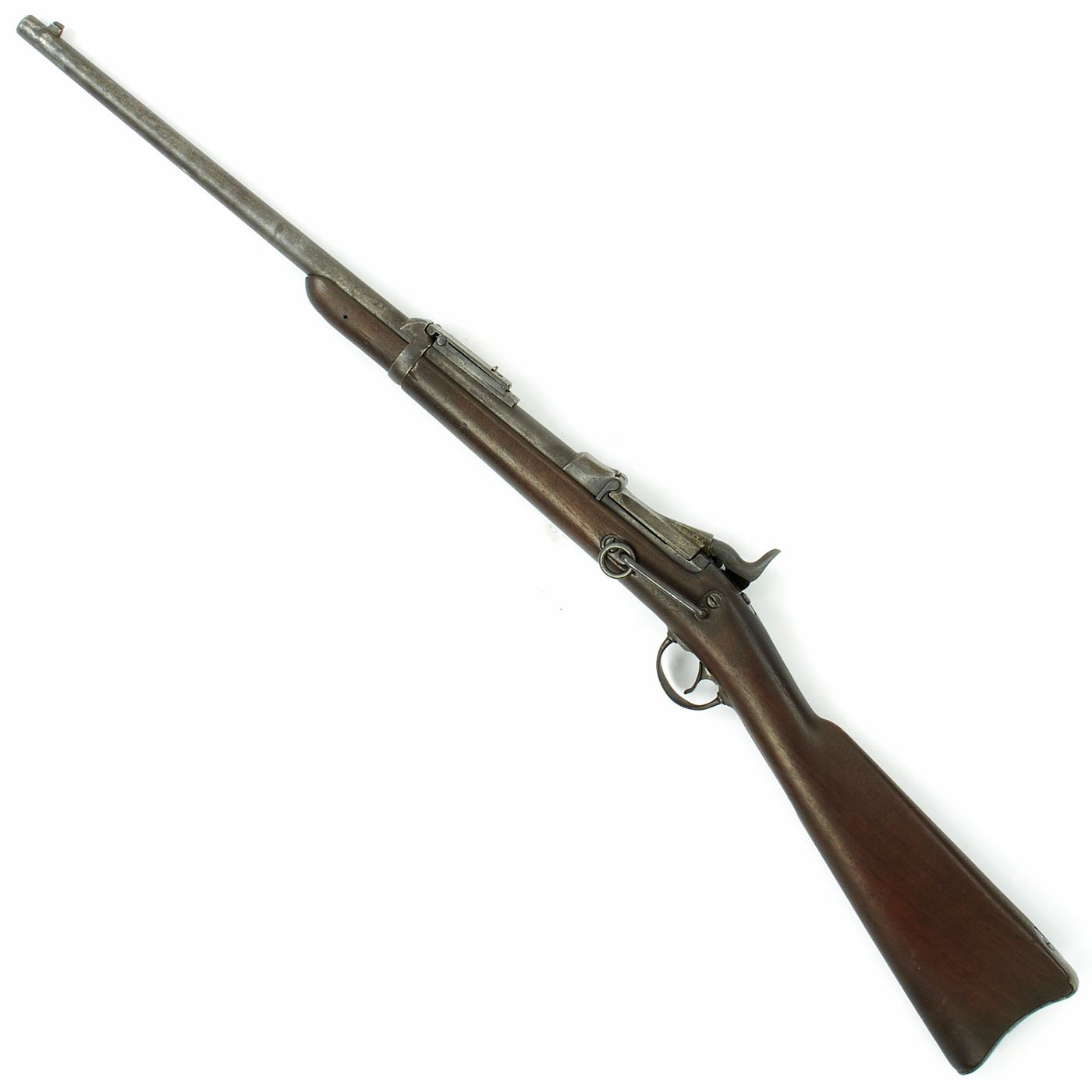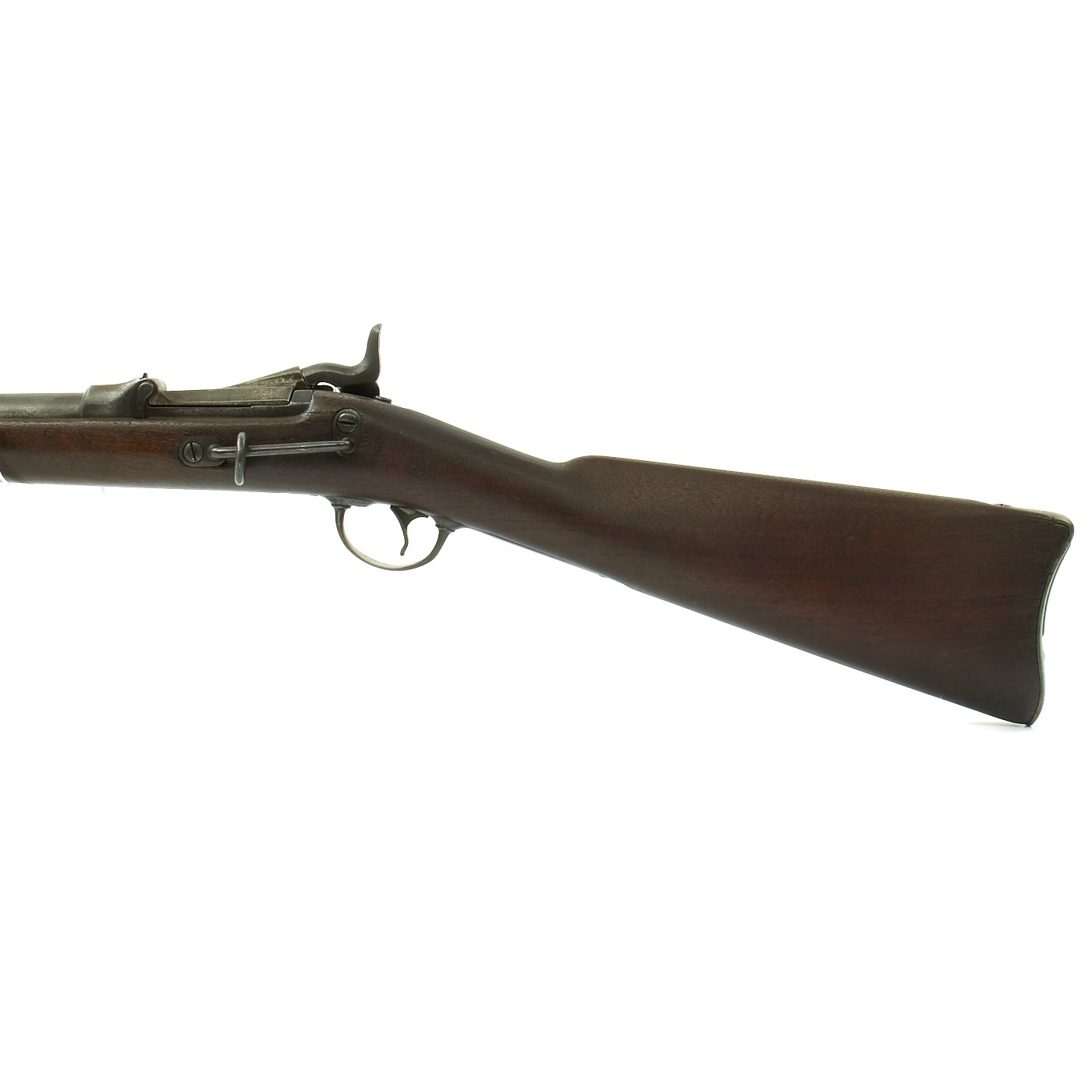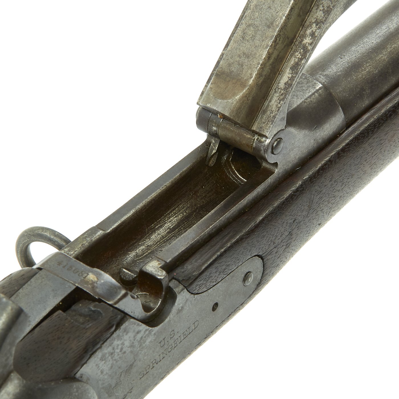 The butt plate is marked U.S. though the front band/guard is unmarked. Metal finish is quite good, with the original blue fading to plum, and some rust speckling. Center fire breechloader, .45 cal., single band, saddle-ring on sliding bar, and carbine Buffington sight. Lock is marked with an eagle and U.S. / SPRINGFIELD, manufactured by Springfield Armory, Springfield Massachusetts.