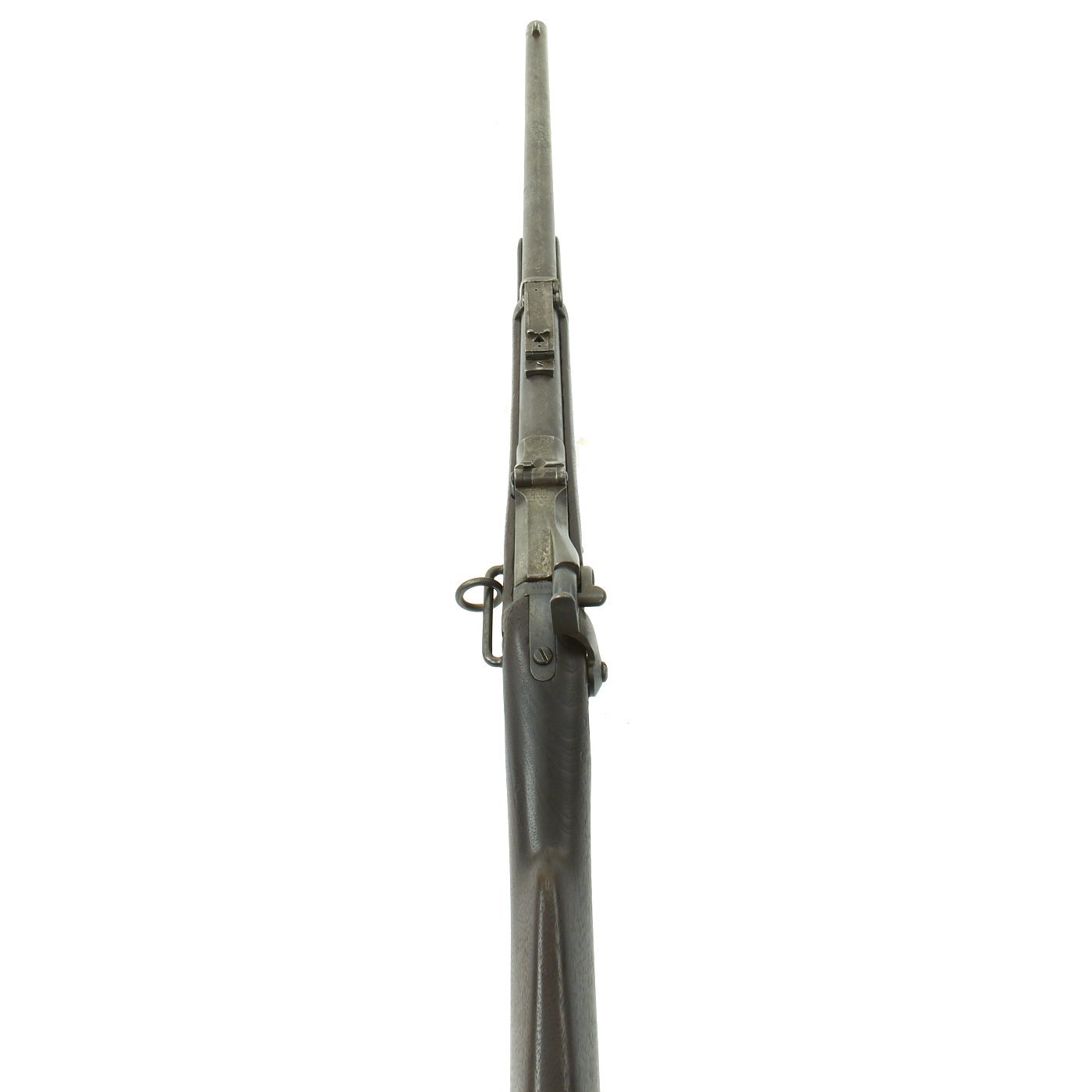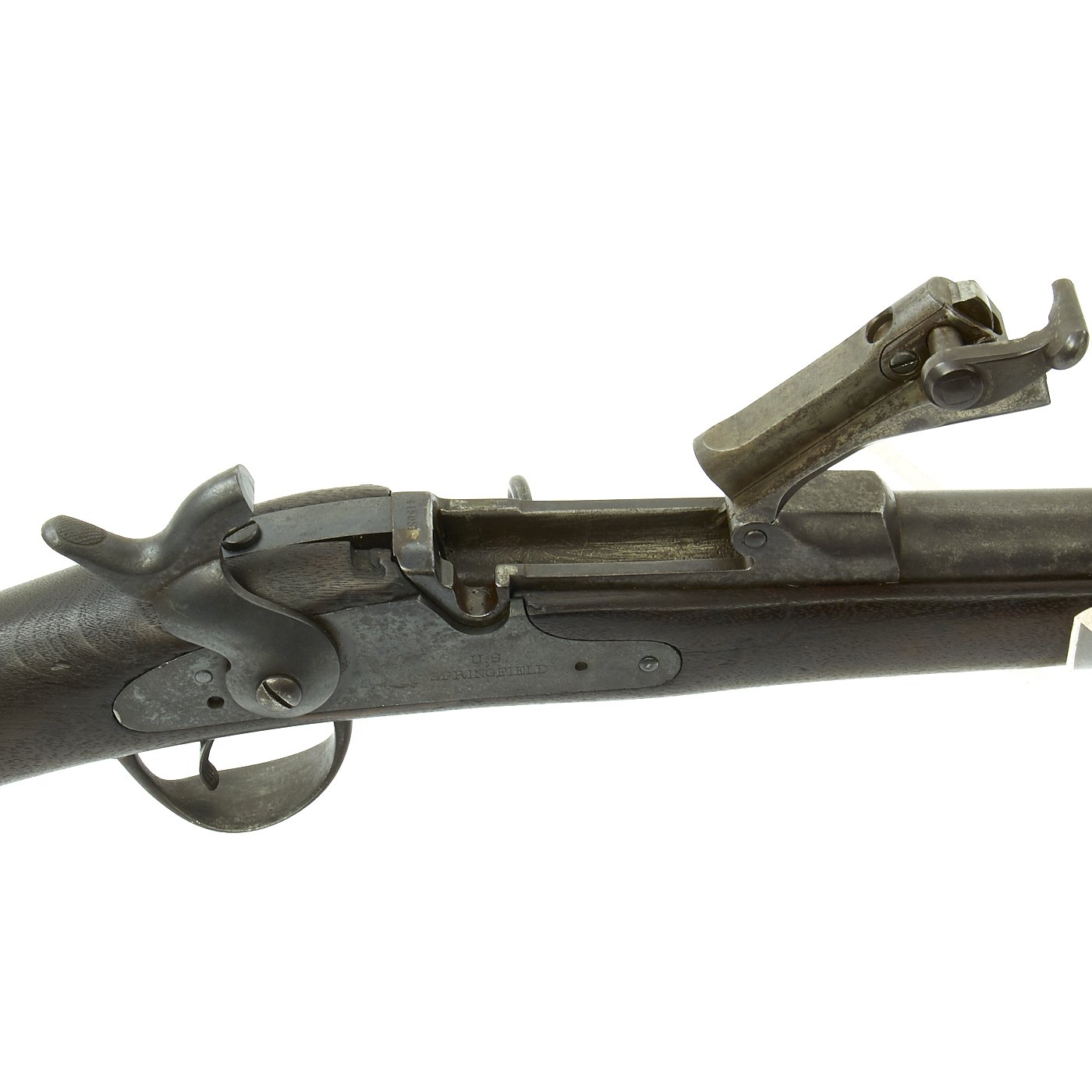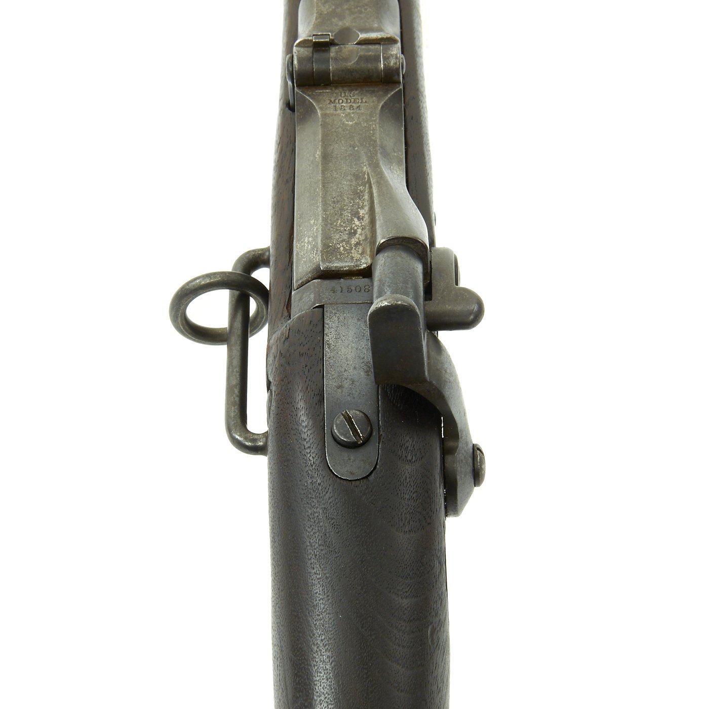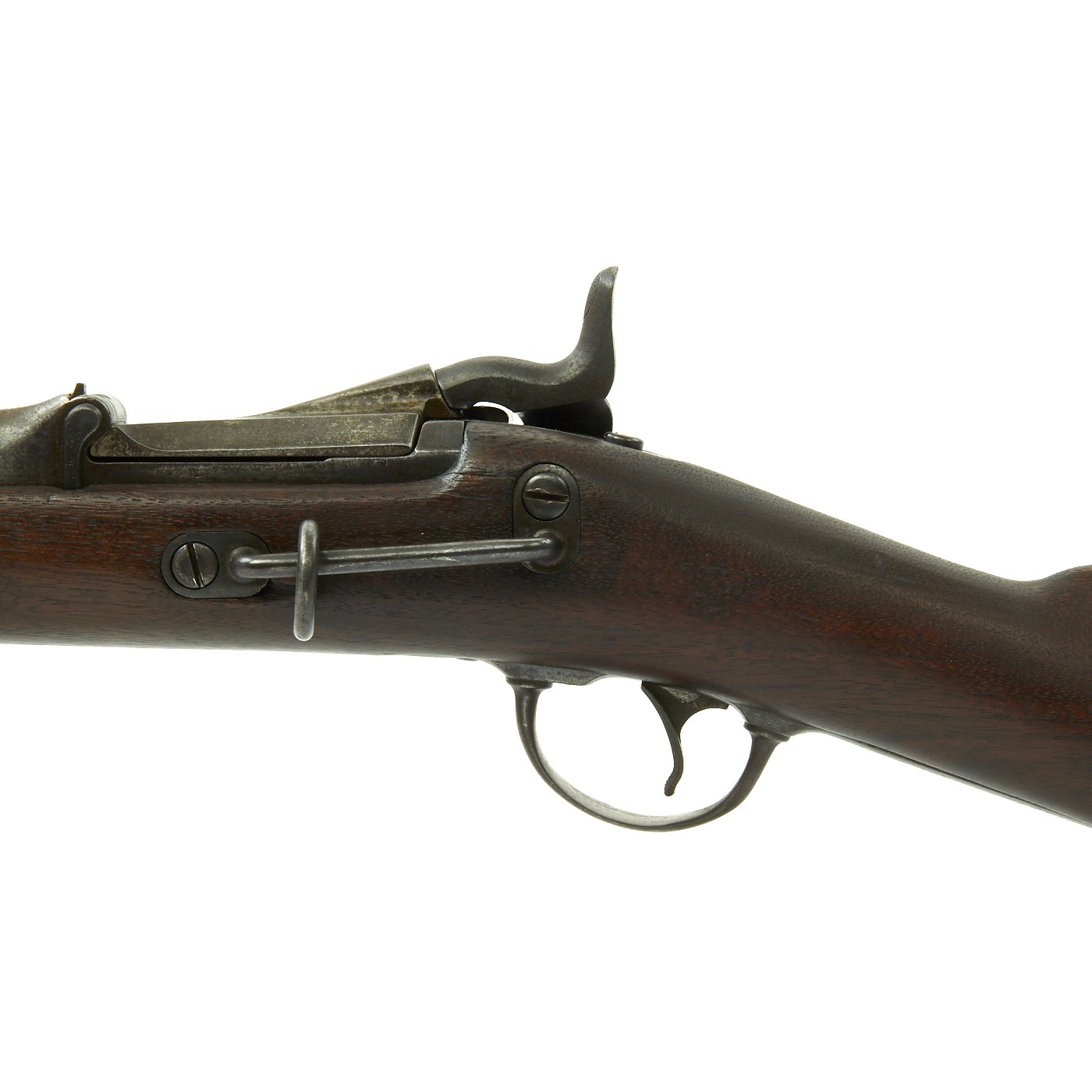 The butt plate is marked U.S. though the front band/guard is unmarked. Metal finish is quite good, with the original blue fading to plum, and some rust speckling. Center fire breechloader, .45 cal., single band, saddle-ring on sliding bar, and carbine Buffington sight. Lock is marked with an eagle and U.S. / SPRINGFIELD, manufactured by Springfield Armory, Springfield Massachusetts.