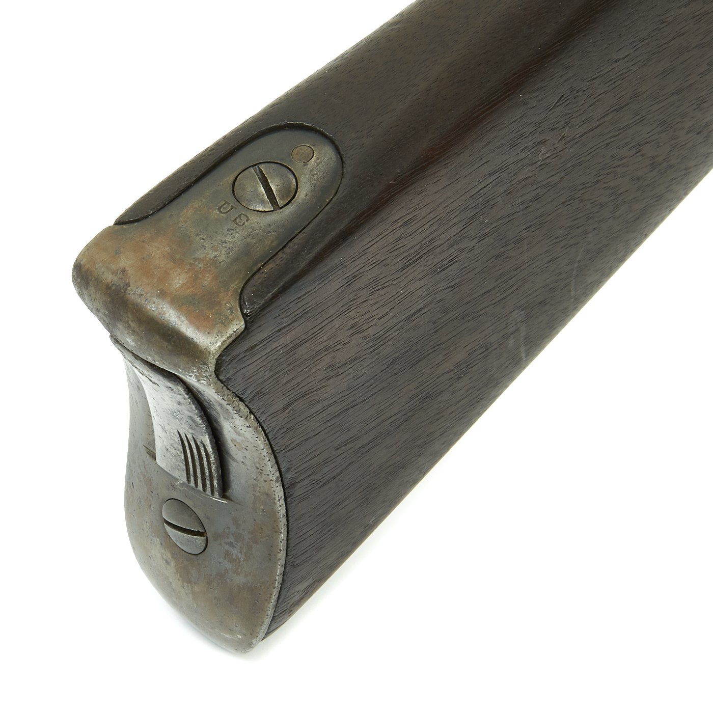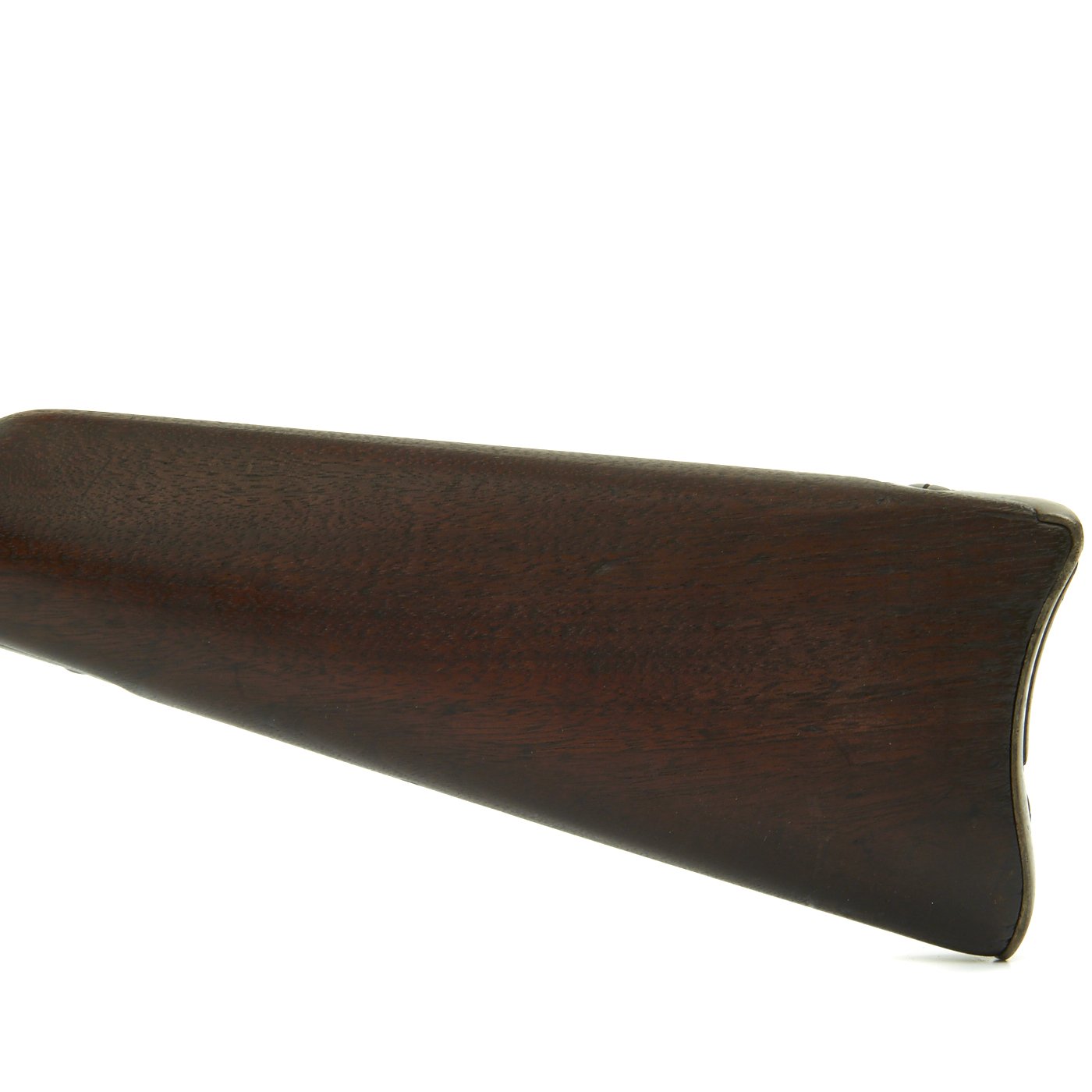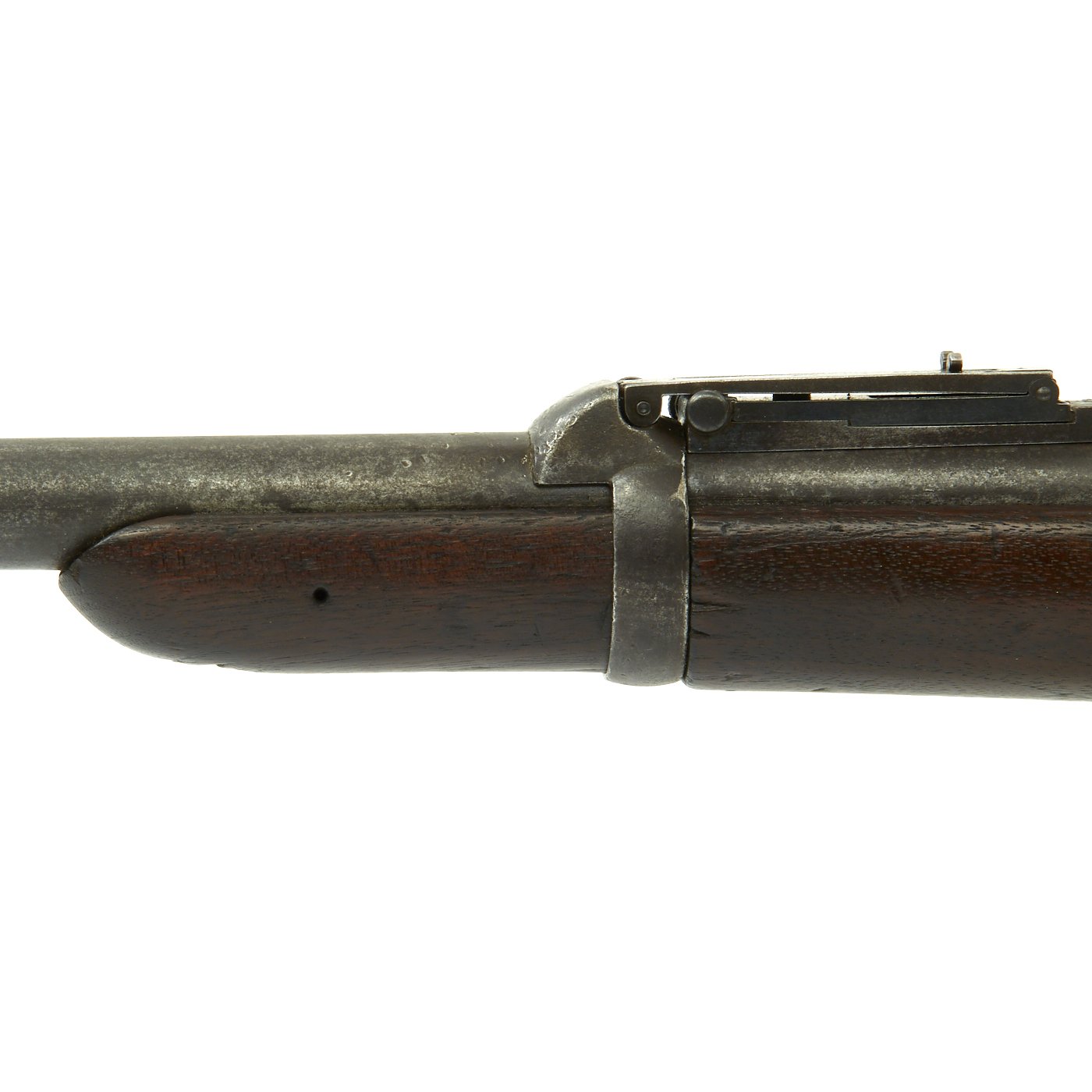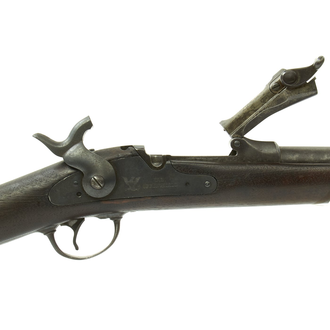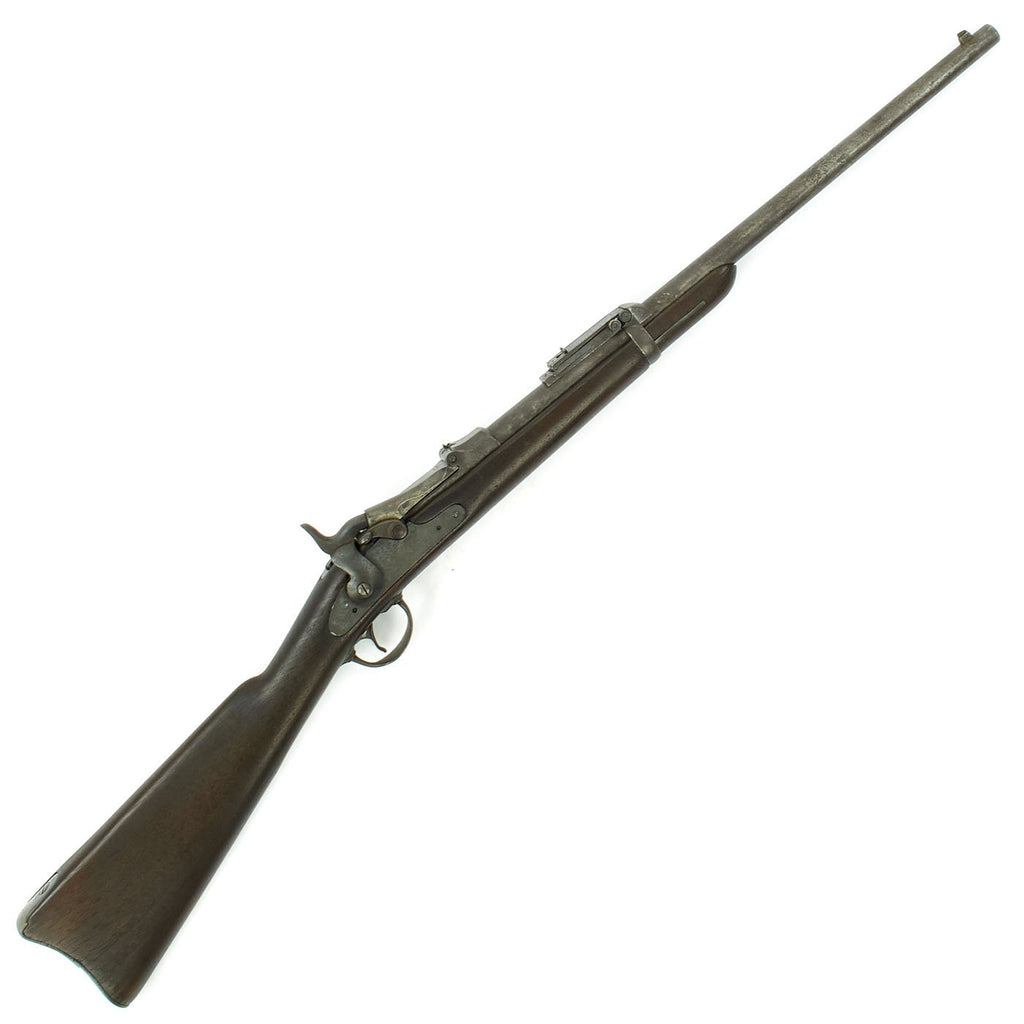 The butt plate is marked U.S. though the front band/guard is unmarked. Metal finish is quite good, with the original blue fading to plum, and some rust speckling. Center fire breechloader, .45 cal., single band, saddle-ring on sliding bar, and carbine Buffington sight. Lock is marked with an eagle and U.S. / SPRINGFIELD, manufactured by Springfield Armory, Springfield Massachusetts.