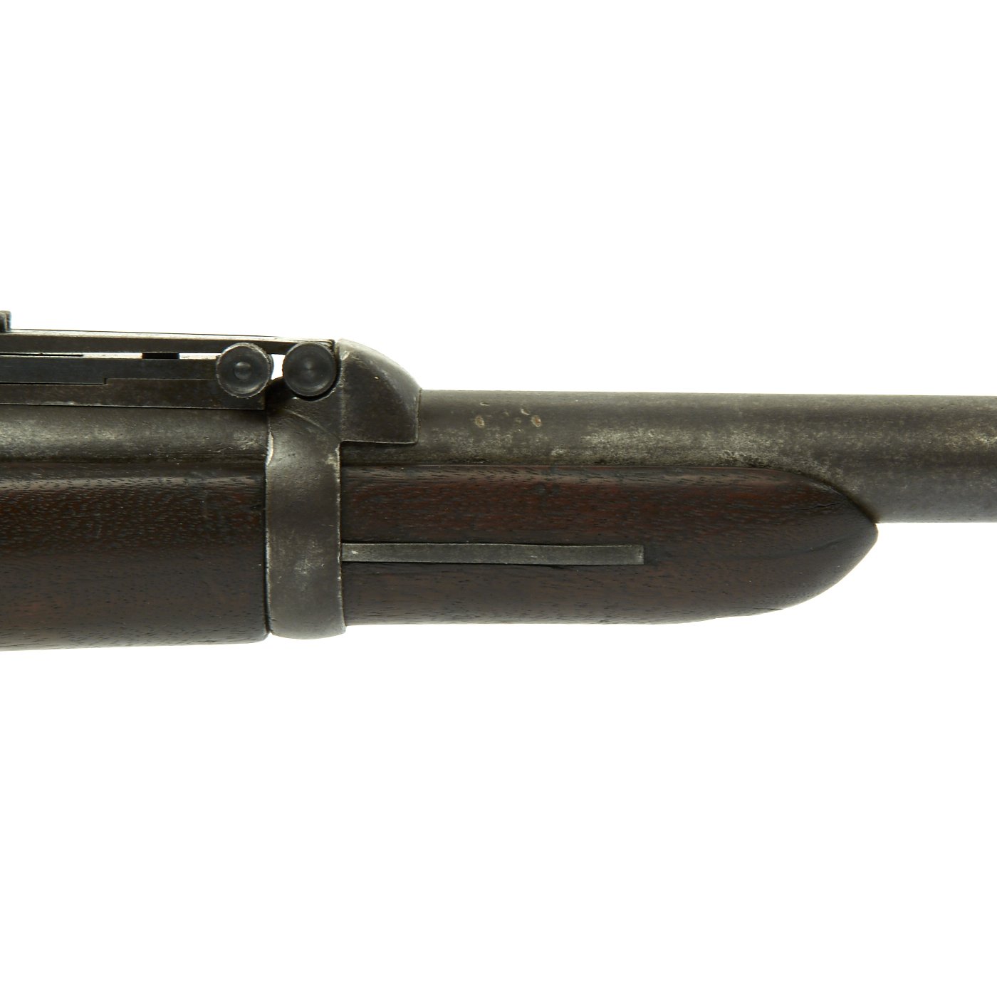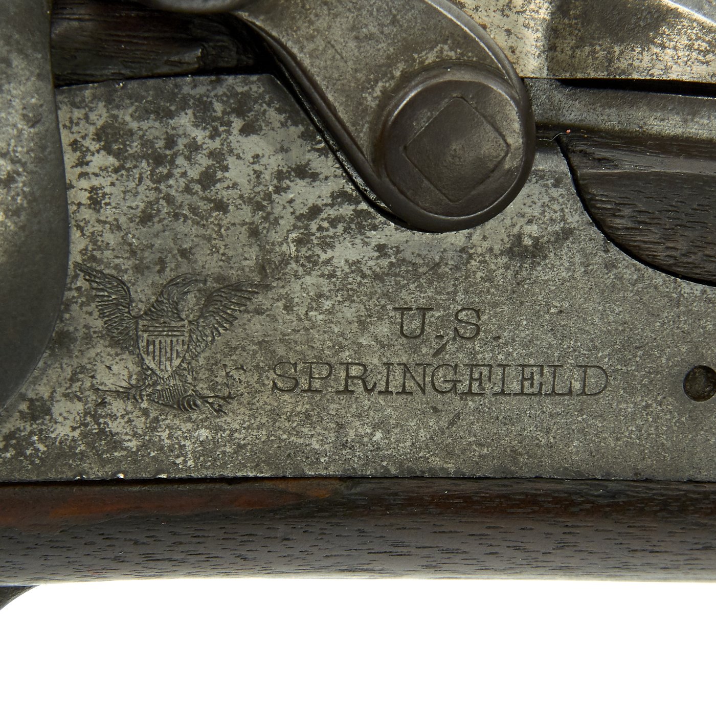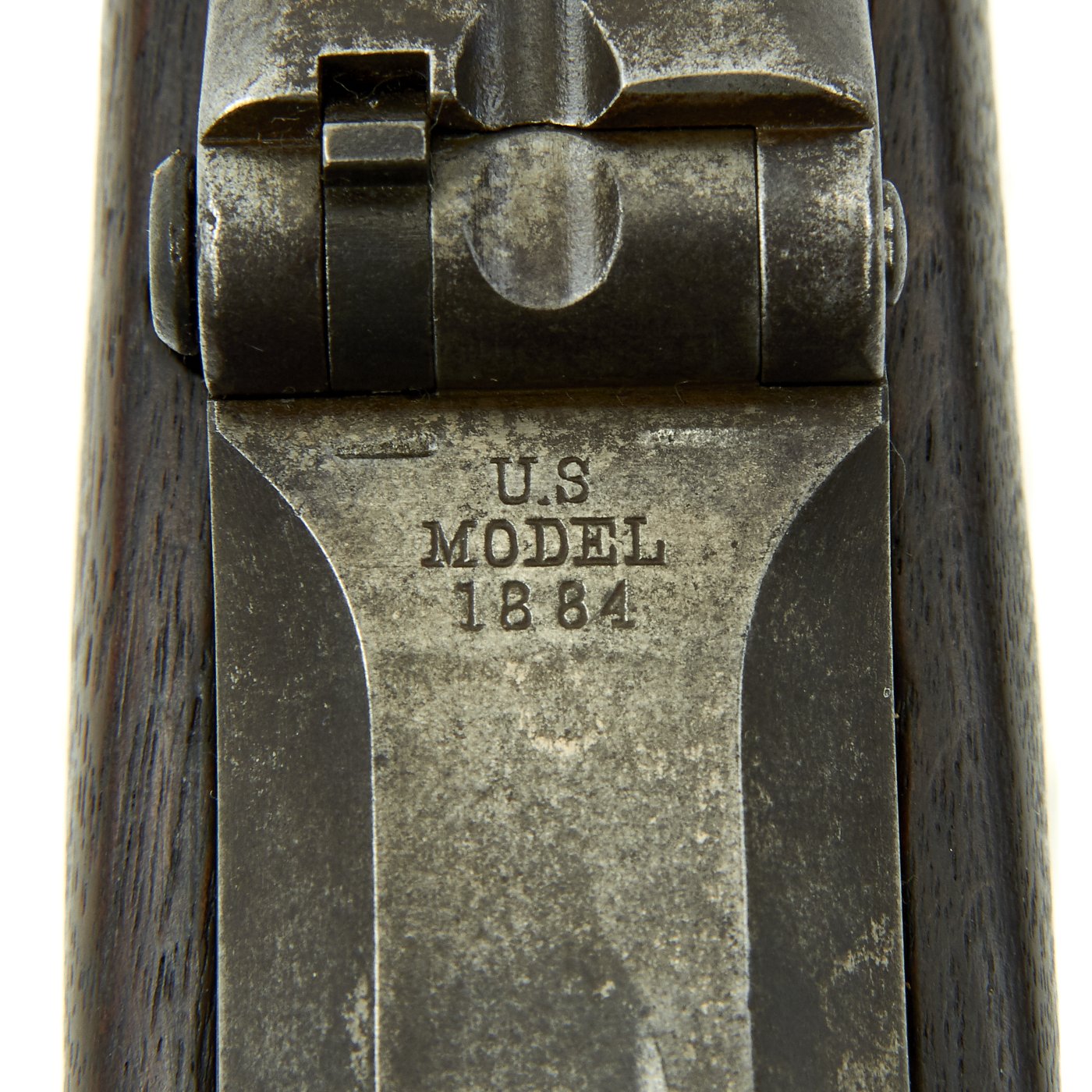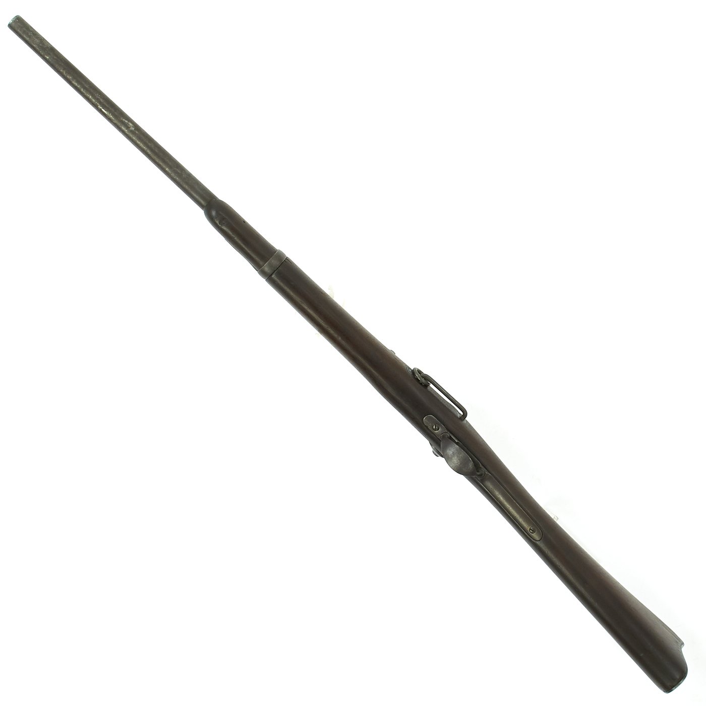 The butt plate is marked U.S. though the front band/guard is unmarked. Metal finish is quite good, with the original blue fading to plum, and some rust speckling. Center fire breechloader, .45 cal., single band, saddle-ring on sliding bar, and carbine Buffington sight. Lock is marked with an eagle and U.S. / SPRINGFIELD, manufactured by Springfield Armory, Springfield Massachusetts.