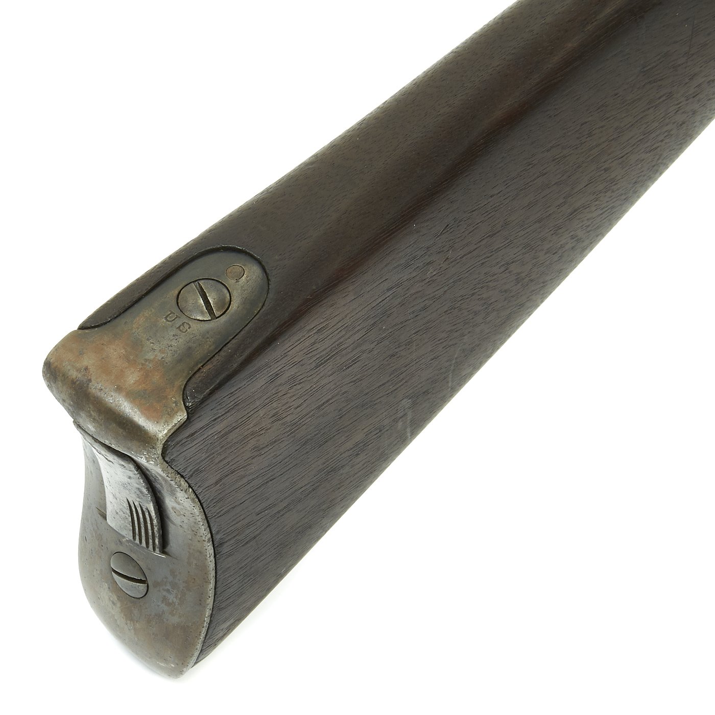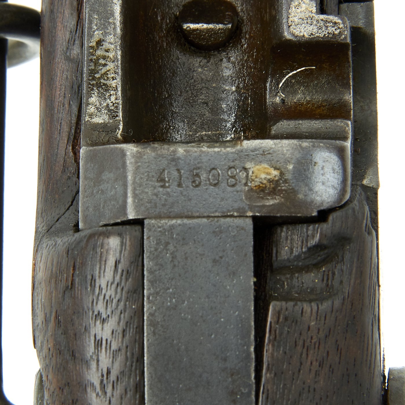 The serial # 415081 indicates production in 1888, and there is a faded Inspector's Cartouche on the left side, of the stock, though it is not legible. The stock is in good original condition, with the expected wear from age and service. It is somewhat proud over the lock plate, so the stock has not been sanded down much. The bore is in good condition, showing clear lands and grooves, however there is also fouling, so the finish is grayish.